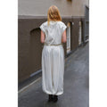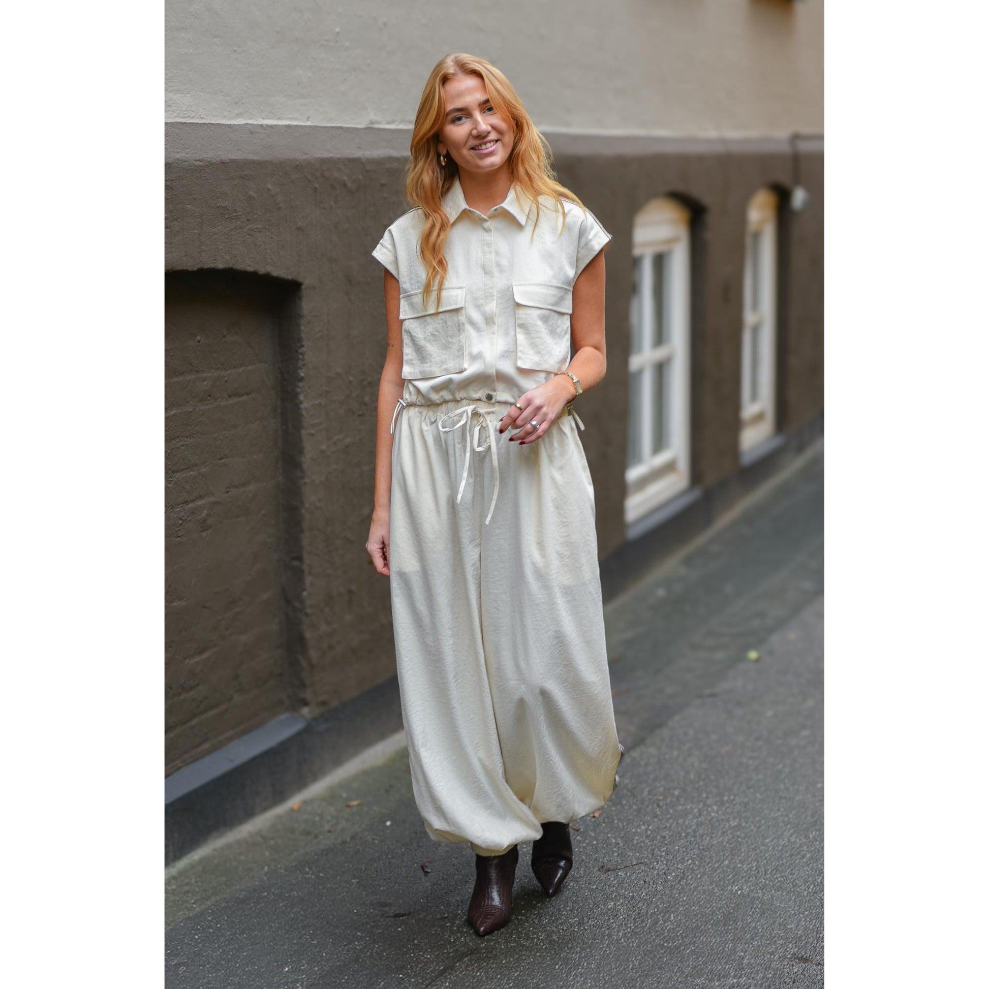 Ekstrem store og brede ballon bukser med elastik i taljen samt ved fødderne. Den er meget lys sand, næsten goffwhite med en brun stribe ned af benet. Hvis man ikke er til de er så store og brede, anbefaler vi, at man sagtens kan gå to størrelser ned.
