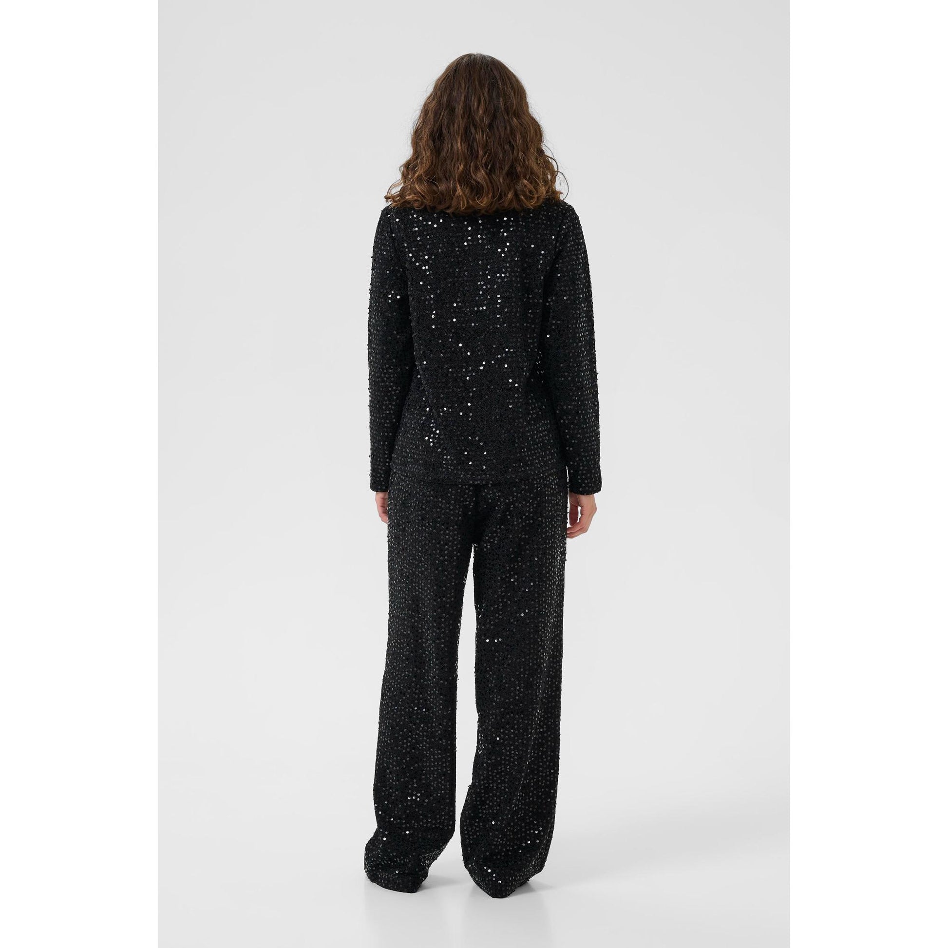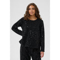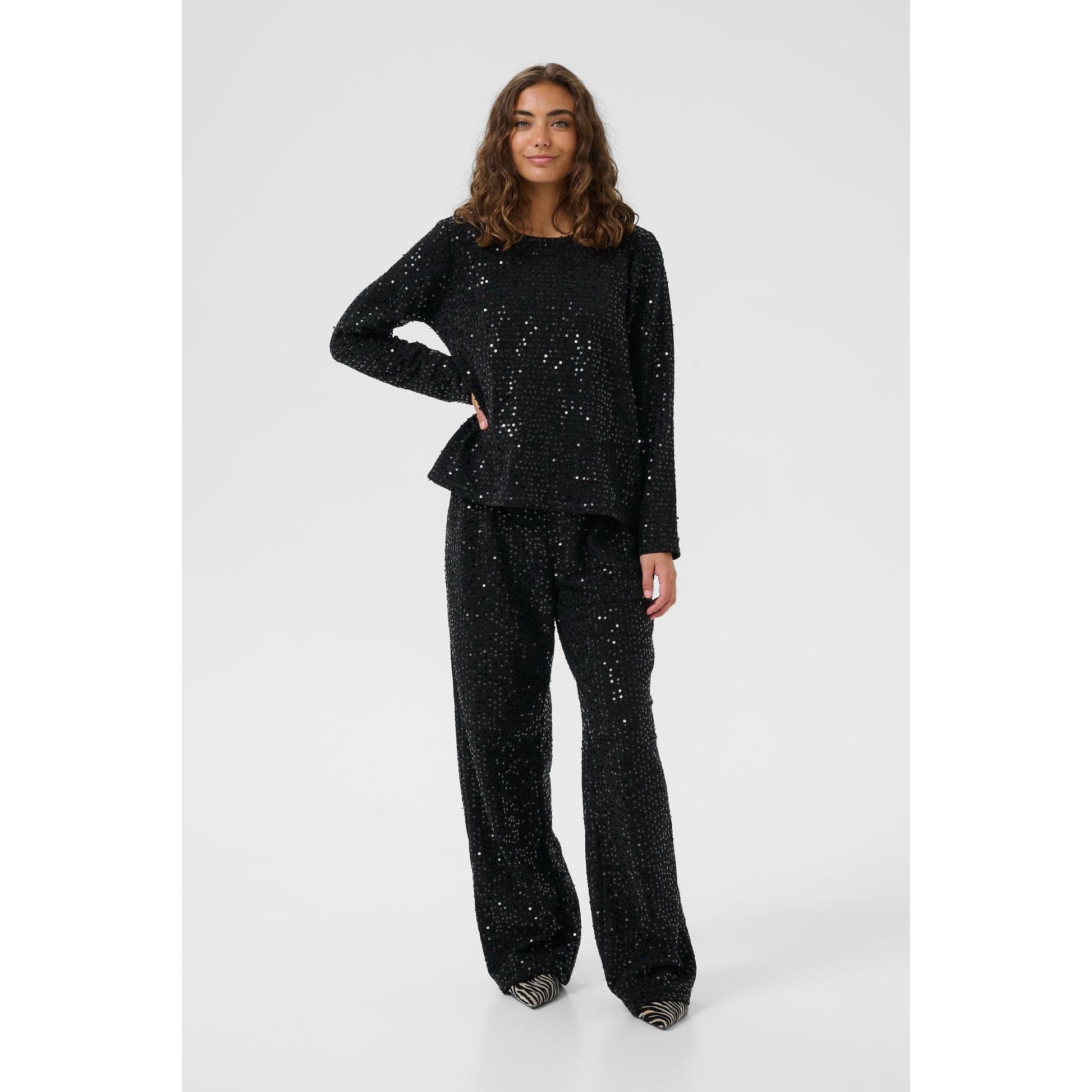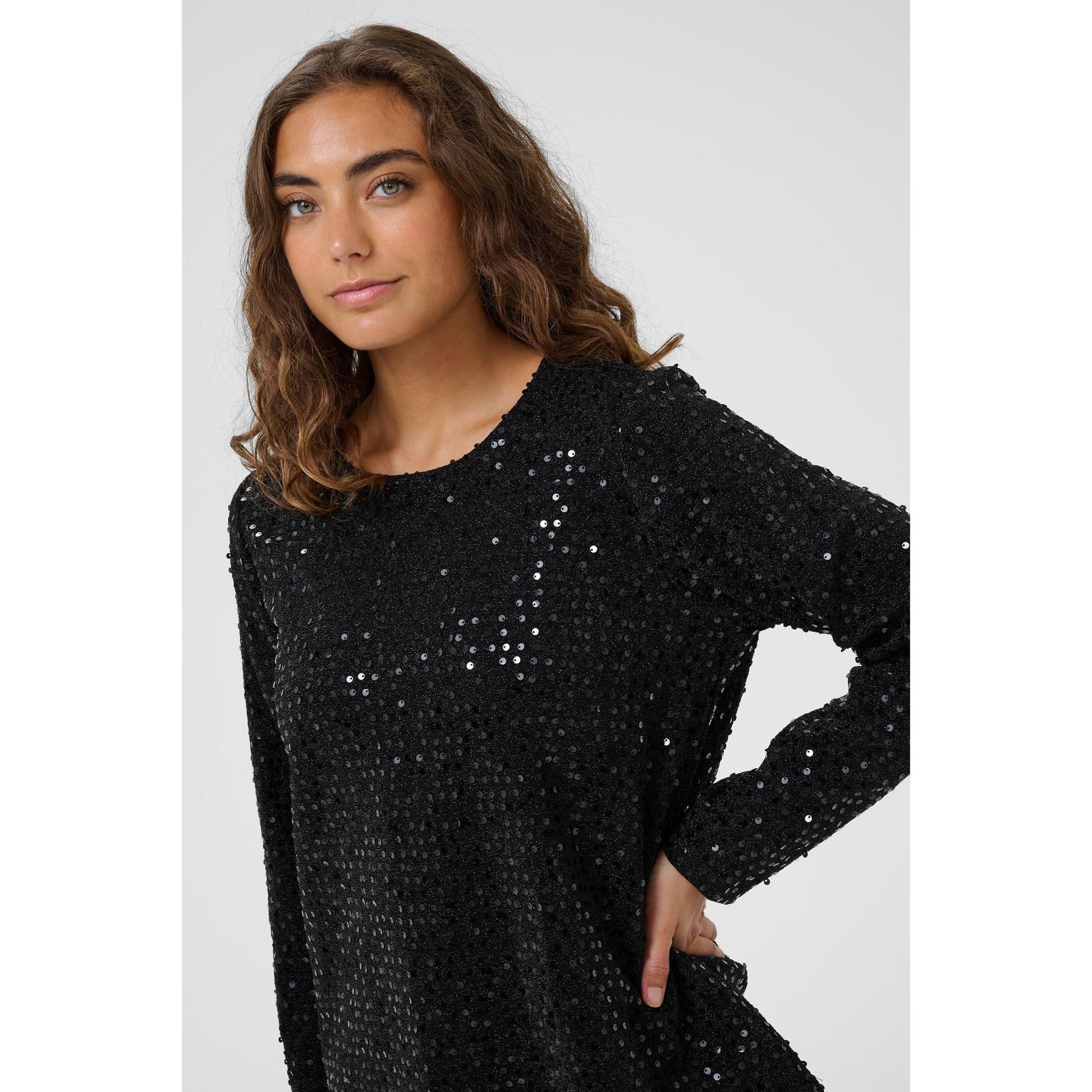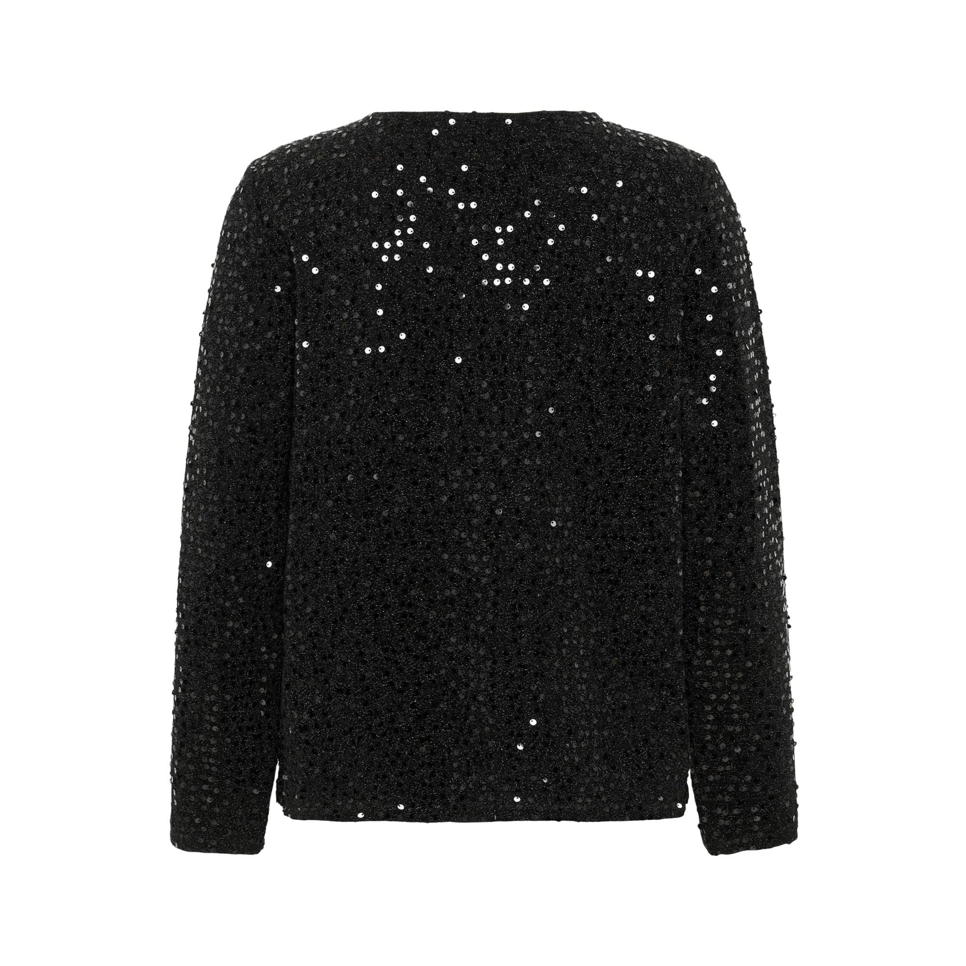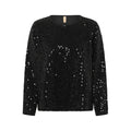 Sød sort paliett bluse t-shirt med rund hals samt med lange ærmer. Den har et lige snit. Blusen har ikke foer. Den er almindelig i størrelsen. Den har strech i metervaren, så den er skøn at have på.