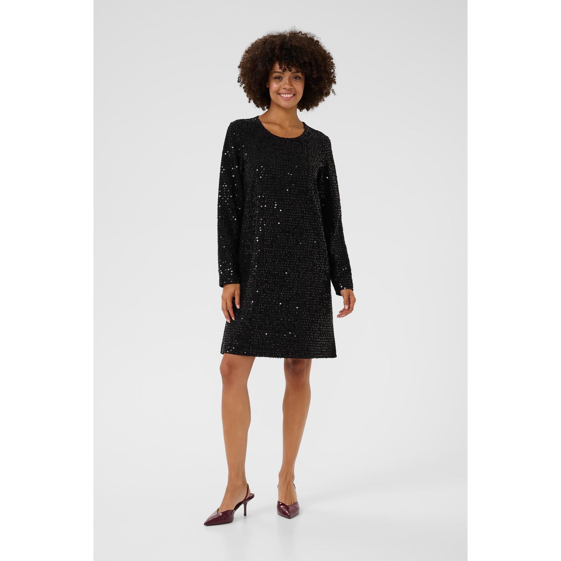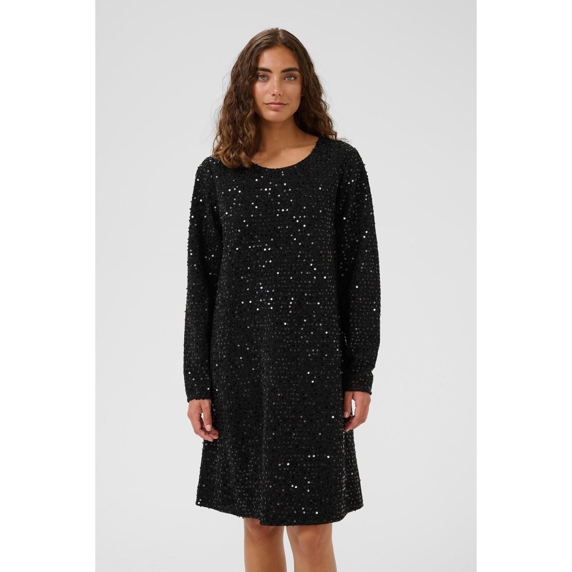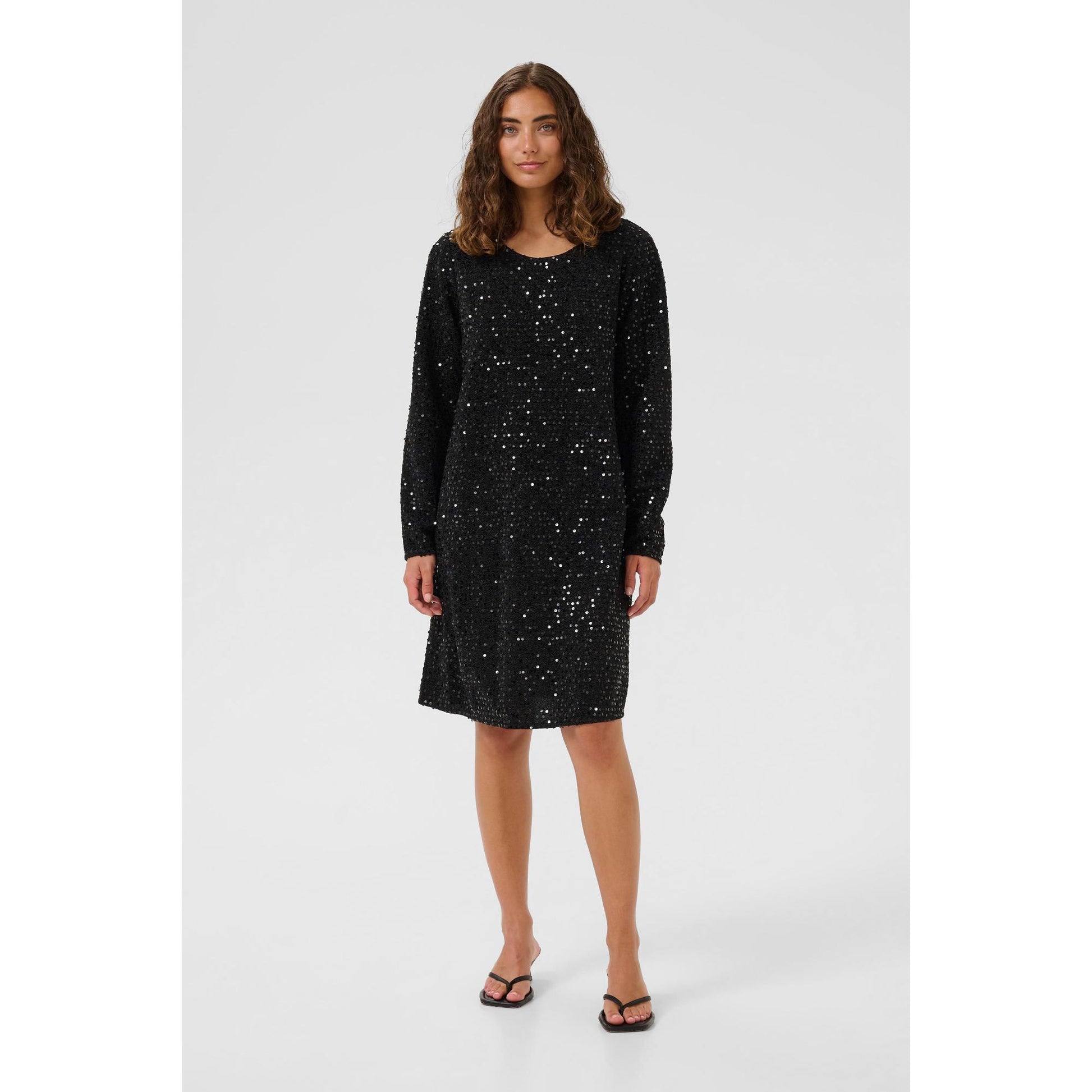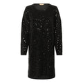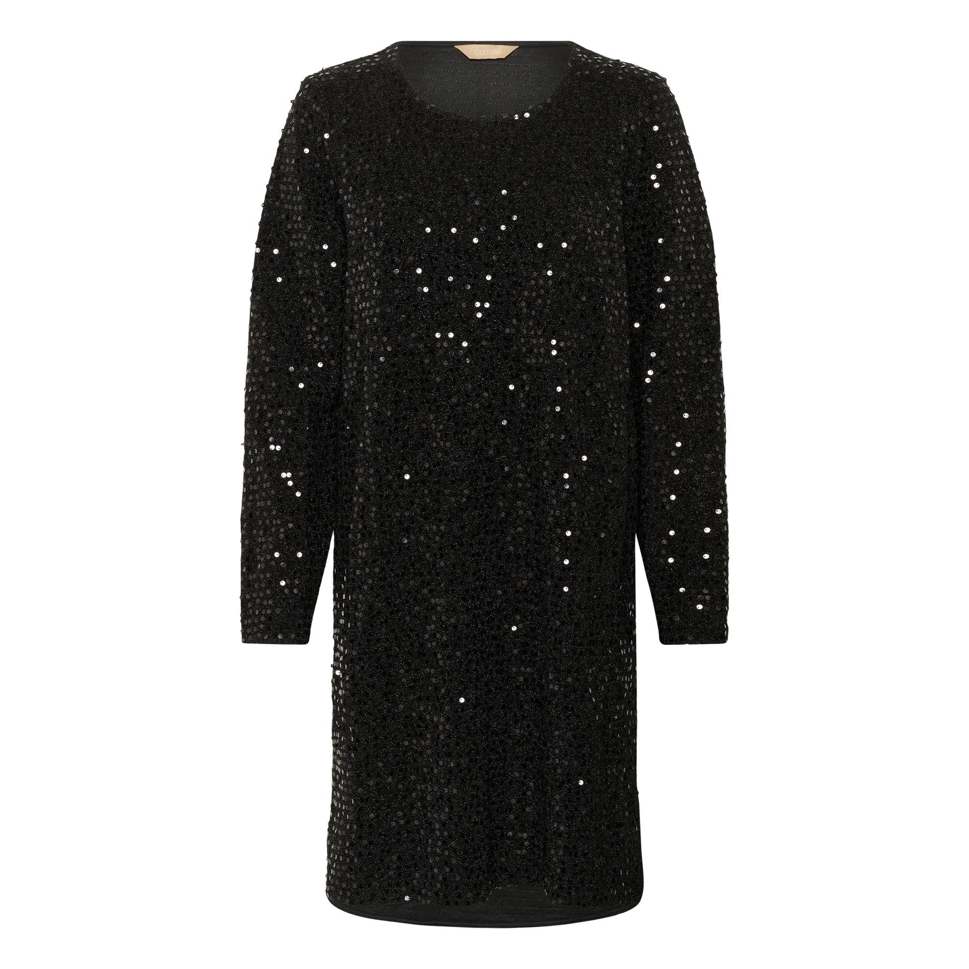 Sød sort paliett kjole med rund hals samt med lange ærmer. Den har et lige snit. Kjolen har ikke foer. Den er almindelig i størrelsen. Den har strech i metervaren, så den er skøn at have på.