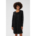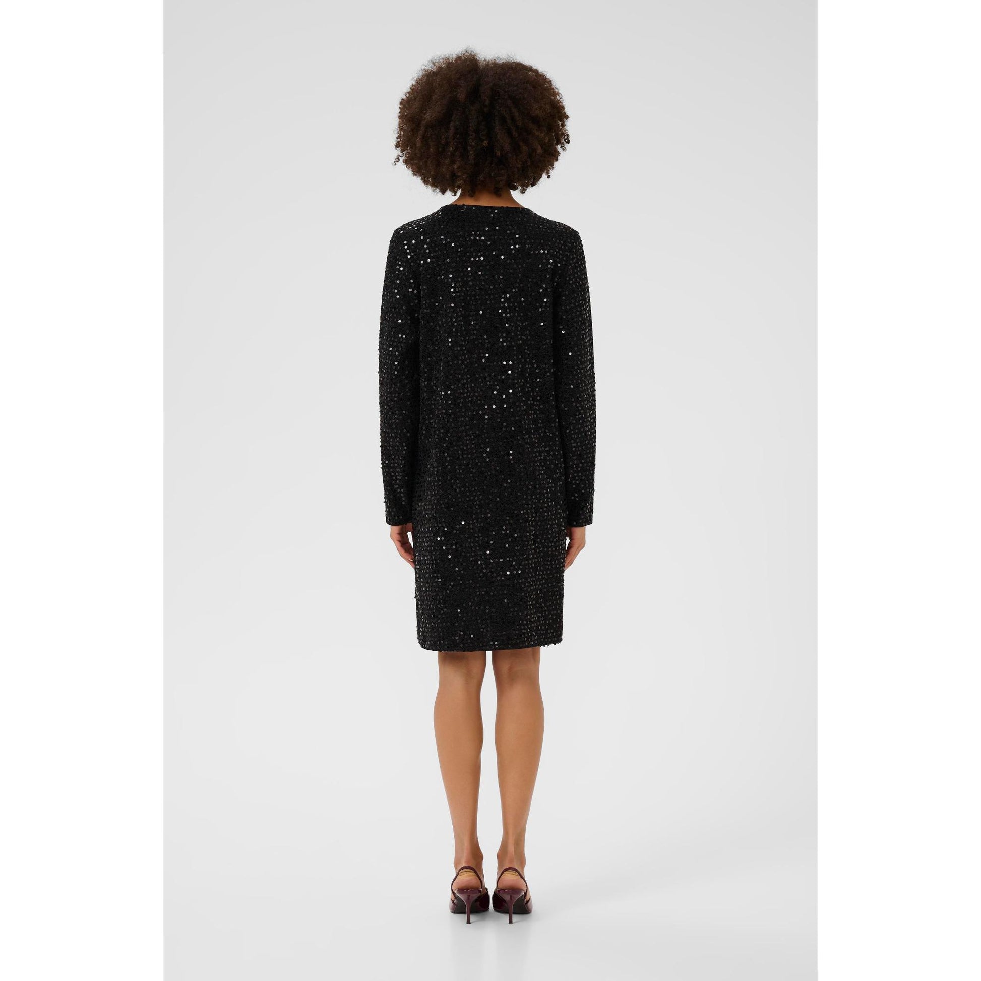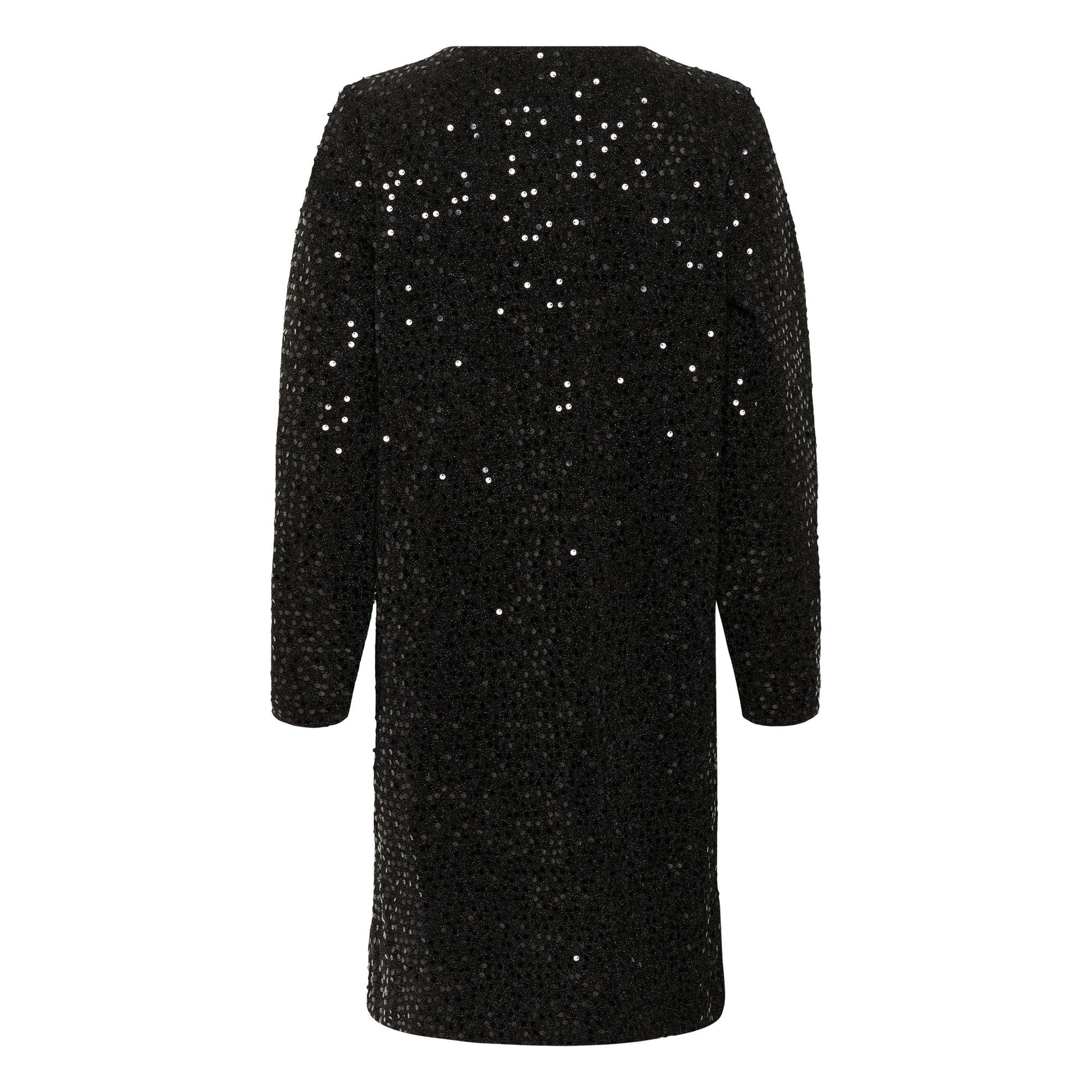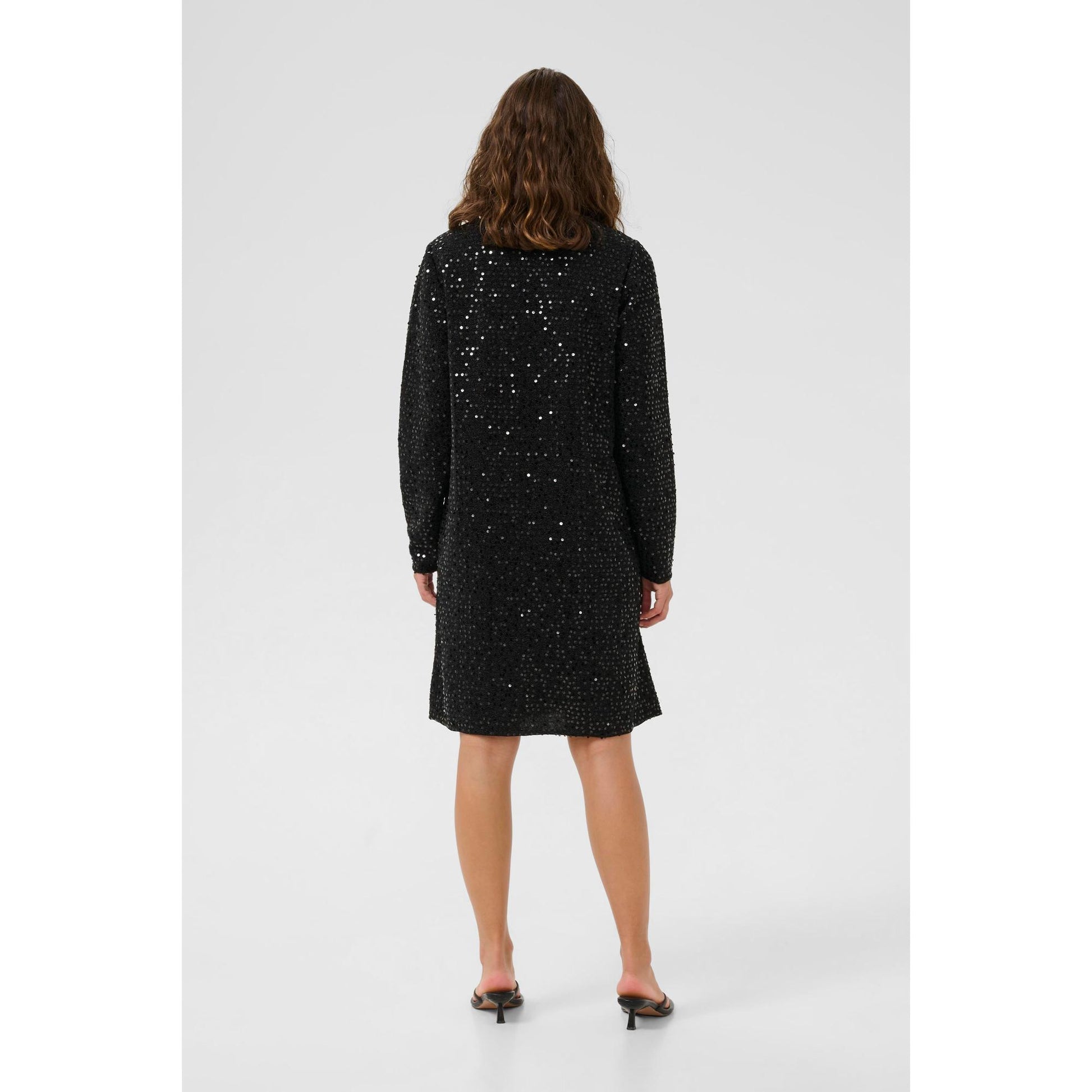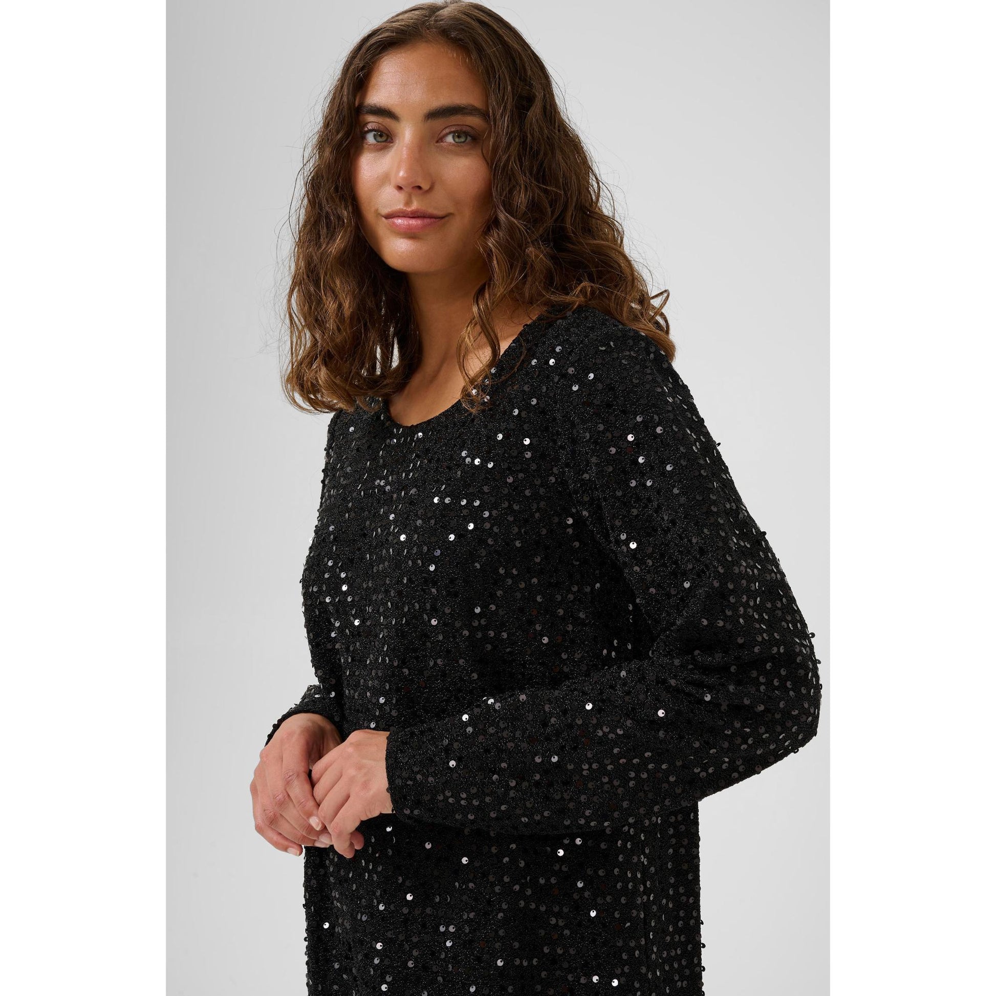 Sød sort paliett kjole med rund hals samt med lange ærmer. Den har et lige snit. Kjolen har ikke foer. Den er almindelig i størrelsen. Den har strech i metervaren, så den er skøn at have på.