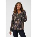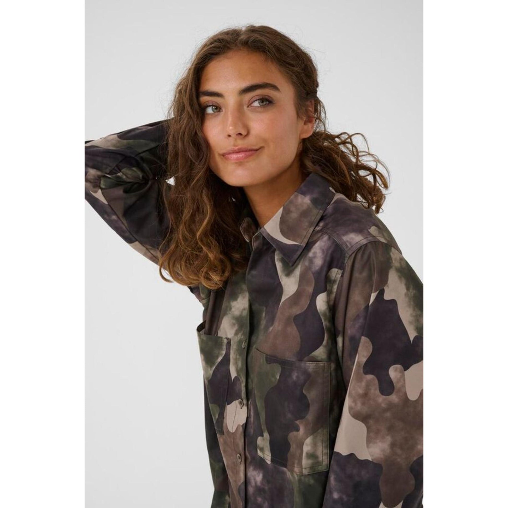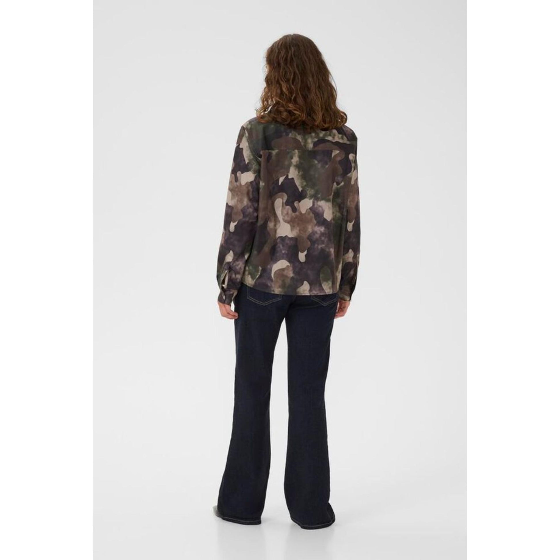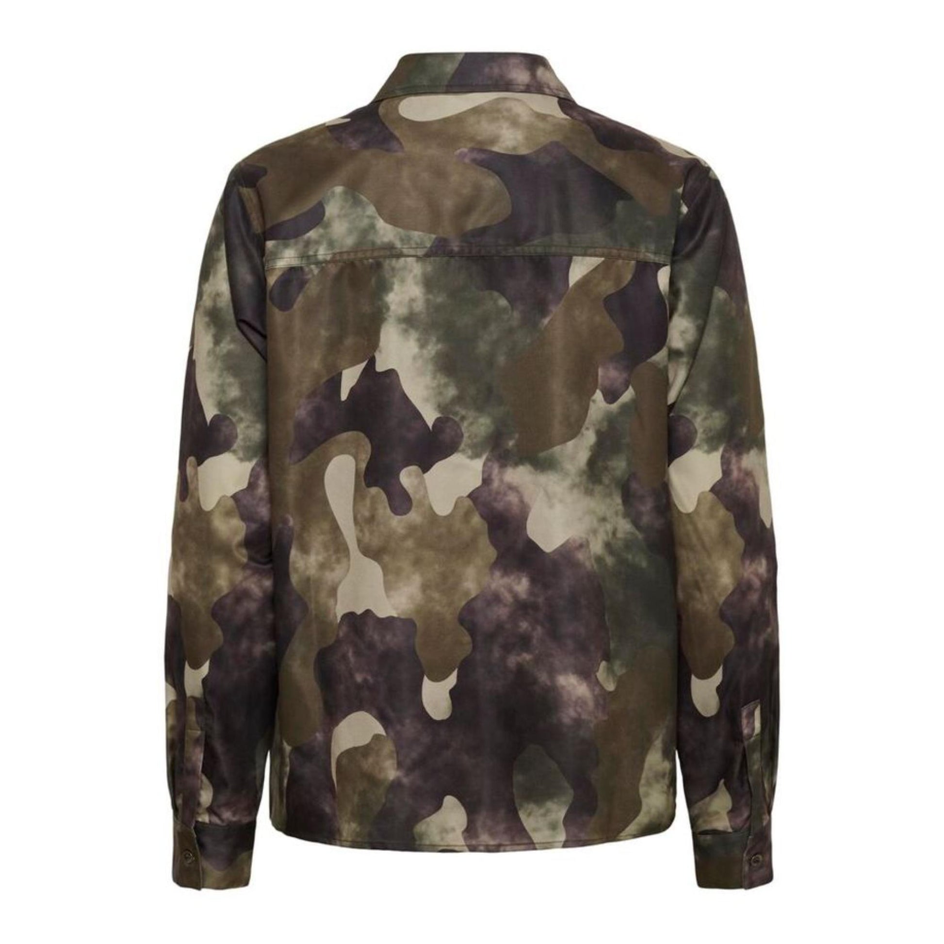 Lækker blød polyester skjorte med krave ved halsen. Den kan ligeledes bruges åben som en cardigan. Blusen har v-hals samt en brystlomme.
