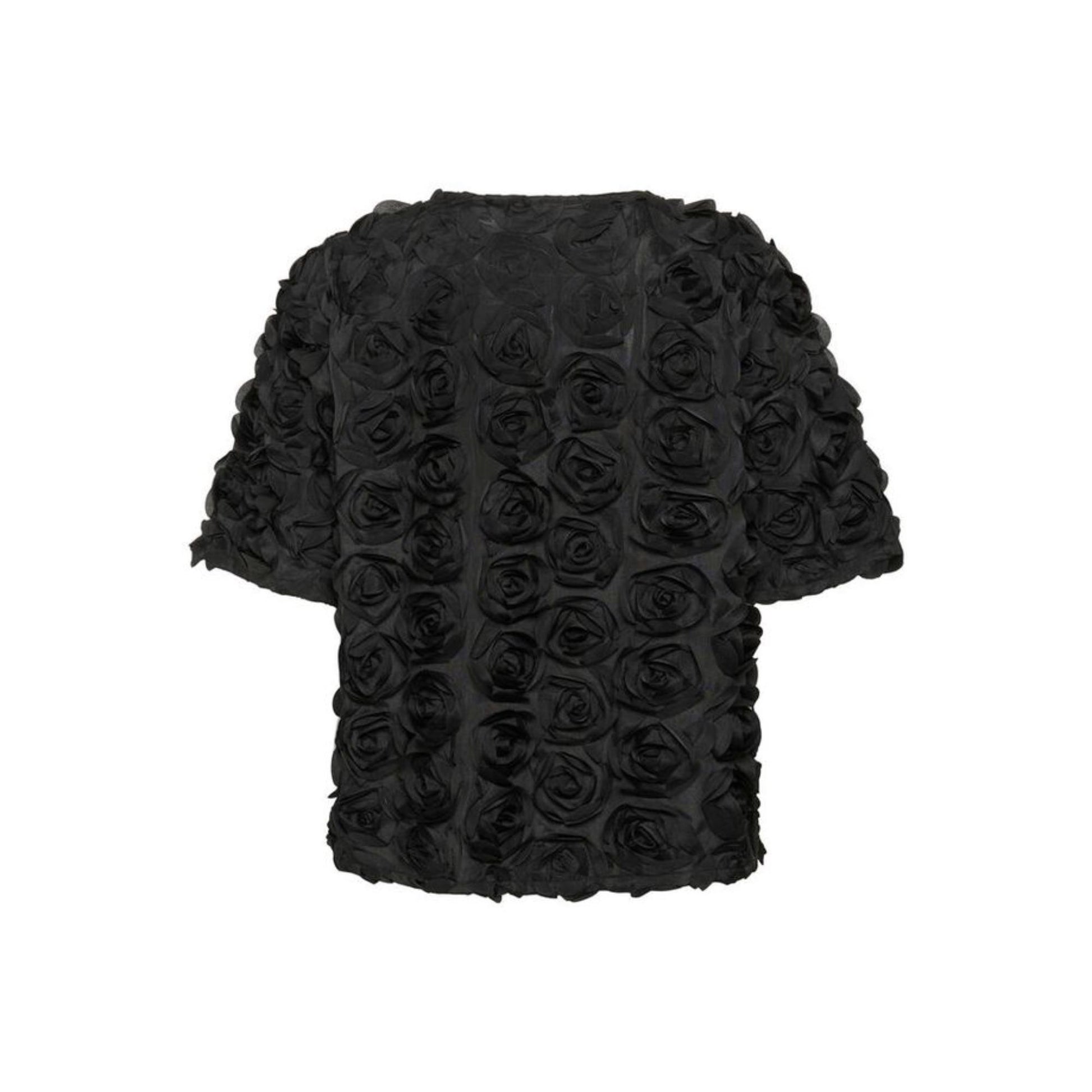 Super sød kortærmet bluse med flotte blomster, der er sat på metervaren. Derfor er den lidt kraftig i kvaliteten. Blusen er kort og ellers normal i snittet.