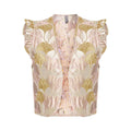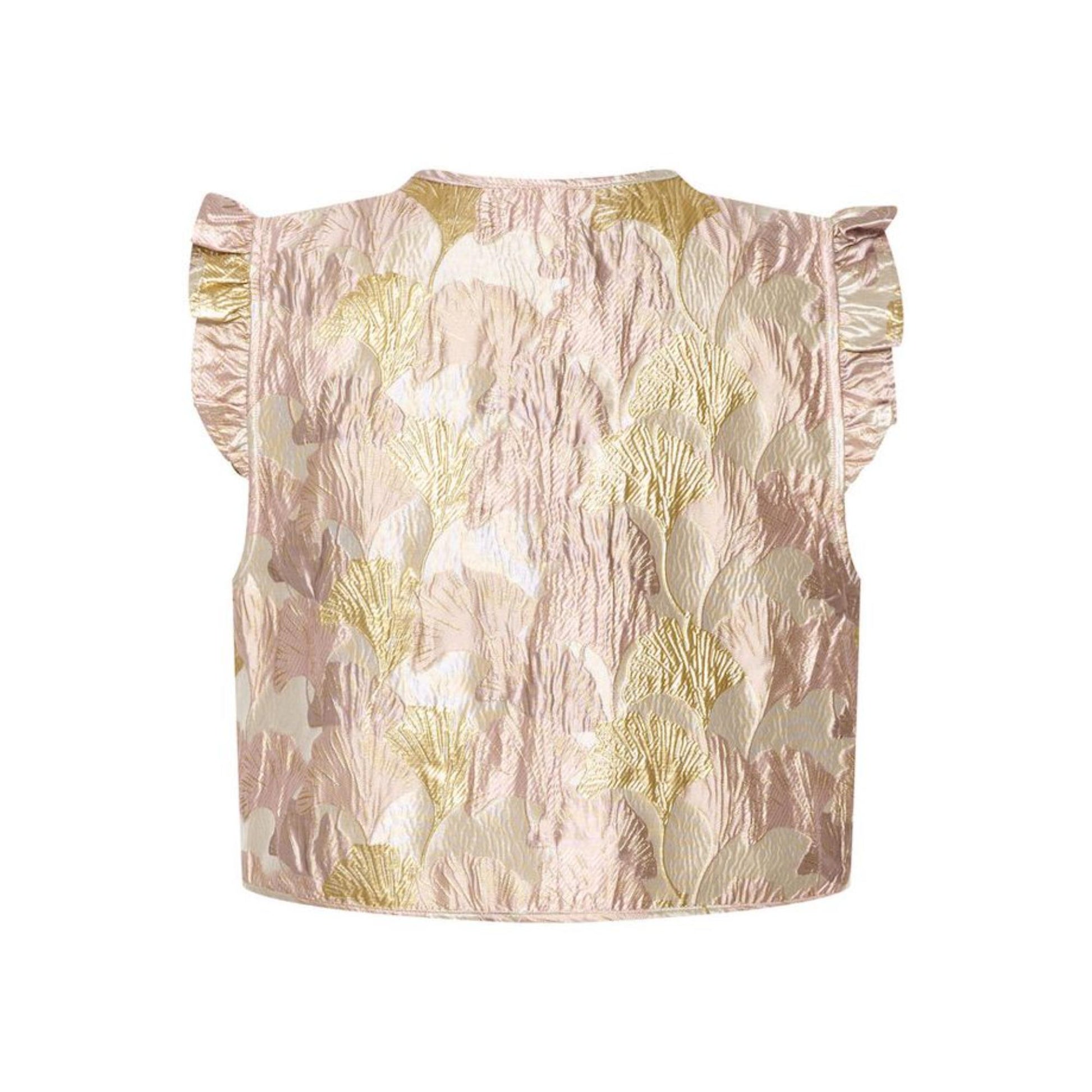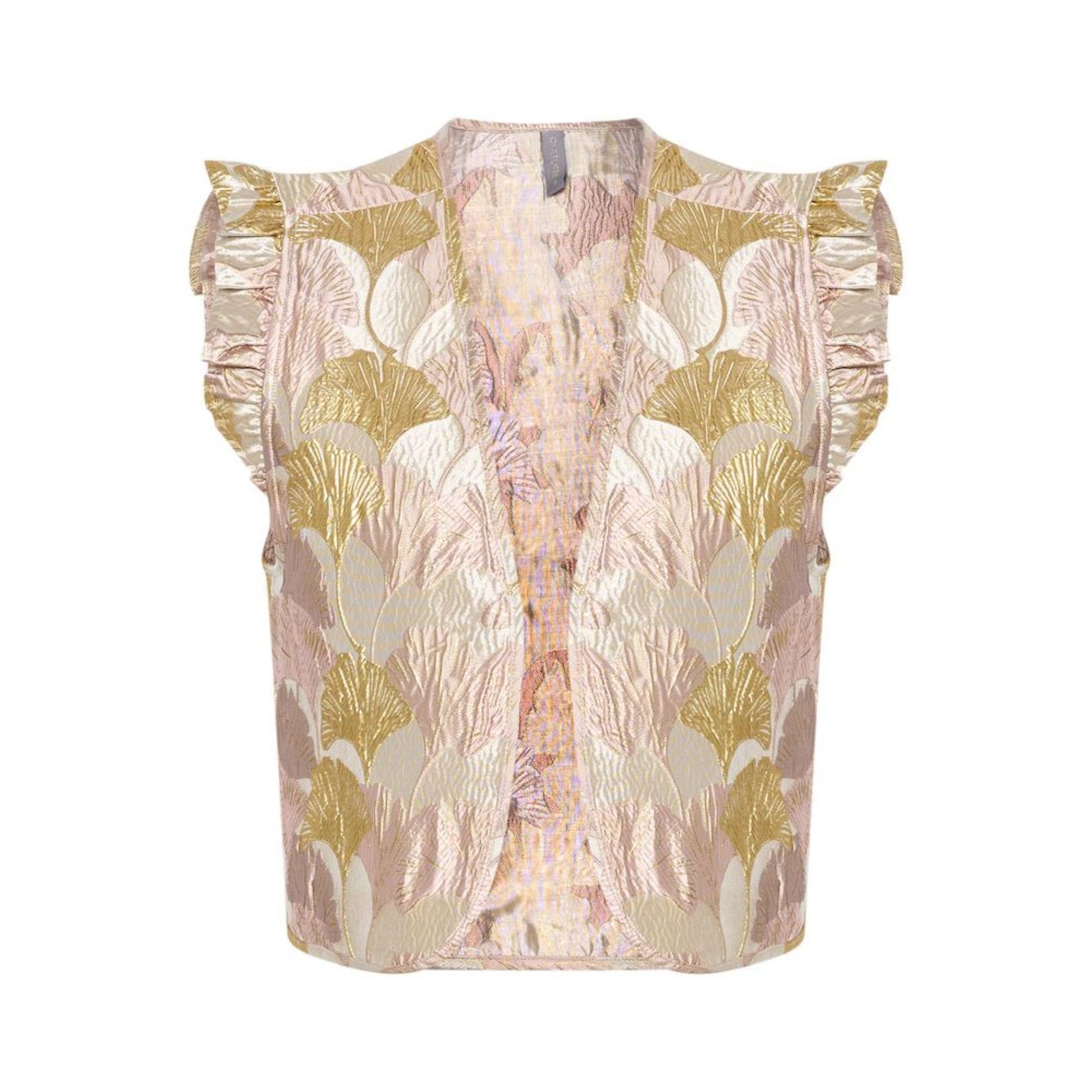 Super sød taft vest med smukke ducede farver samt en lille flæse ved skulderen. Den er lidt stiv i kvaliteten, så den bliver "siddende" i snittet. Vesten har ikke knapper og er til "pynt" udenpå bluser og kjoler. Den er almindelig i størrelsen.