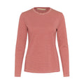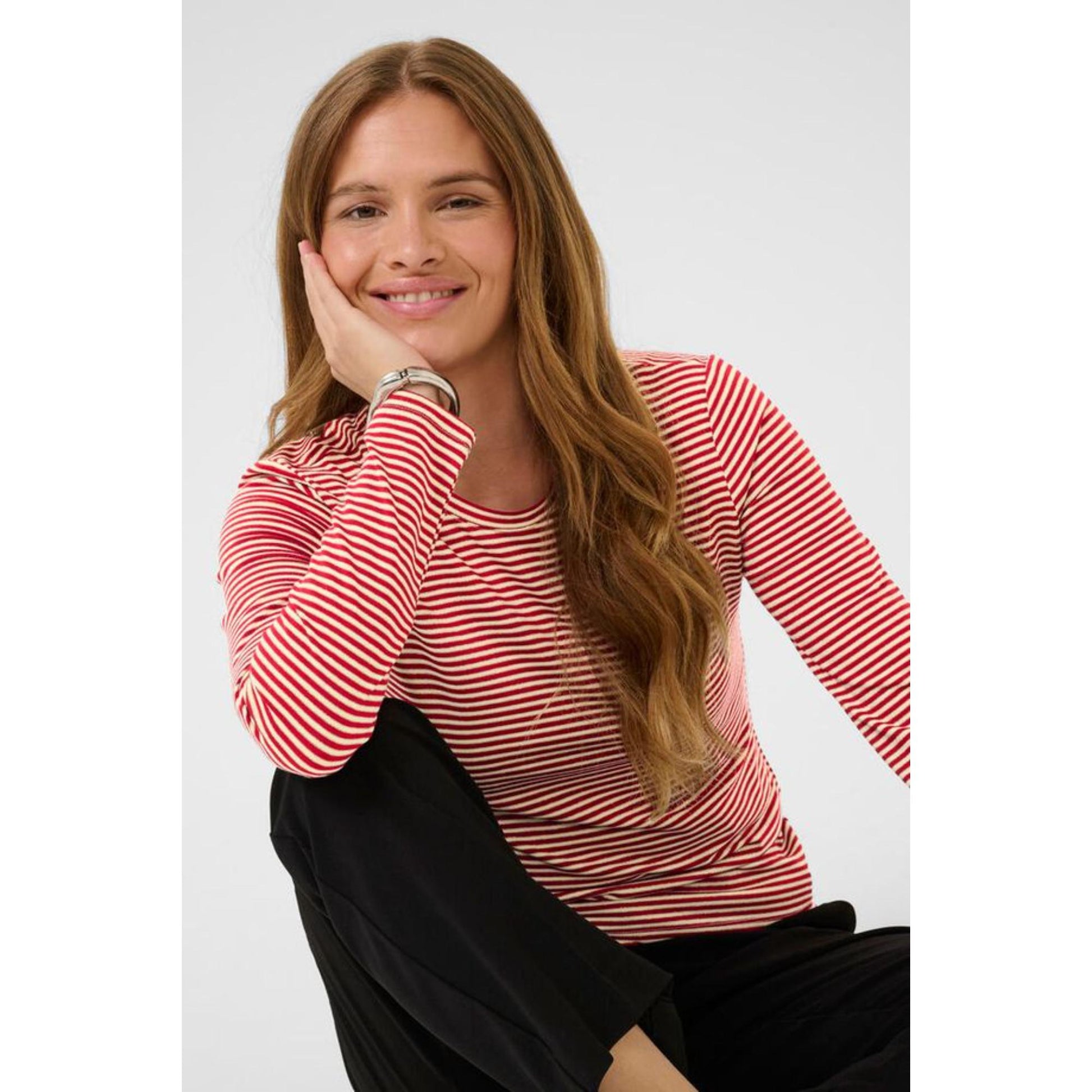 Lækker smal langærmet t-shirt med rund hals samt glimmer i metervaren. Den sidder til men har masser af strech, så den er sblød at have på. T-shirten er strinet med en guld tråd i metervaren.