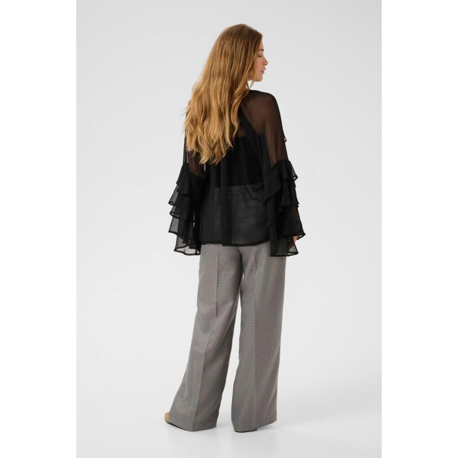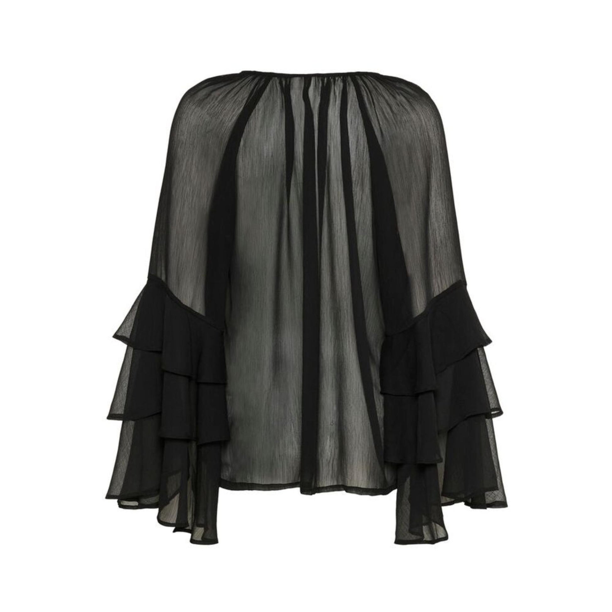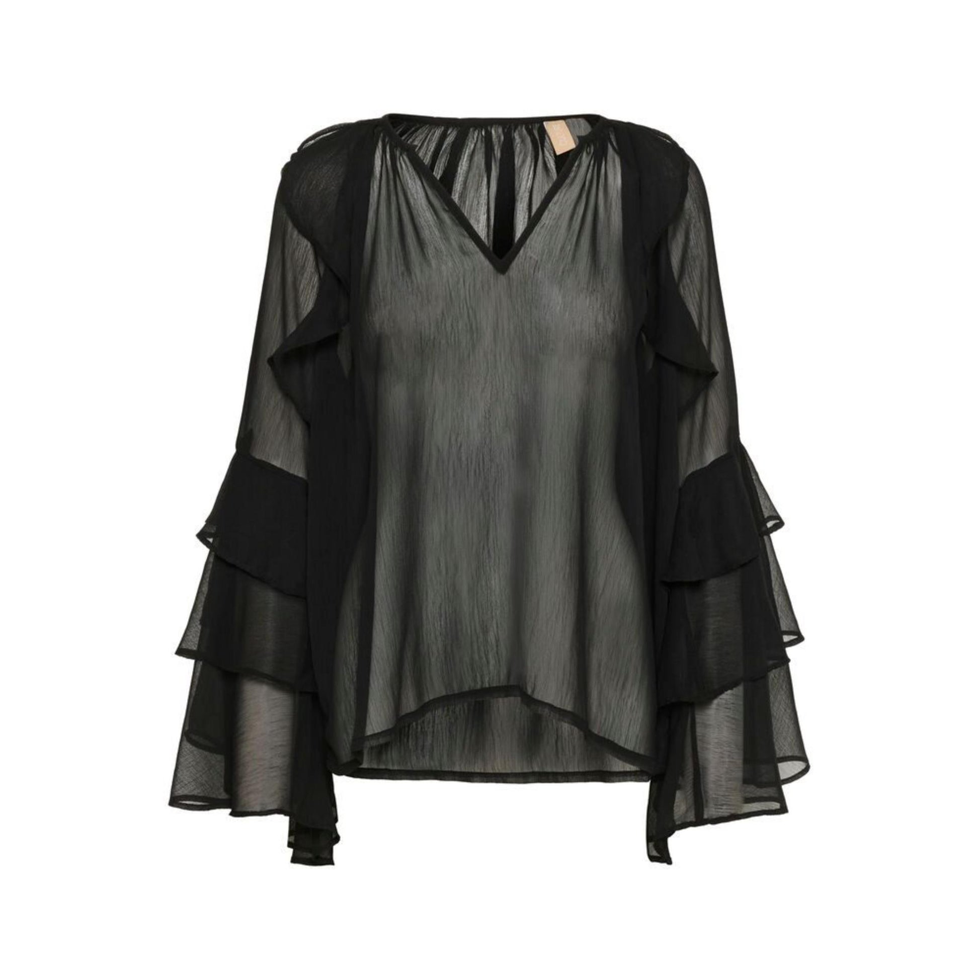 Sød chiffon bluse med masser af flæser både ned af skuldere samt ekstra flæser på ærmet. Derfor fylder ærmet meget. Blusen er lidt oversize. Da den er i chiffon, er den gennemsigtig og man behøver derfor en top under.