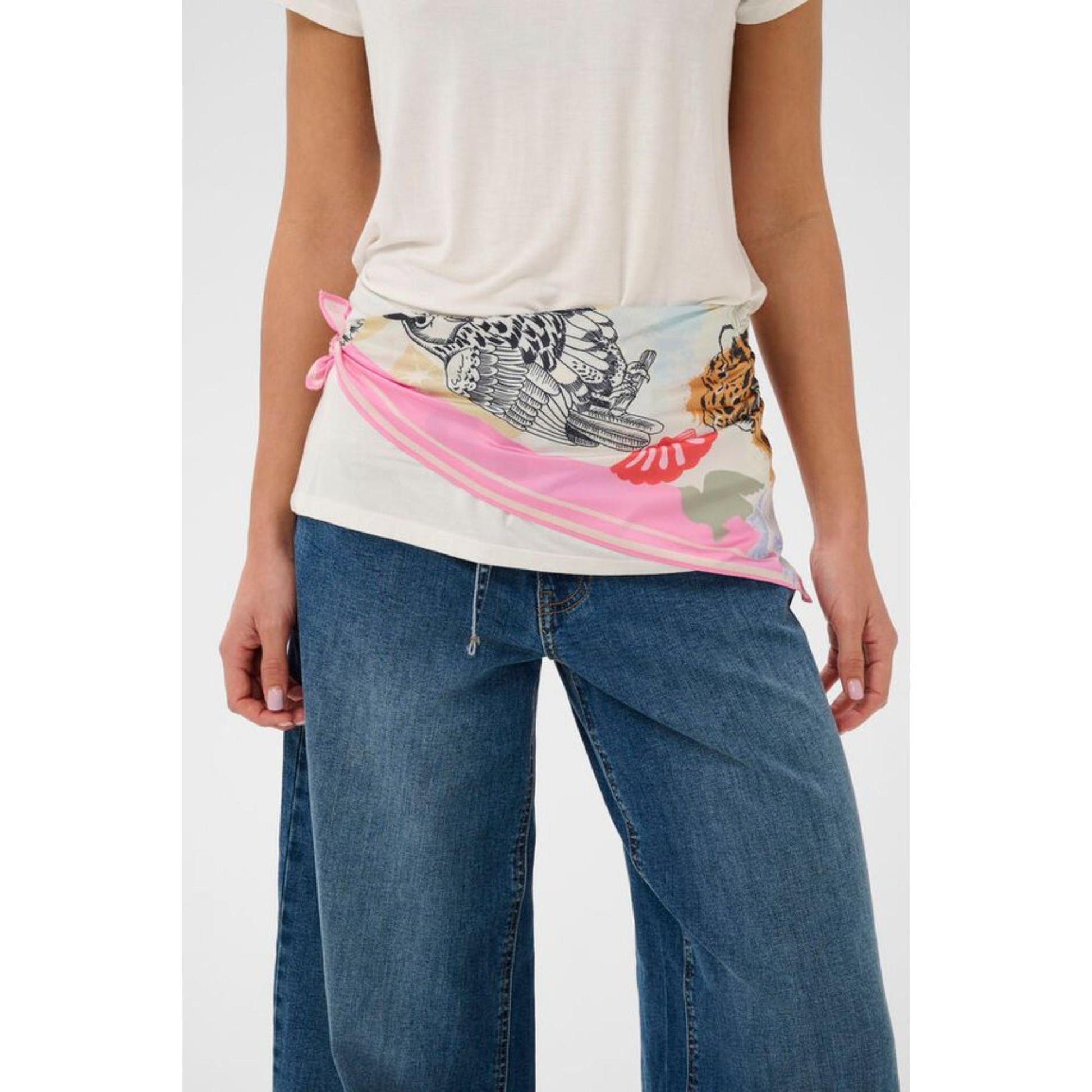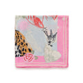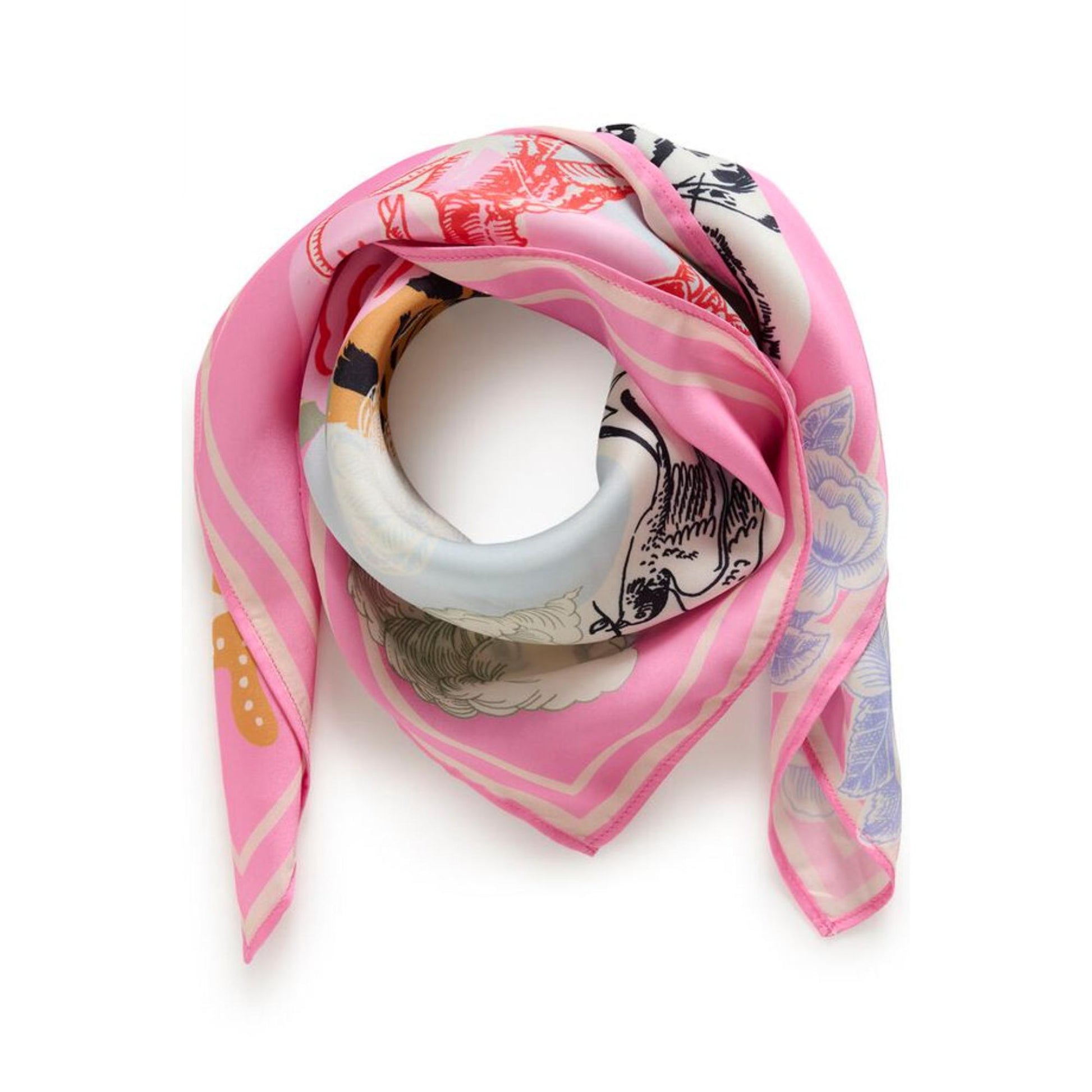 Lille Tørklæde, der kan bruges til lidt af hvert. Det er meget glat i kvaliteten. Kvaliteten er polyester og det er ca. 62x62 cm.