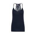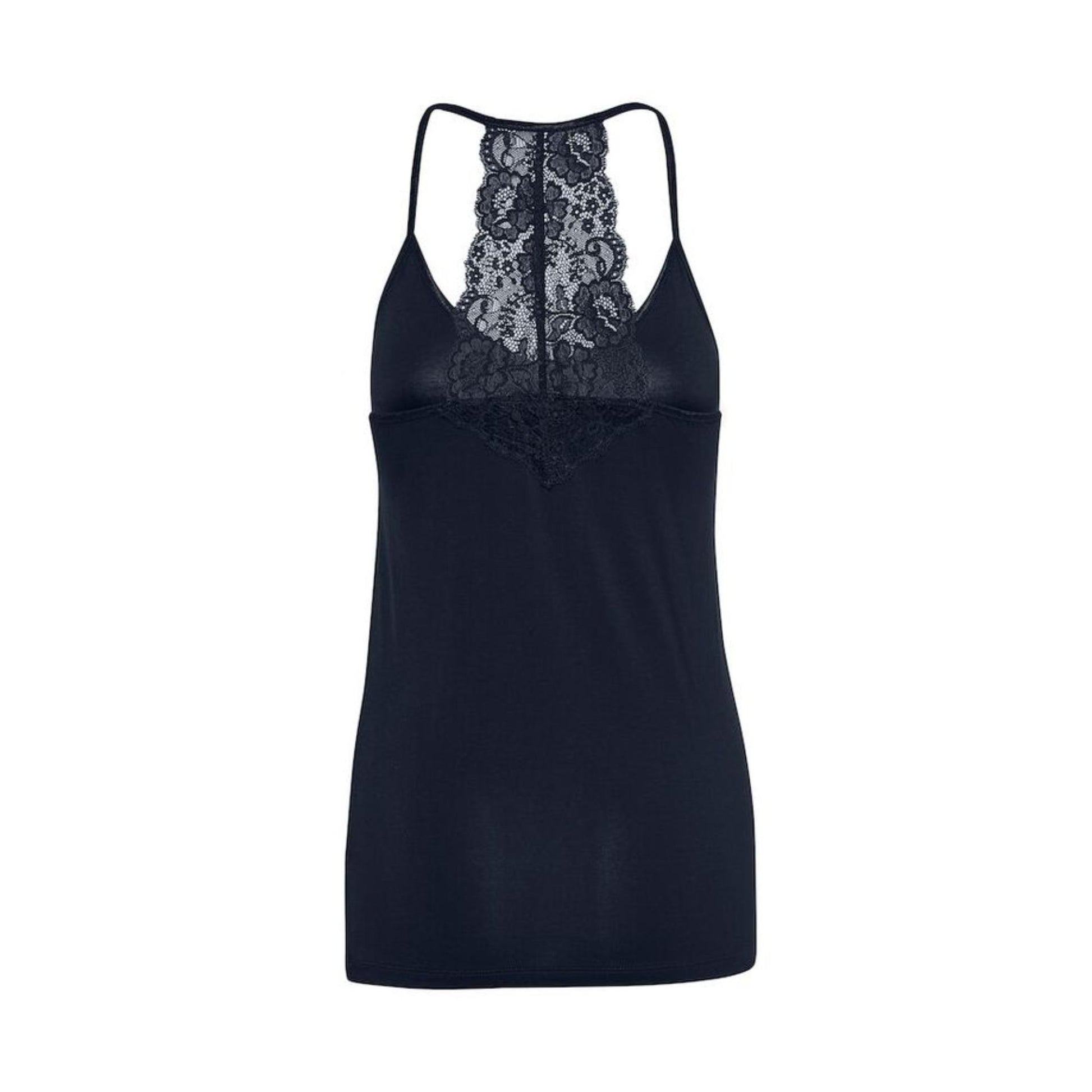 Lækker smal og blød stramsiddende top med blonde effekt i nakken. Den sidder til og er flot under noget andet tøj. Toppens stropper er emalle og går in tæt på halsen. Det vil sige, at man kan se bh-stroppen under. Blonden går højt op i nakken og giver derfor en flot effekt under noget andet tøj.