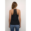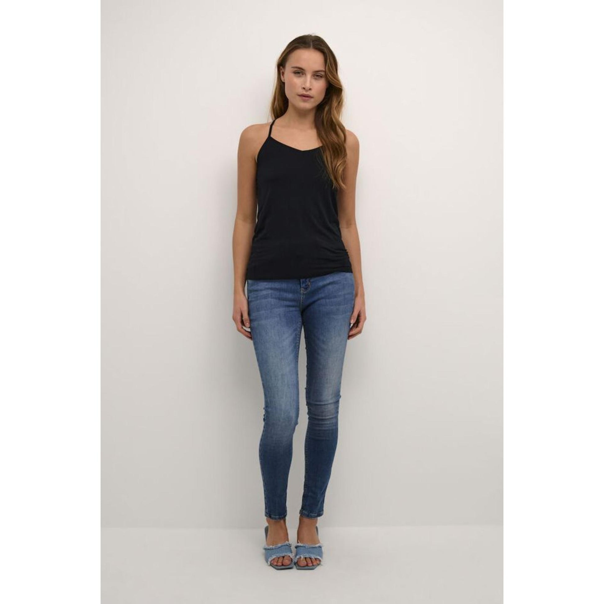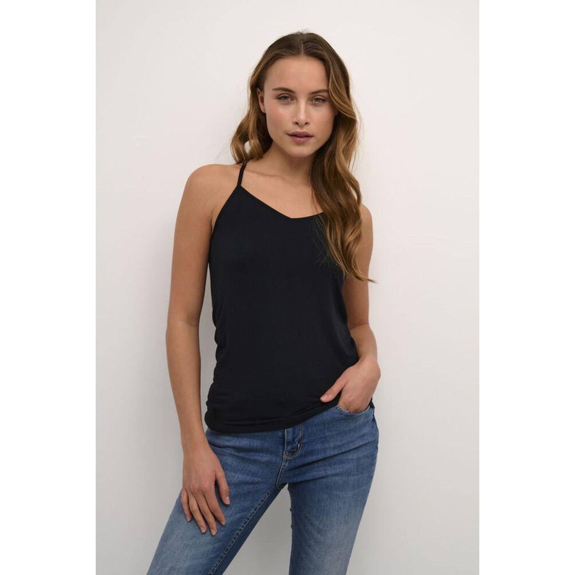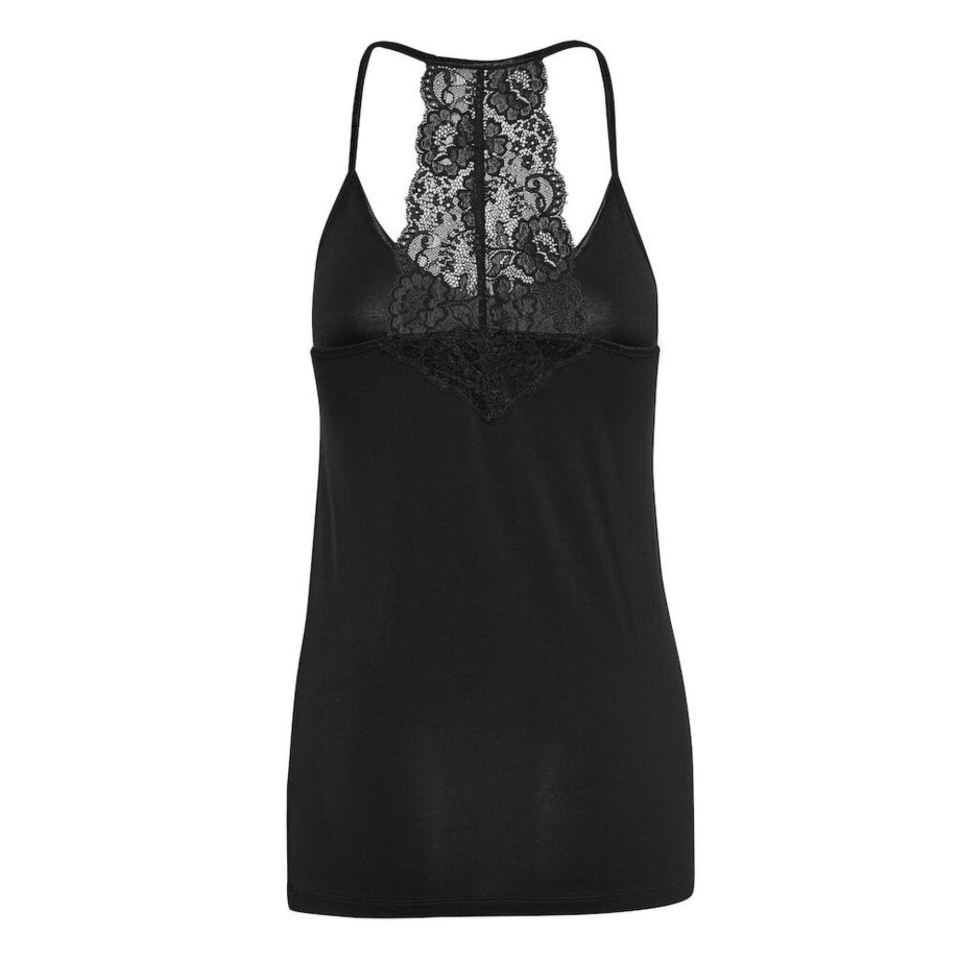 Lækker smal og blød stramsiddende top med blonde effekt i nakken. Den sidder til og er flot under noget andet tøj. Toppens stropper er emalle og går in tæt på halsen. Det vil sige, at man kan se bh-stroppen under. Blonden går højt op i nakken og giver derfor en flot effekt under noget andet tøj.