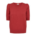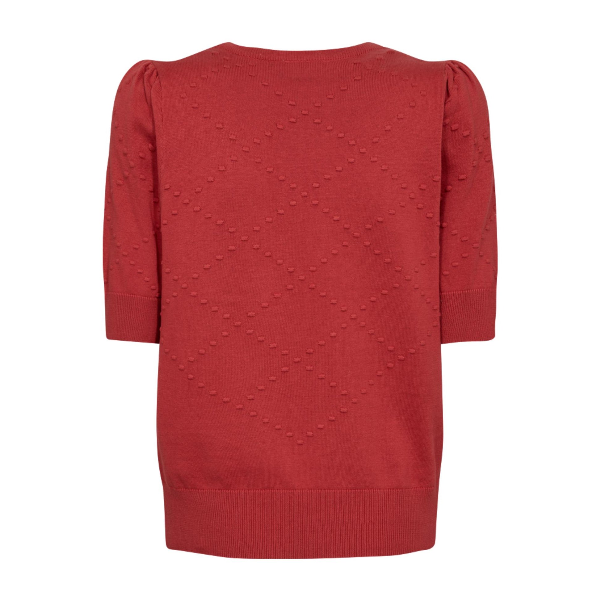 Sød enkel kortærmet strik i bomuld. Den er "dots" i metervaren. Den er almindelig i størrelsen. Den har lidt pufeffekt ved skulderen.