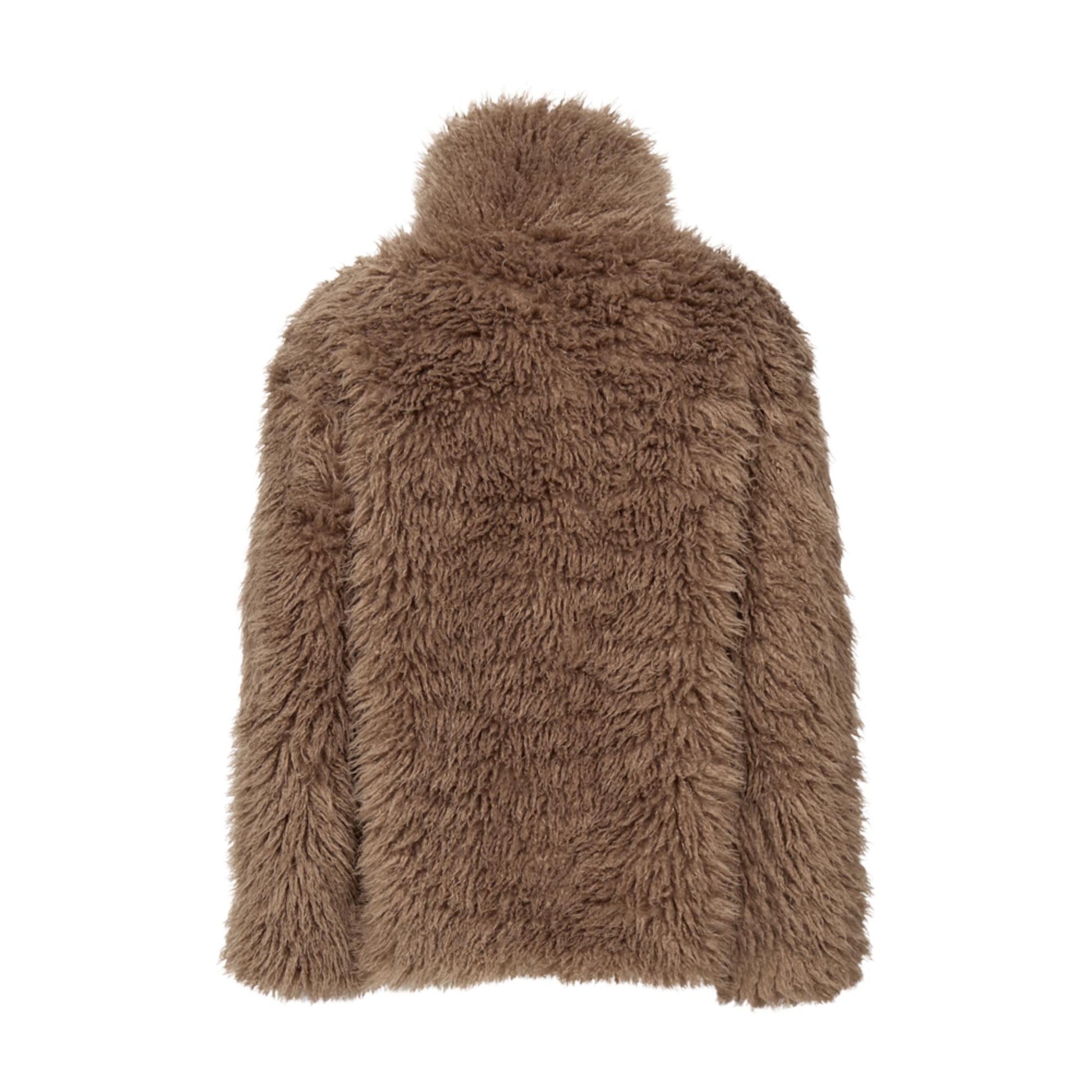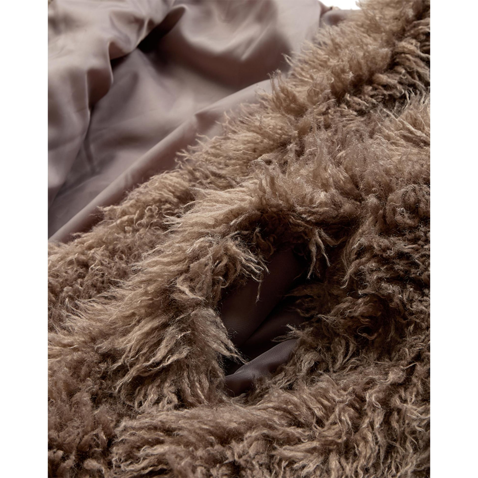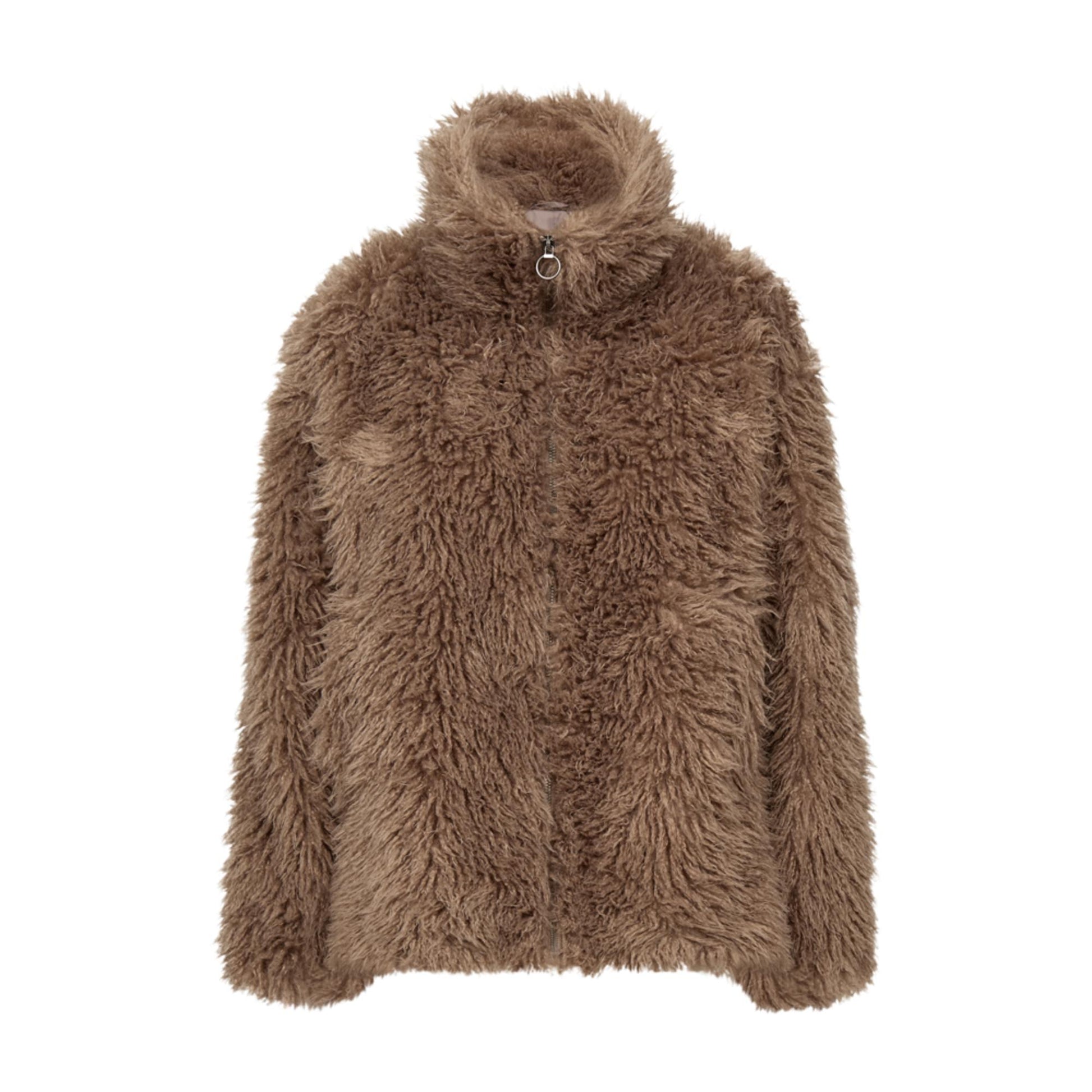 Sjov pelset kort jakke med lange frynser. Den har lynlås og går højt op i halsen. Jakken har foer samt lommer i siderne. Snittet er lige.
