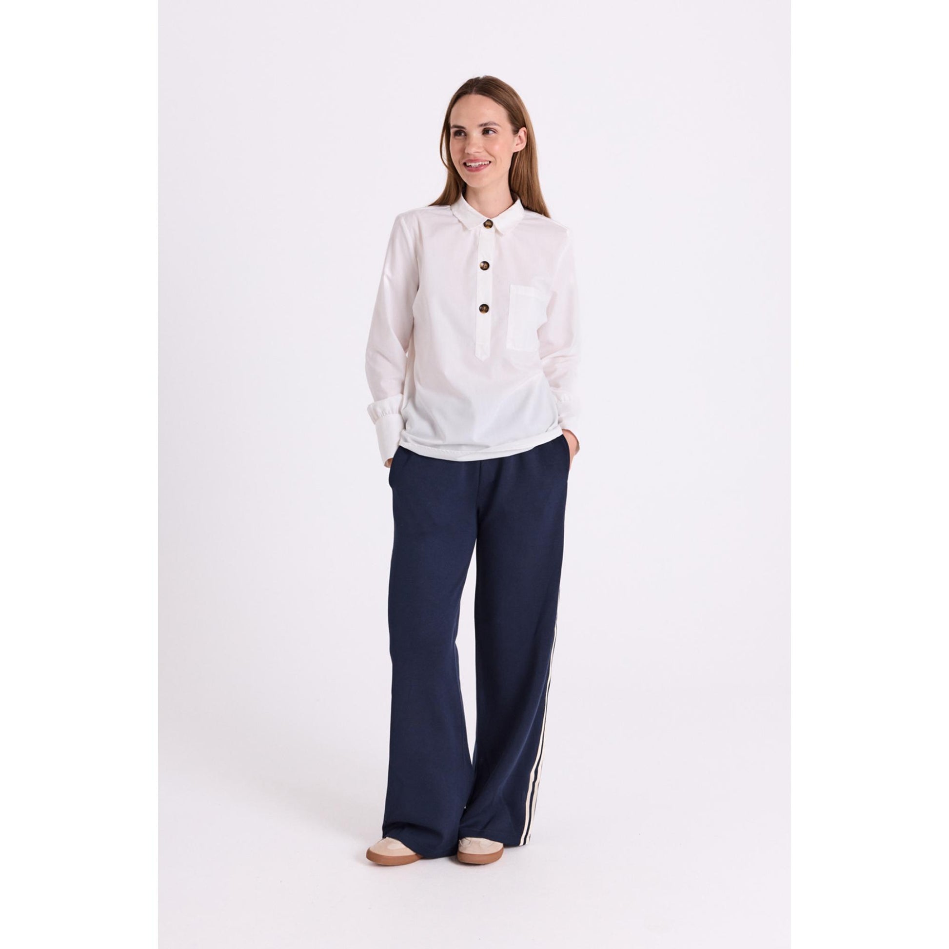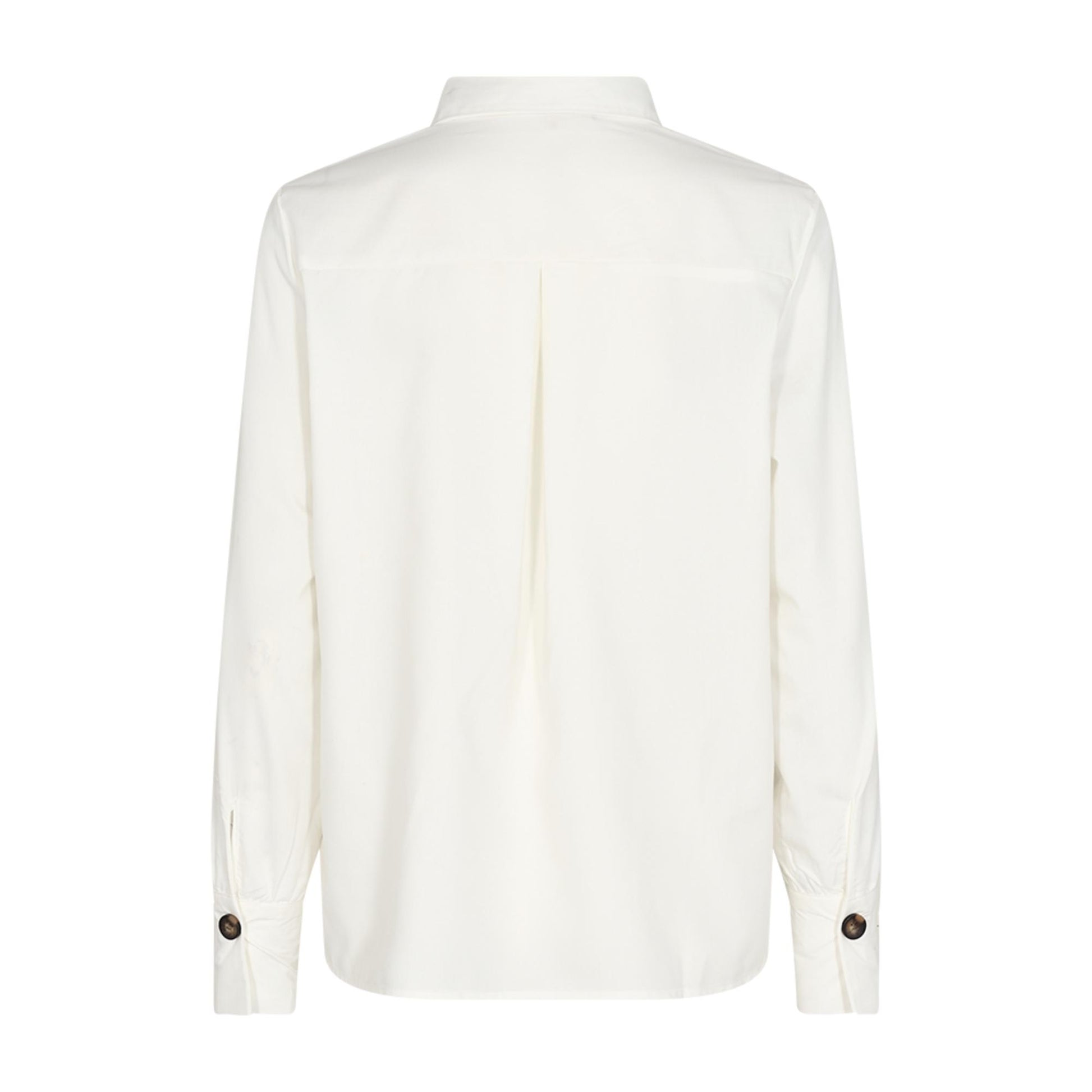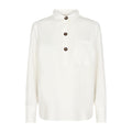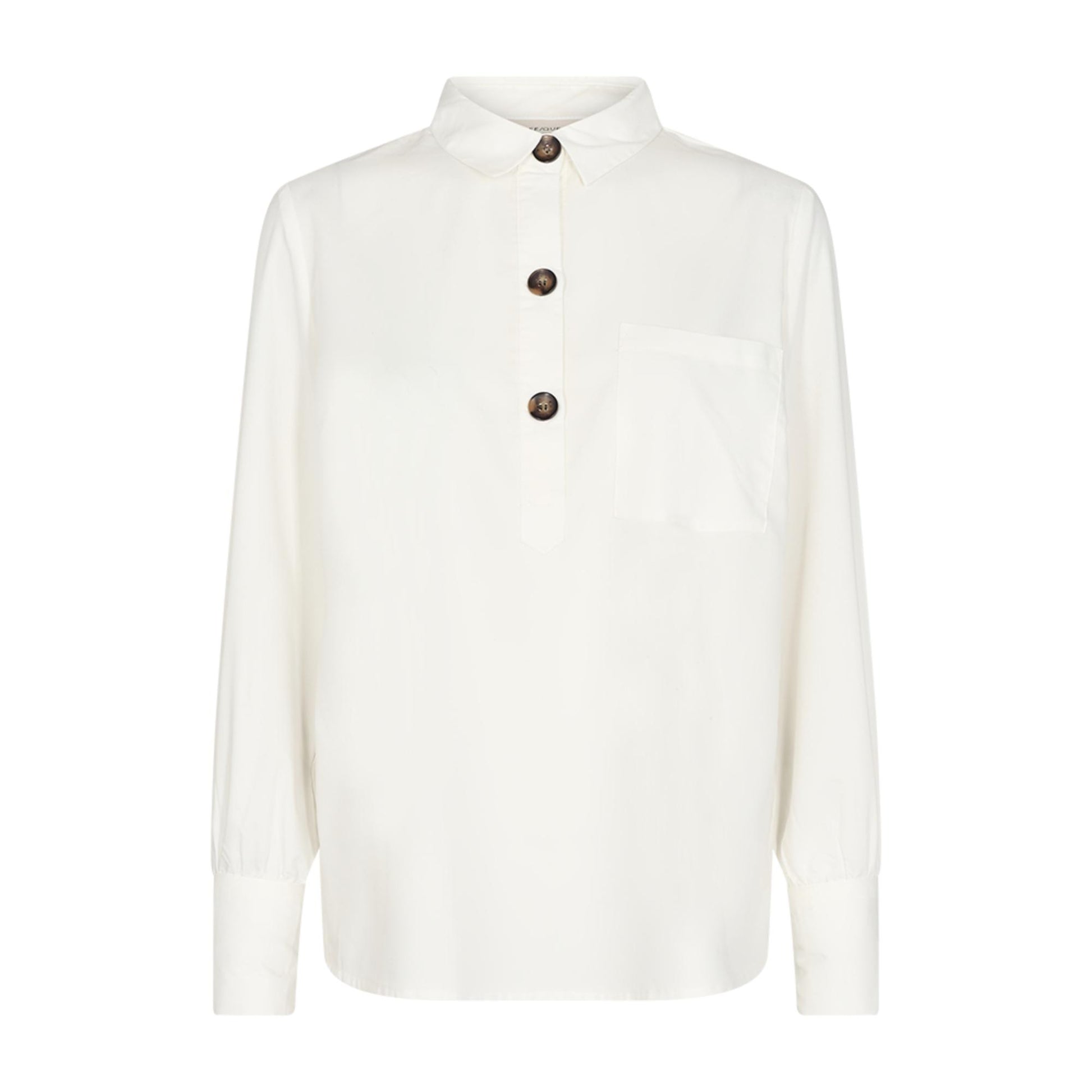 Lækker bluse med et lige snit. Blusen har lange ærmer samt krave ved halsen. Den har tre mørke knapper foran til omkring barmen. Ved ærmerne har den en bred kan som afslutning. Den har god plads ved barmen, men da snittet er lige, er den ikke så bred ved haften, og vi anbefaler derfor at tage den størrelse, man plejer at bruge. Derfor skal man vide, at den har god plads ved barmen. Blusen er en del af Freequents basis program.