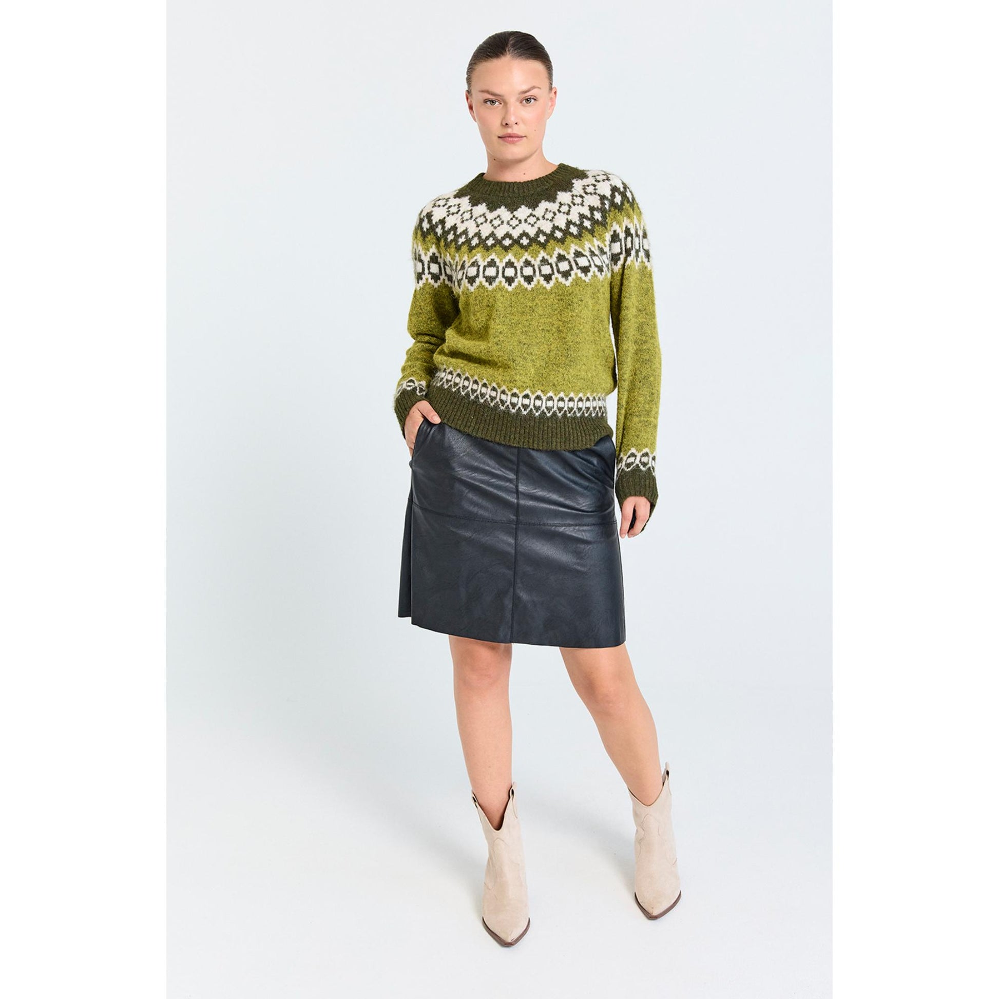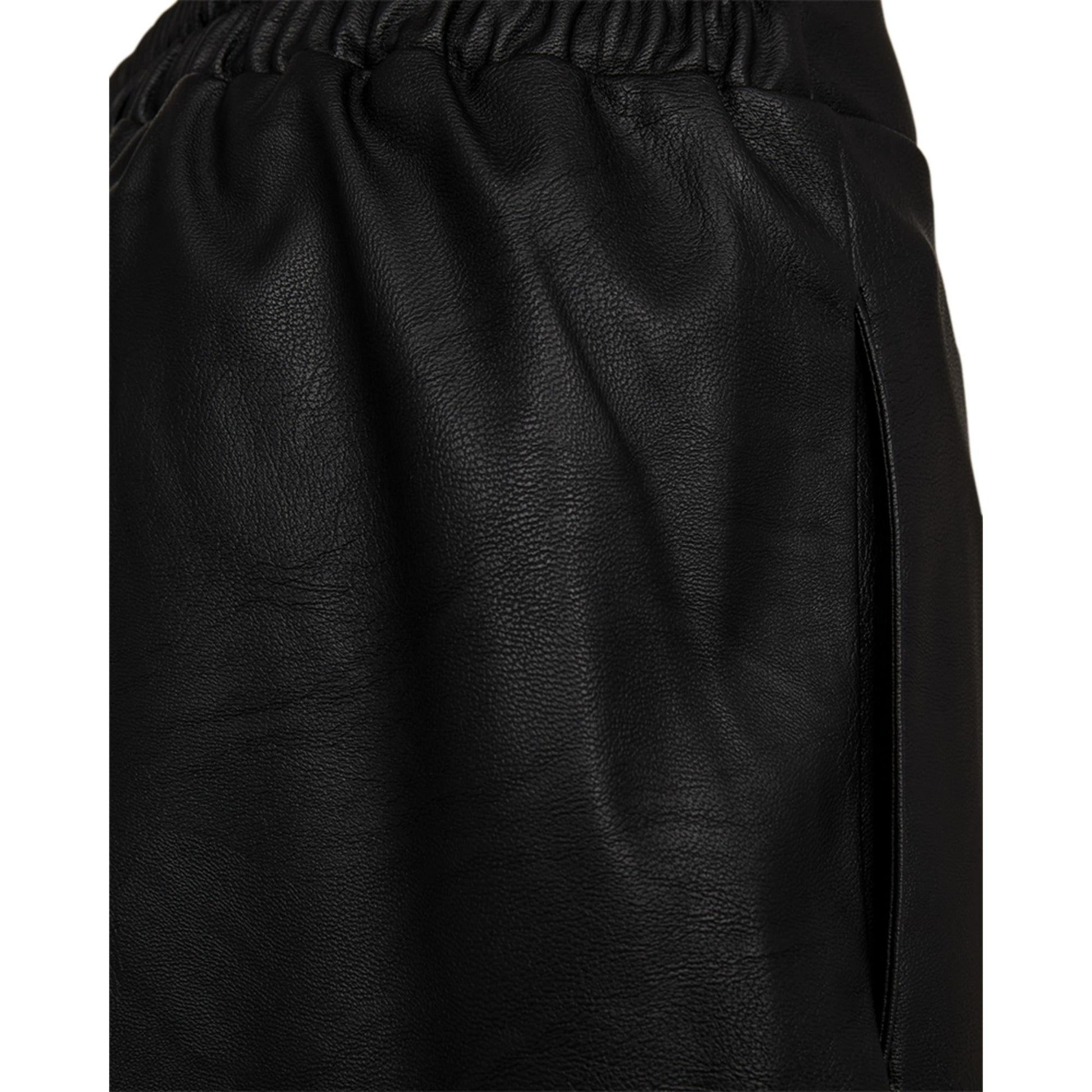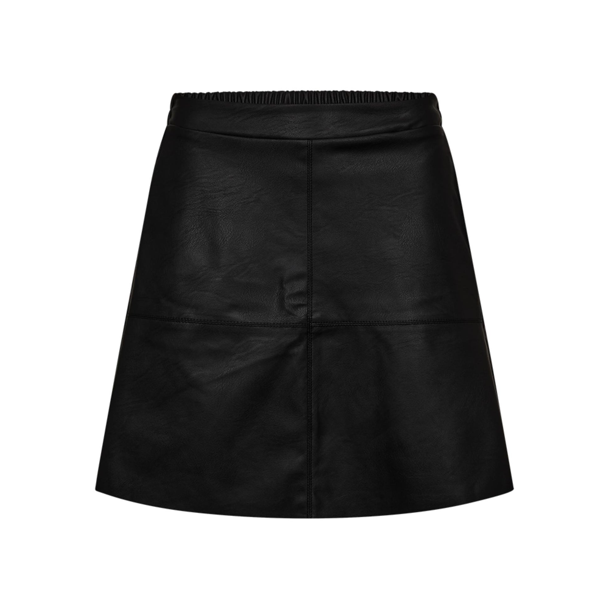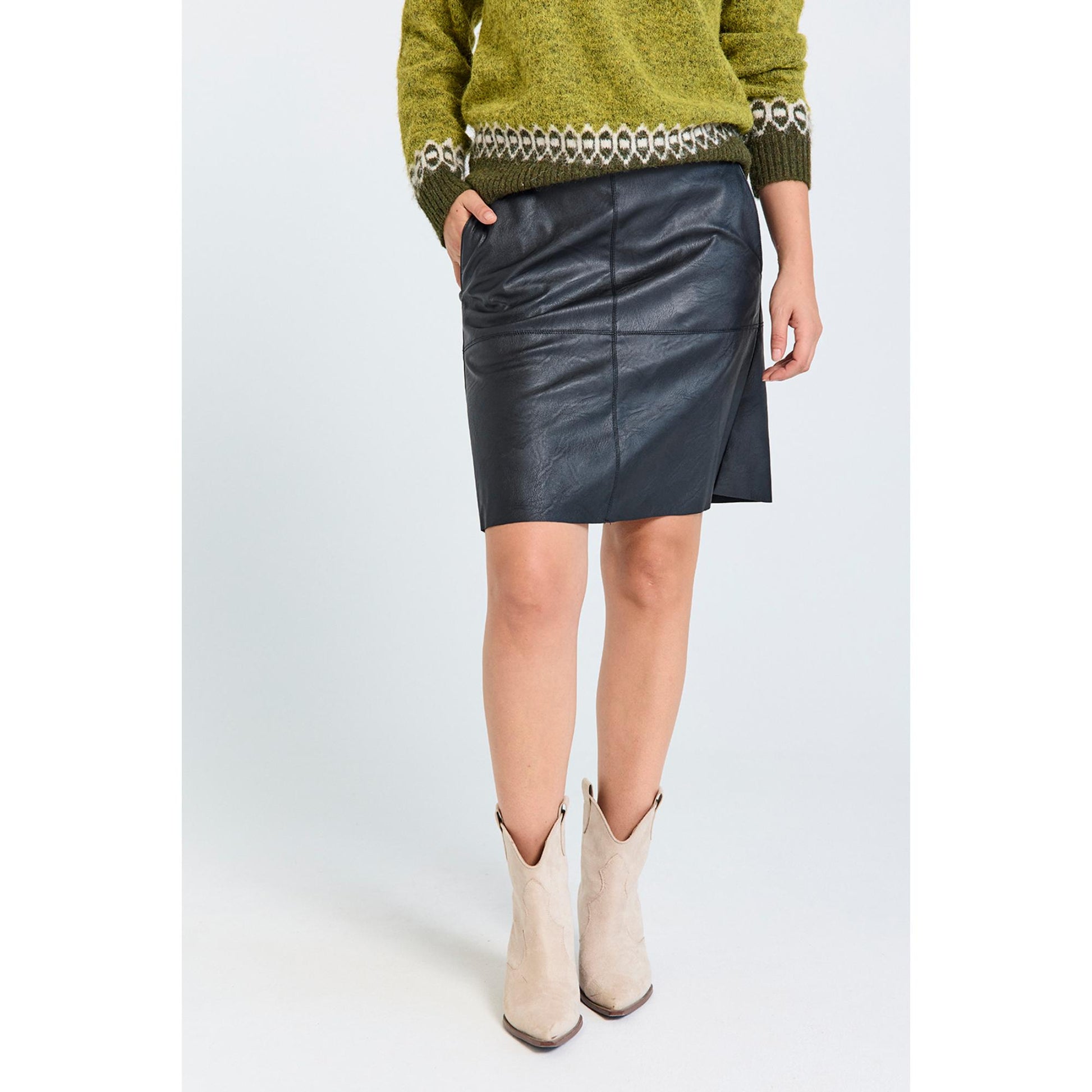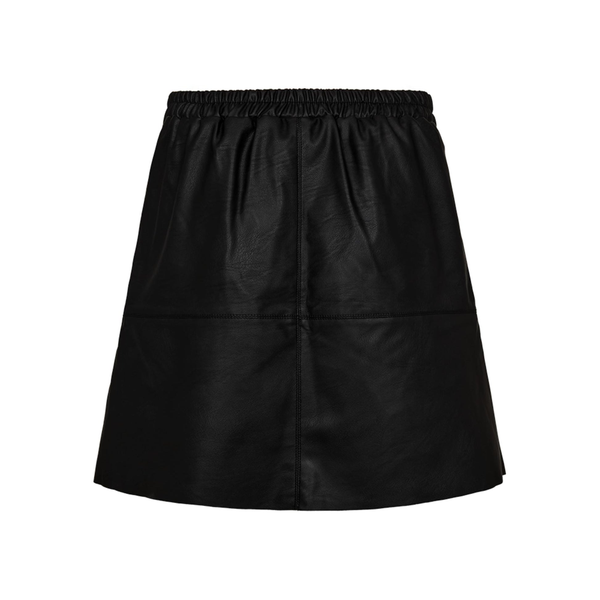Kort skind look-alike nederdel i en polyester-polyurethane kvalitet, der kan vaskes i maskinen. Den har fast linning foran i taljen og bagpå har den elastik, så den sidder ordenligt til- Den er lidt smallere foroven og går ud forneden. Den har lommer i siderne. Snittet er smalt.