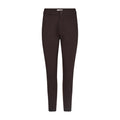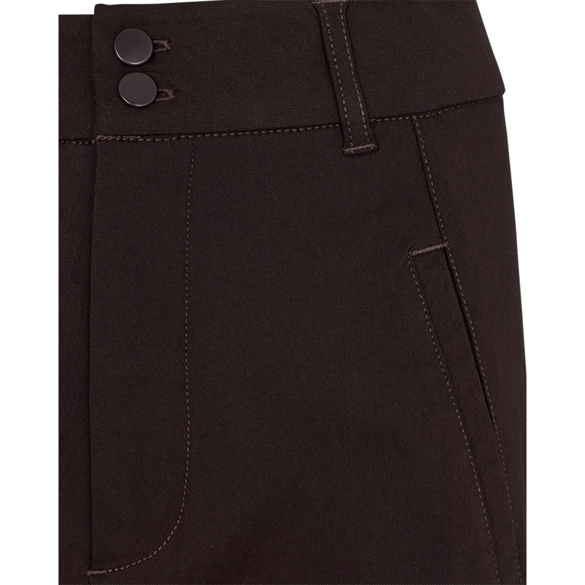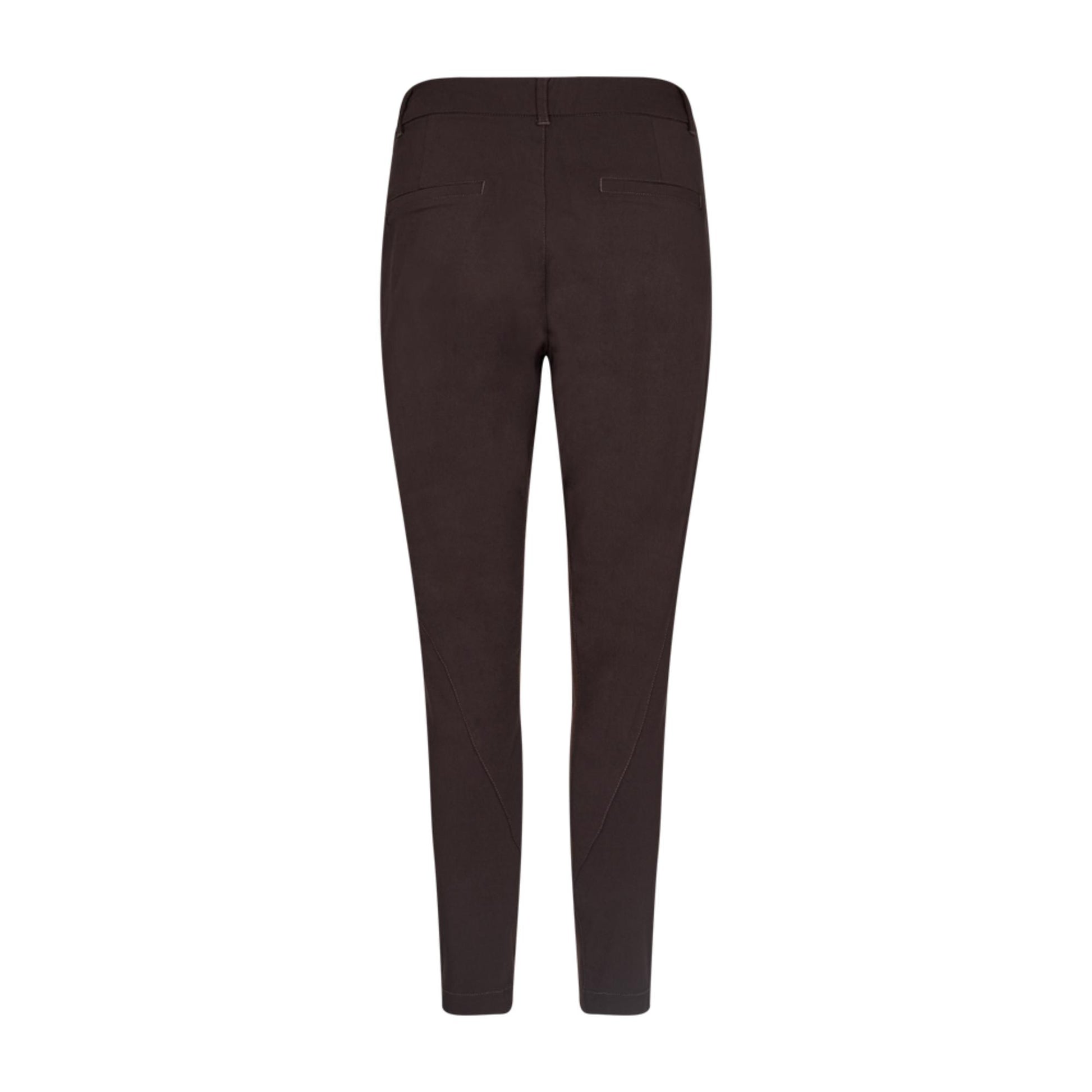 Brun smal buks med skrålommer, der sidder foran inde på buksen, så lommen buler lidt. Rib på indersiden af benene. Super elastisk. Smalle ben. Plads i livet. 7/8 benlængde. Taljen går ikke ind, så den er bred i taljen. Hvis man tager buksen en størrelse mindre, bliver det en almindelig smal model, tager man den i sin normale størrelse, bliver den "baggy"