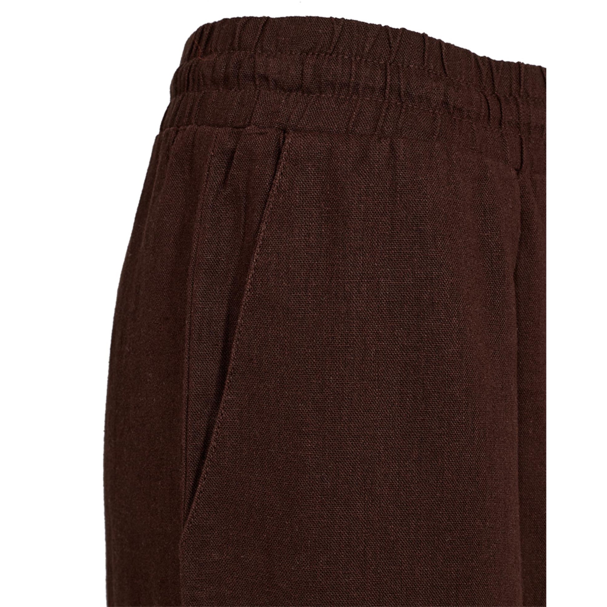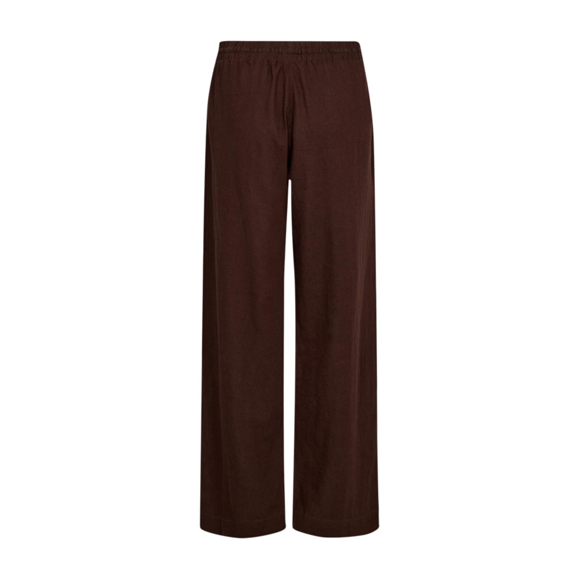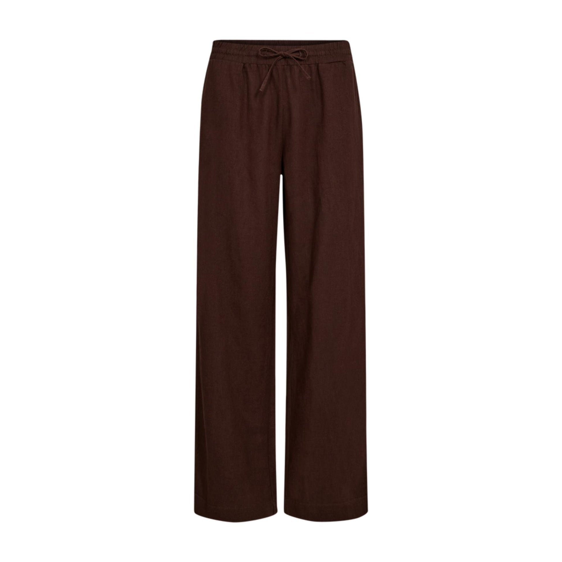 Hellang løs buks i Freequents basis hør-viscose kvalitet. Den er lækker at have på med elastik og snøre i taljen. Benene er lige. Den har lommer i siderne. Når det er en blanding af hør og viscose, krøller de ikke så meget som ren hør og er heller ikke så gennemsigtige. Vi anbefaler at tage en størrelse mindre end man plejer, da de bliver større ved brug.