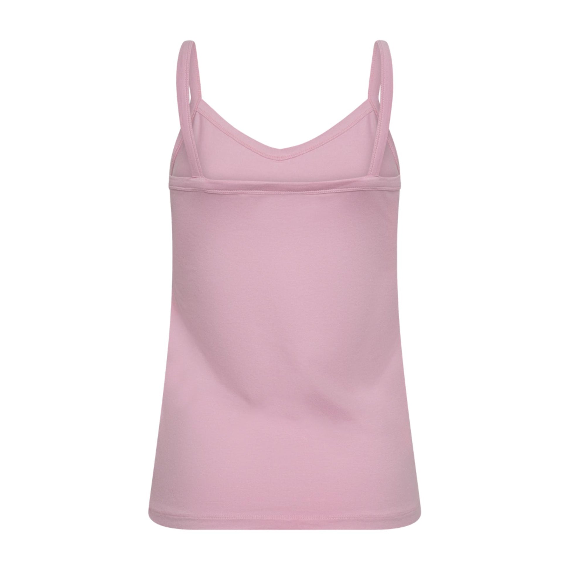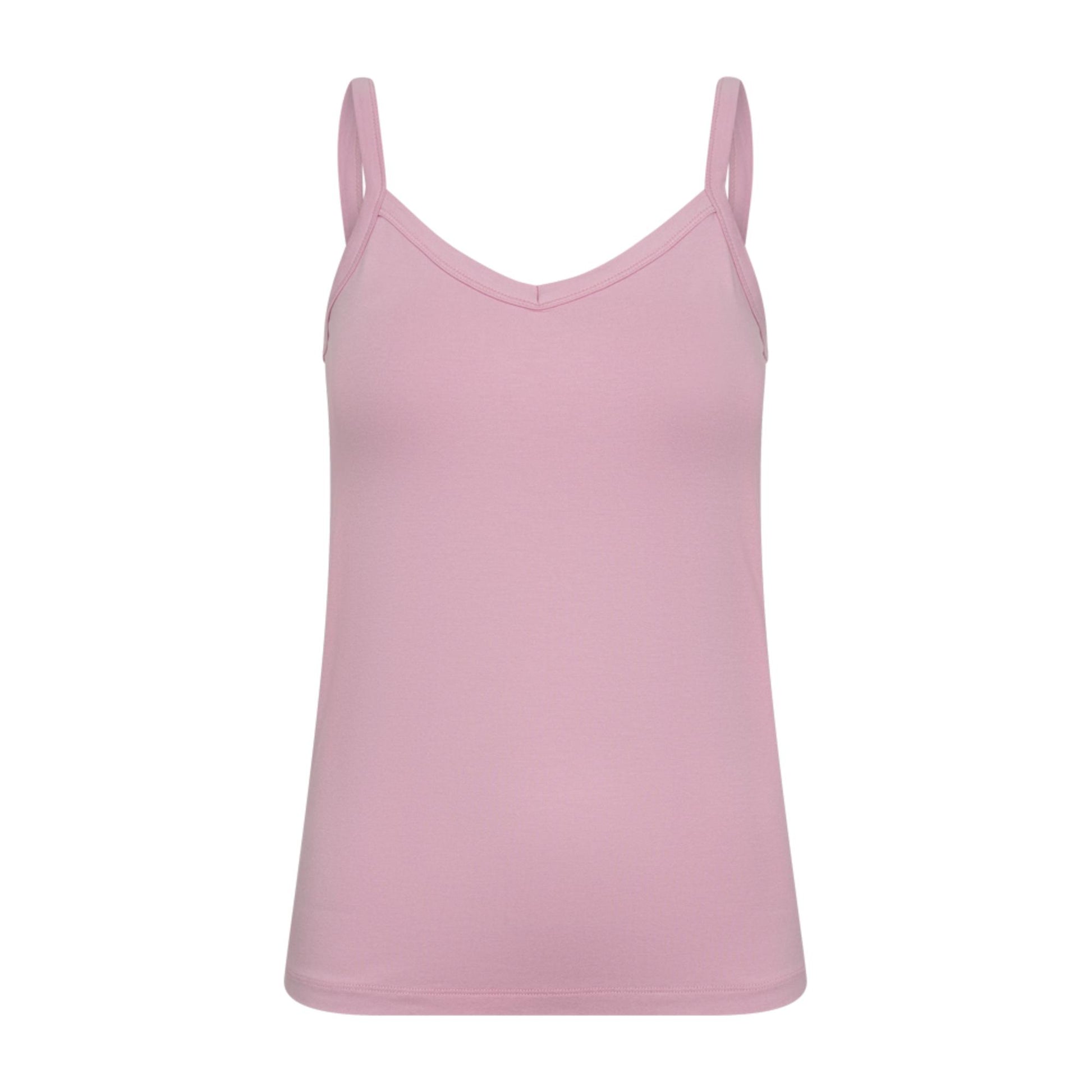 Lækker blød og tætsiddende top med v-hals samt smalle stropper. Den sidder til og er derfor god at have under noget. Toppen er i en lækker blød viscose kvalitet. Den går ligeledes ned på ryggen, så den ikke sidder oppe i nakken.