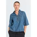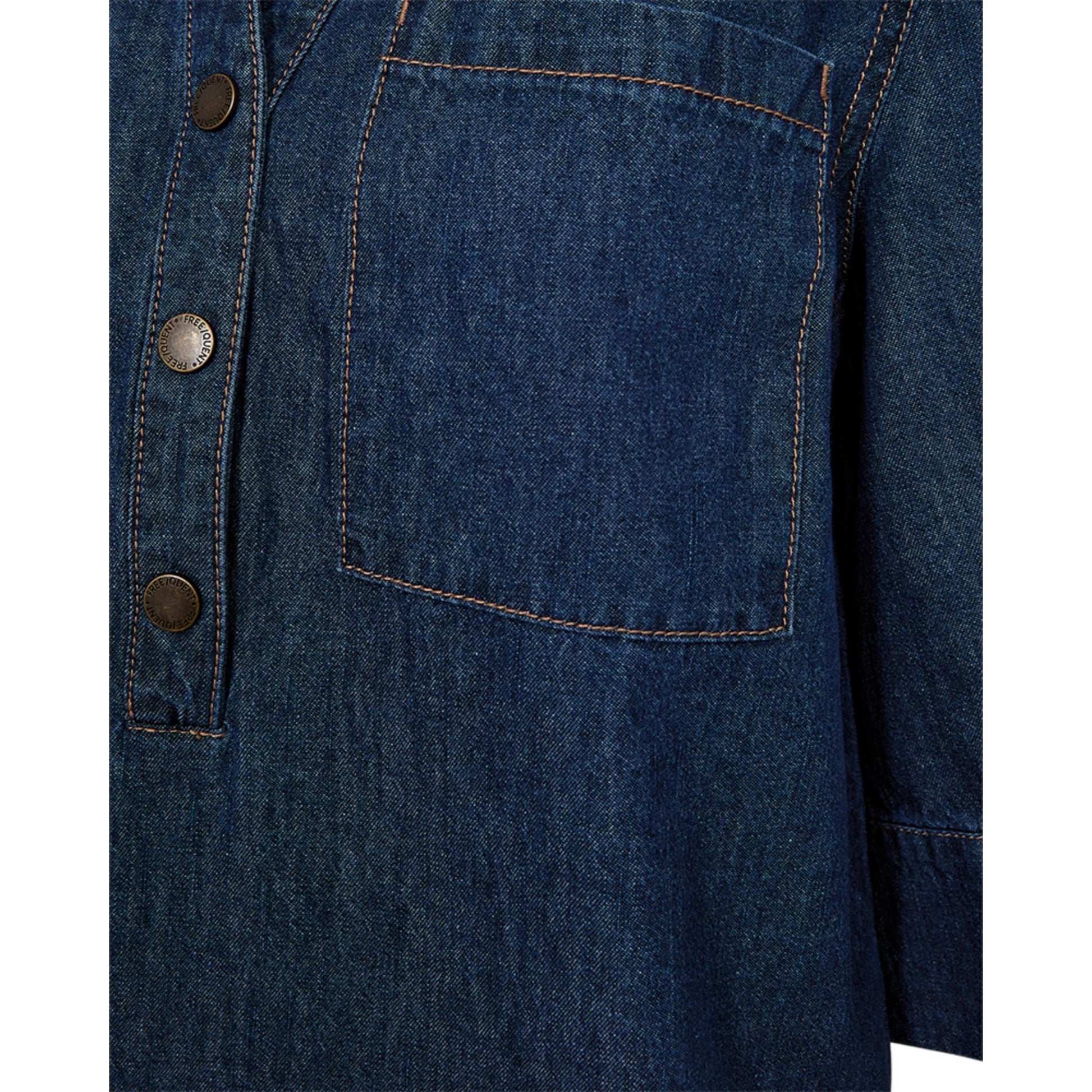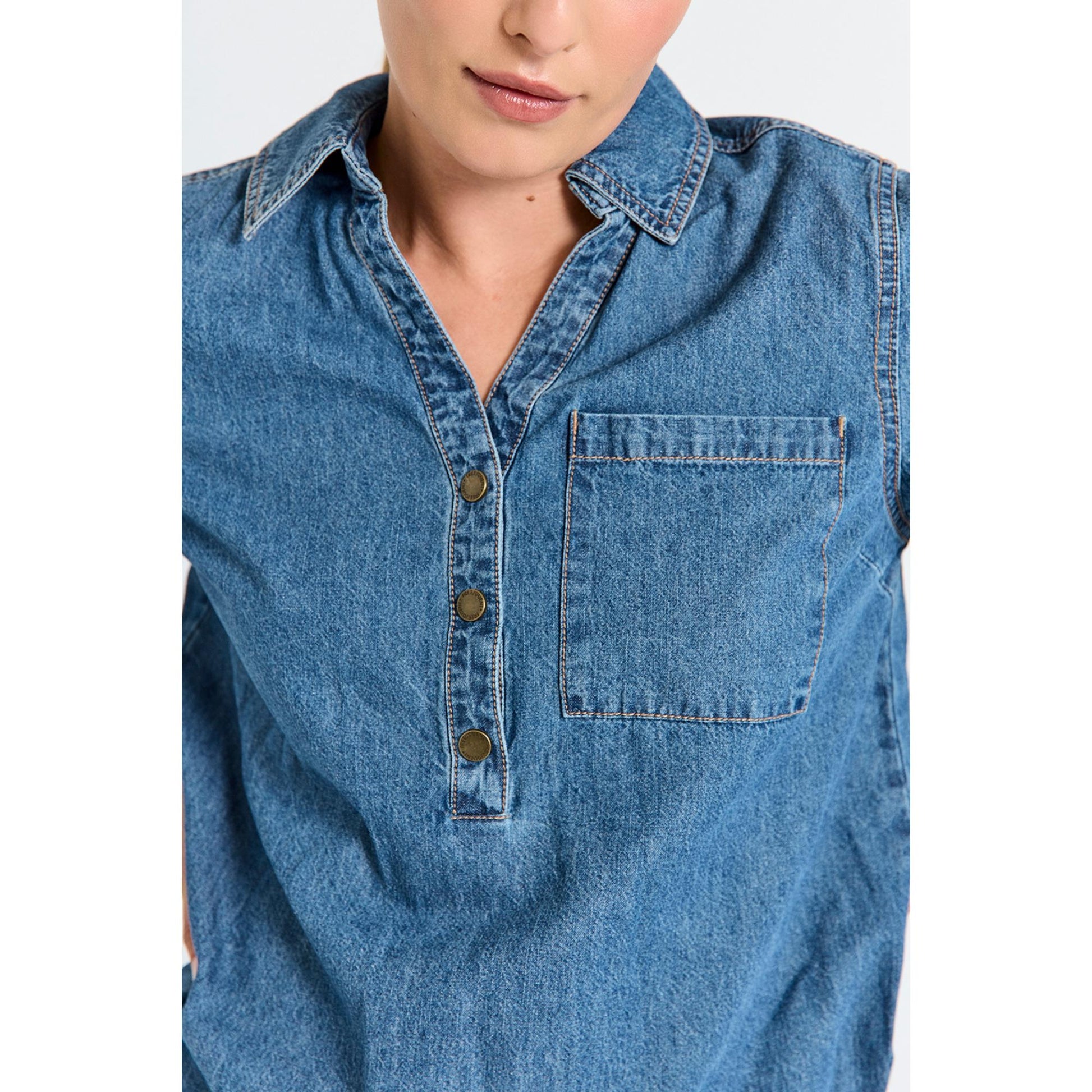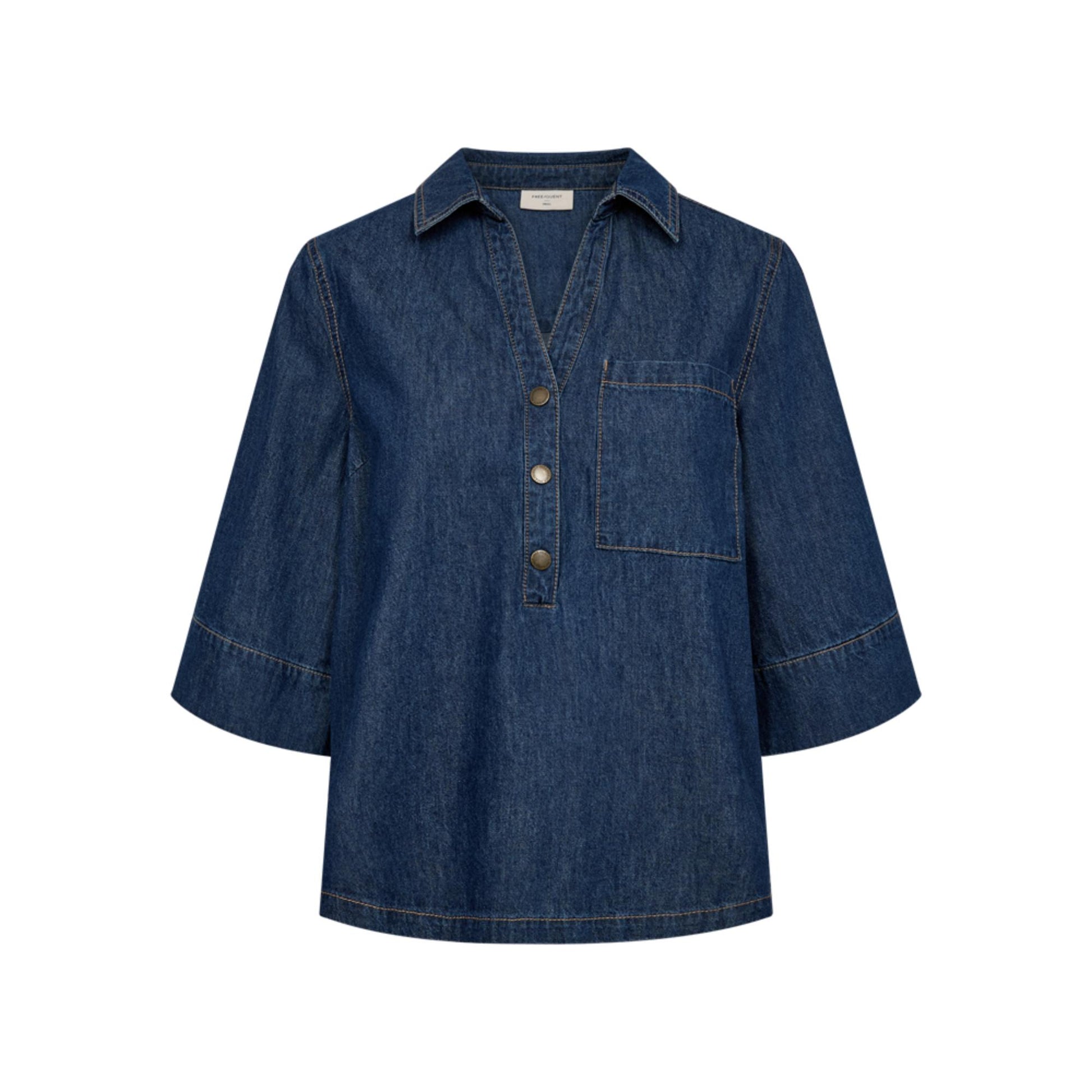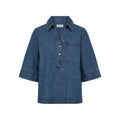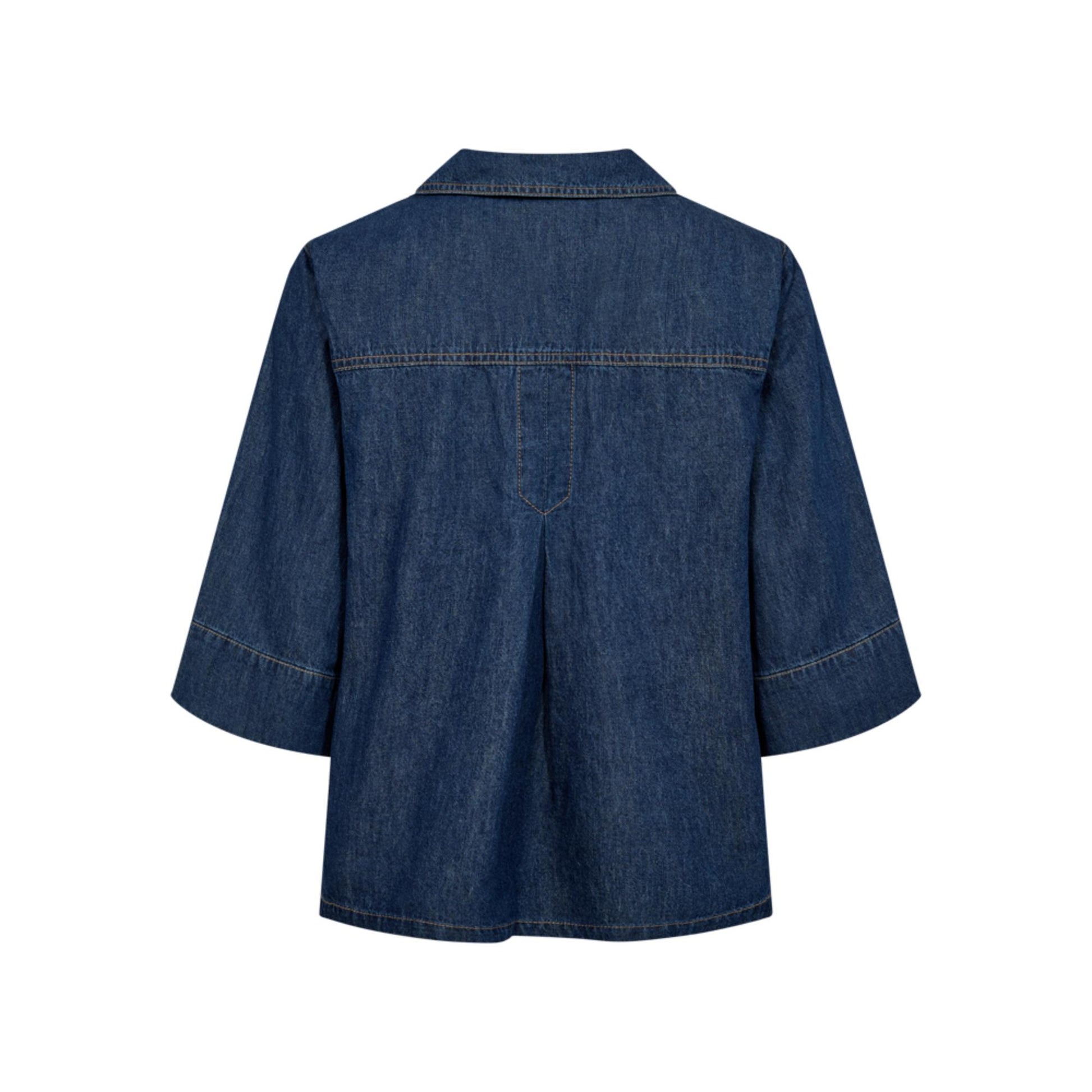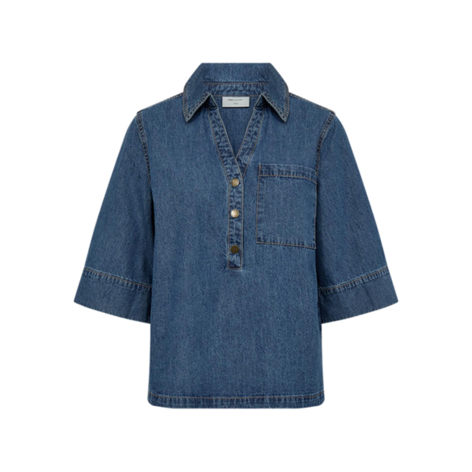 Kortærmet enkel jeans bluse i en tynd lækker kvalitet. Den har v-hals med trykknapper ned fra halsudskæringen og til under brystet. Den har en brystlomme. Snittet er lige. Blusen har krave ved halsen.