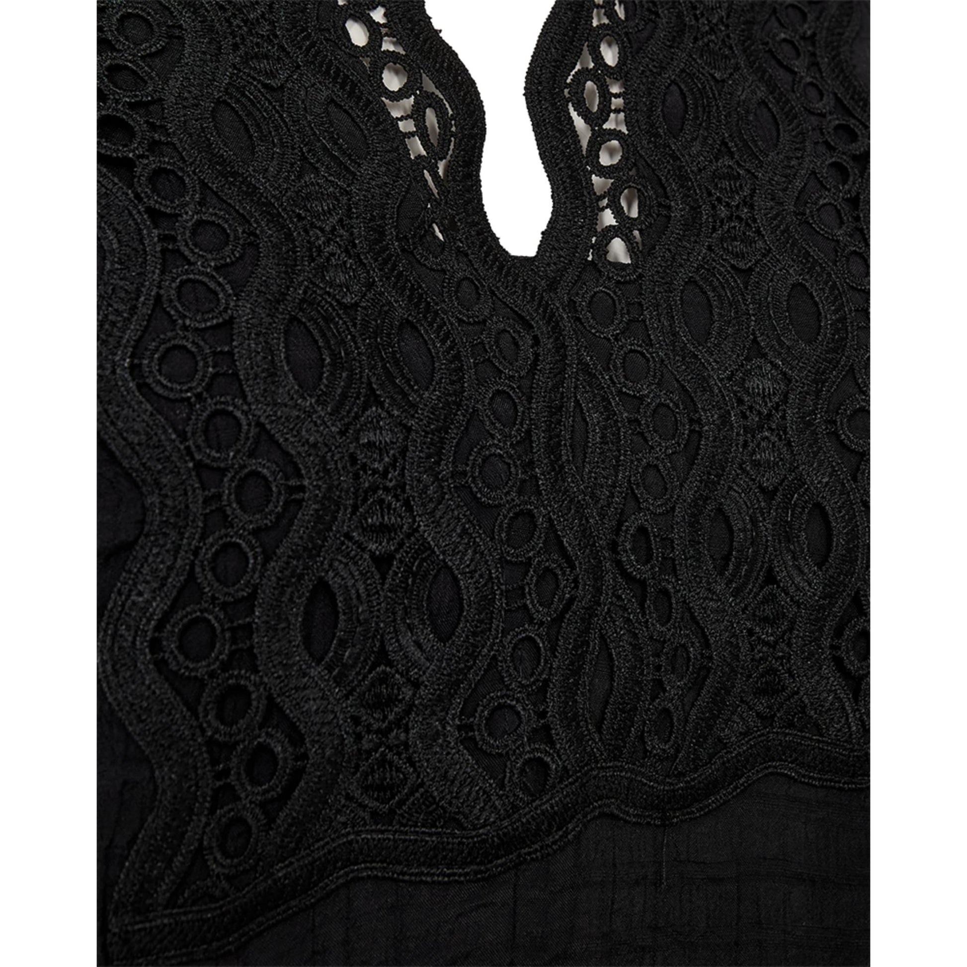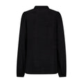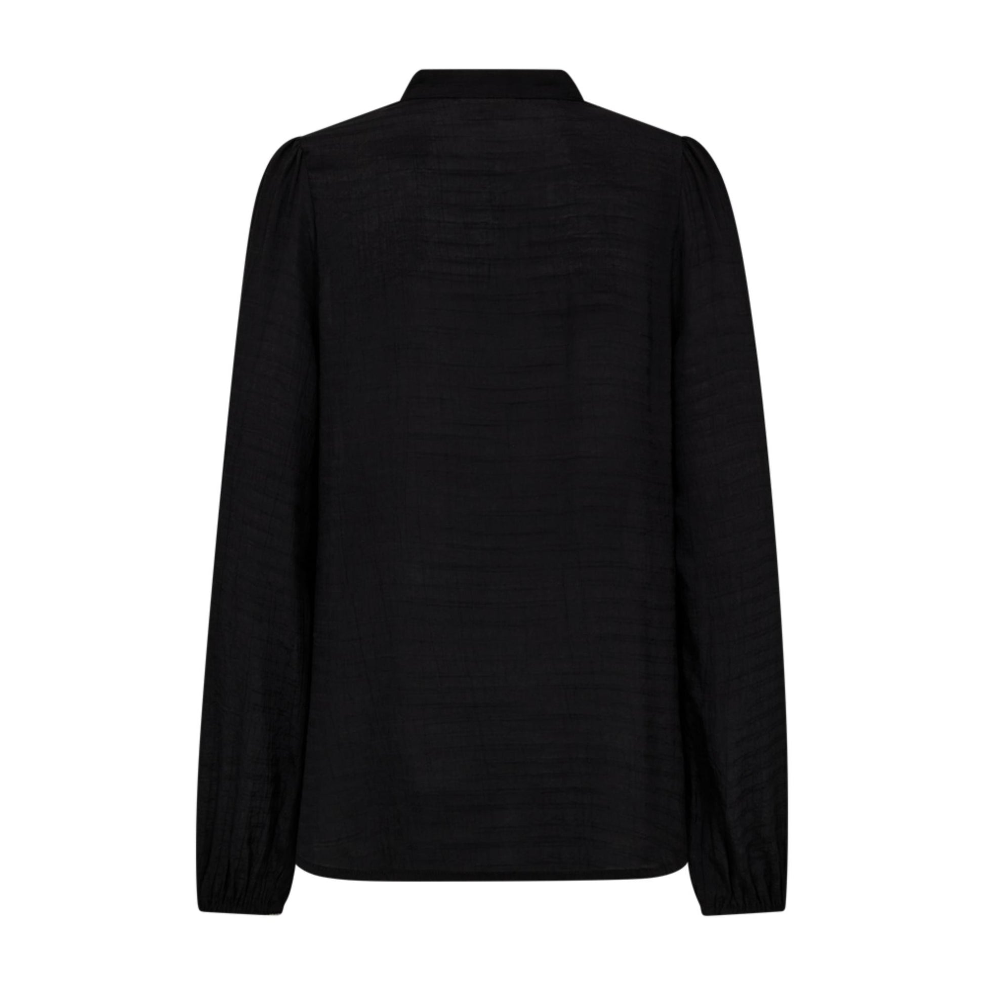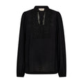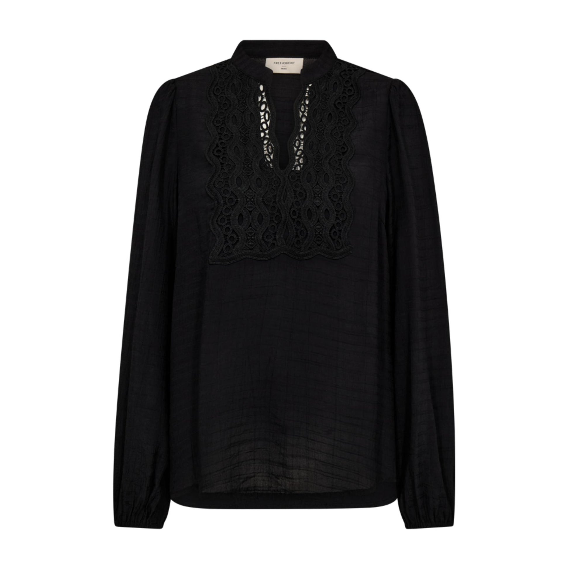 Sød bluse med lange ærmer med smal elastikkant ved ærmet. Den har v-hals med en bred blondekant ved udskæringen. Blusen har striber i metervaren, som dog er svære at se, da den er helsort.Den har pufwffwkt ved skulderen.