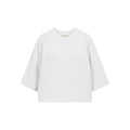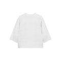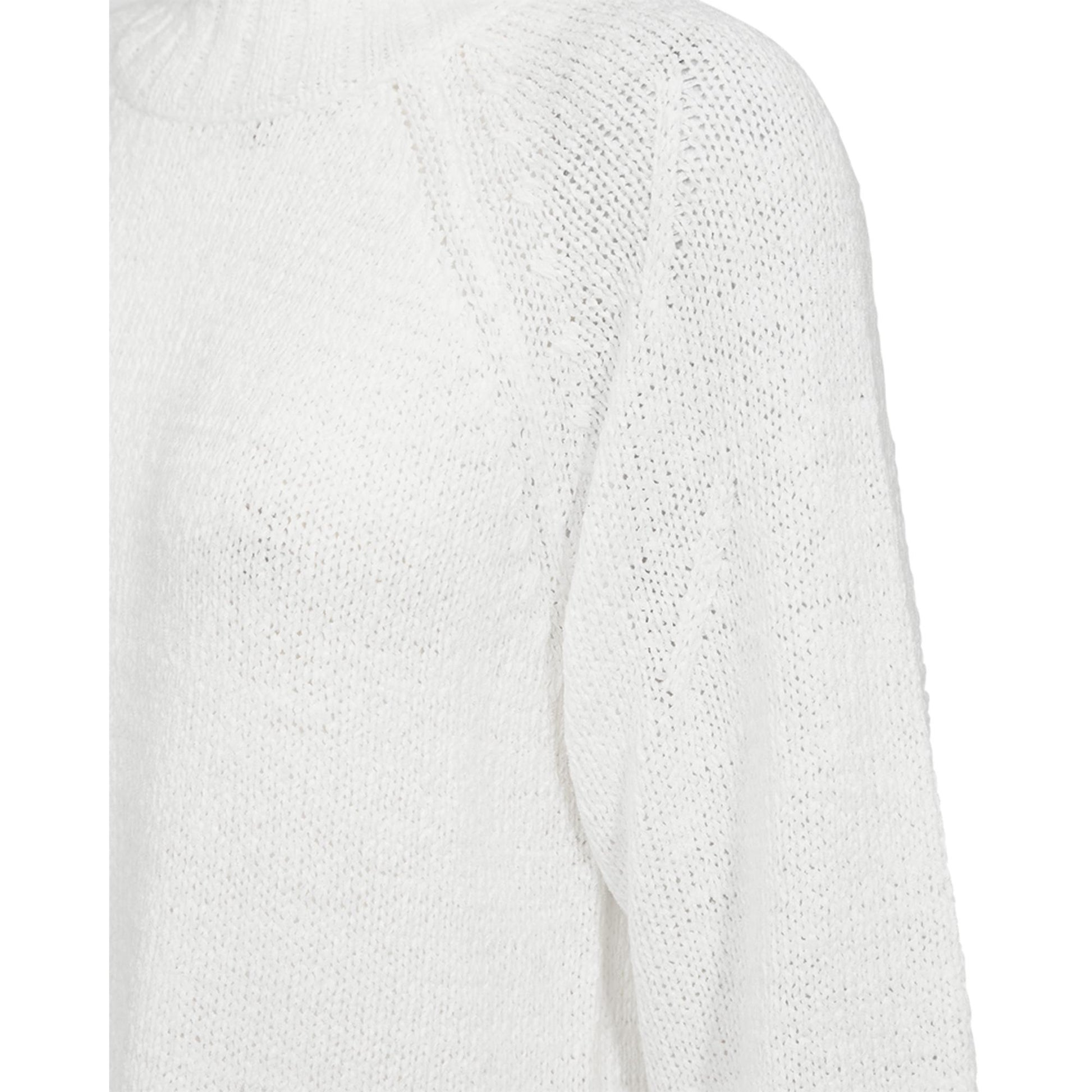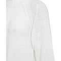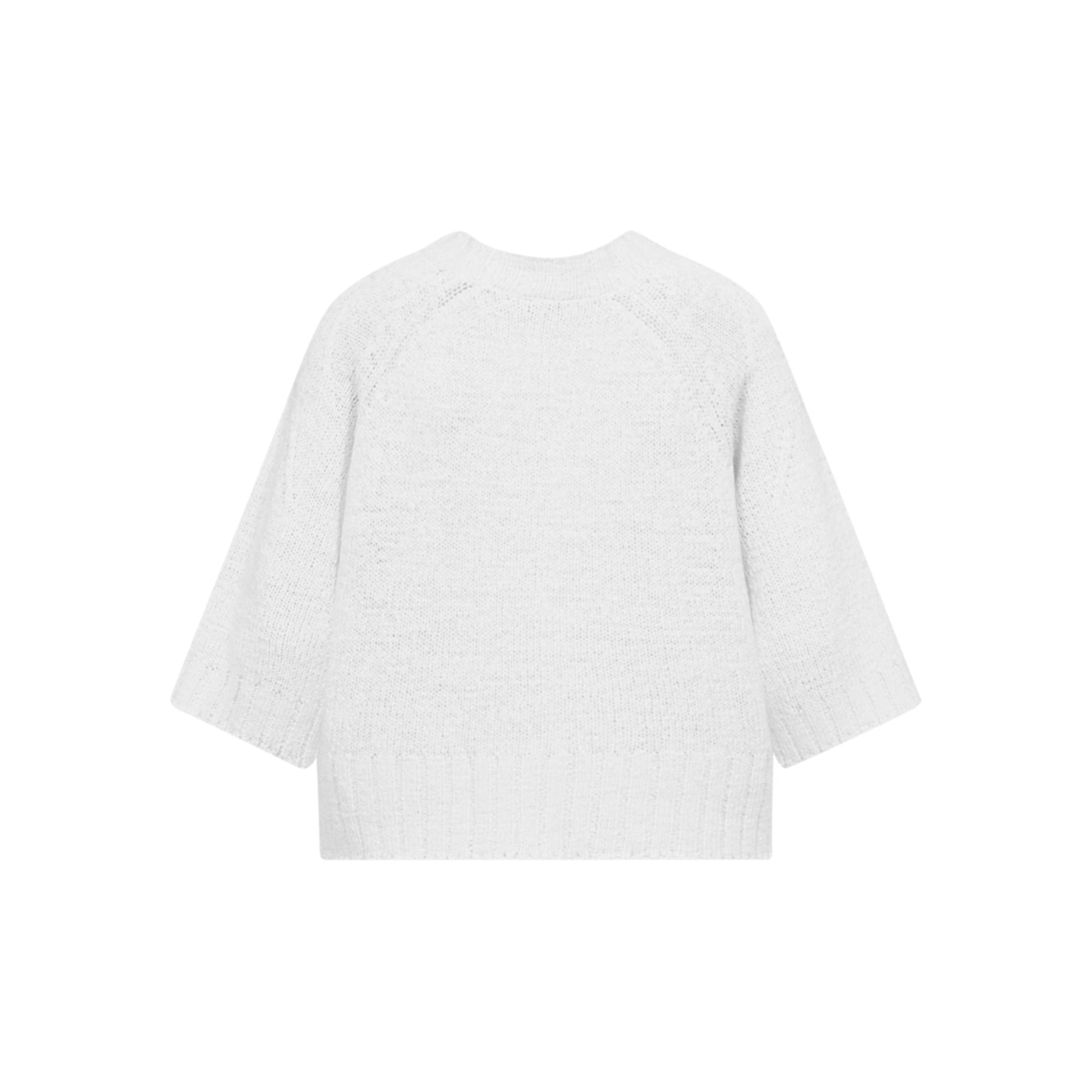 Lys lækker luftig "bånd" strik. Den har en rund og lidt høj hals. Ærmet er bredt og 3/4 og snittet er kort og lige. Strikken har god plads. Selve trådene er lidt "blanke" i udtrykket, det er det, der kaldes båndstrik.