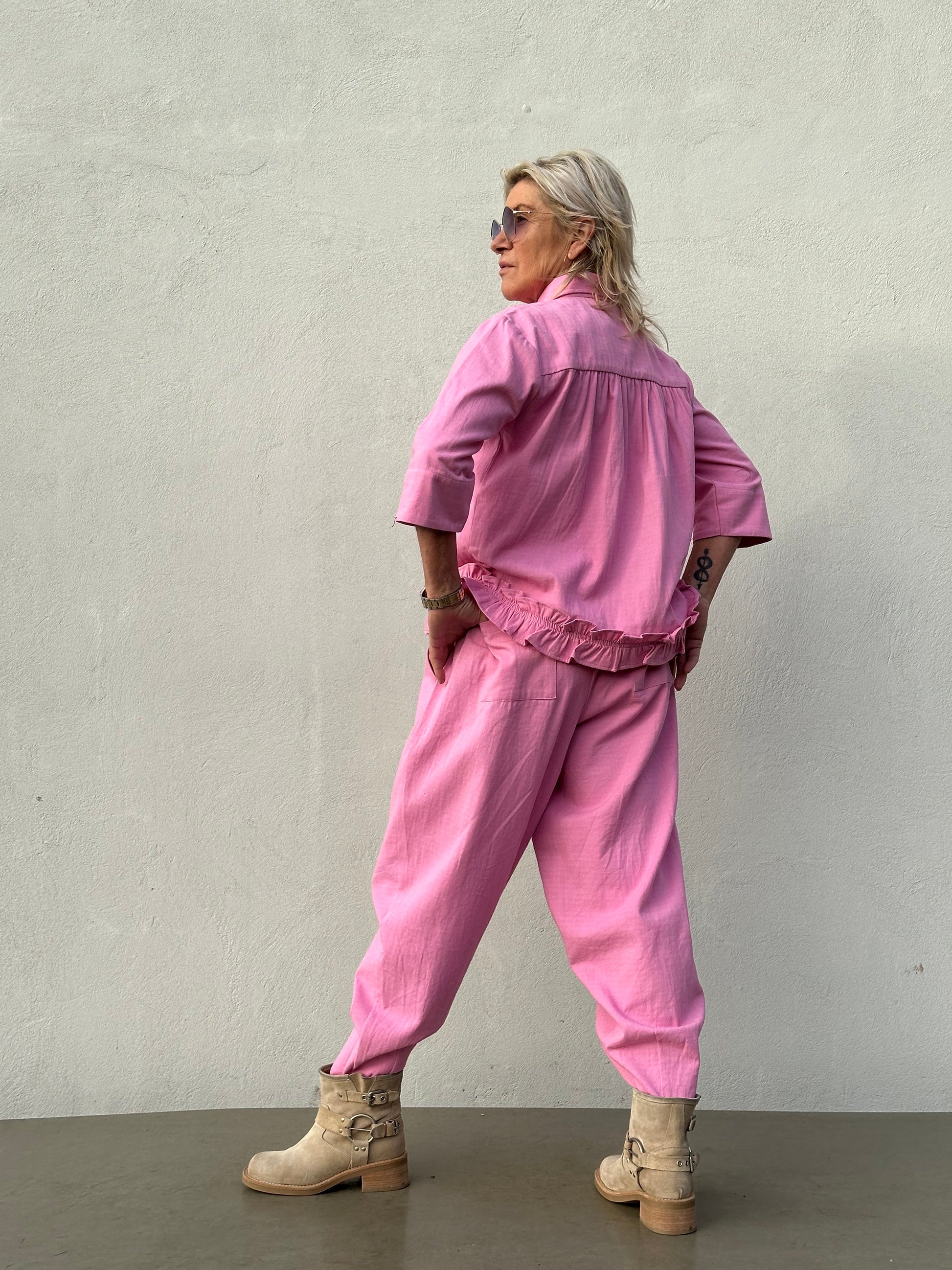 Lækker ankellang blød og tynd jeans med "ballon" effekt. Den går ind i taljen, hvor der er elastikkant bagpå i taljen. Over lårerne er den loose og så går den ind ved fødderne.Buksen har lommer i siderne. Den er til den store side.