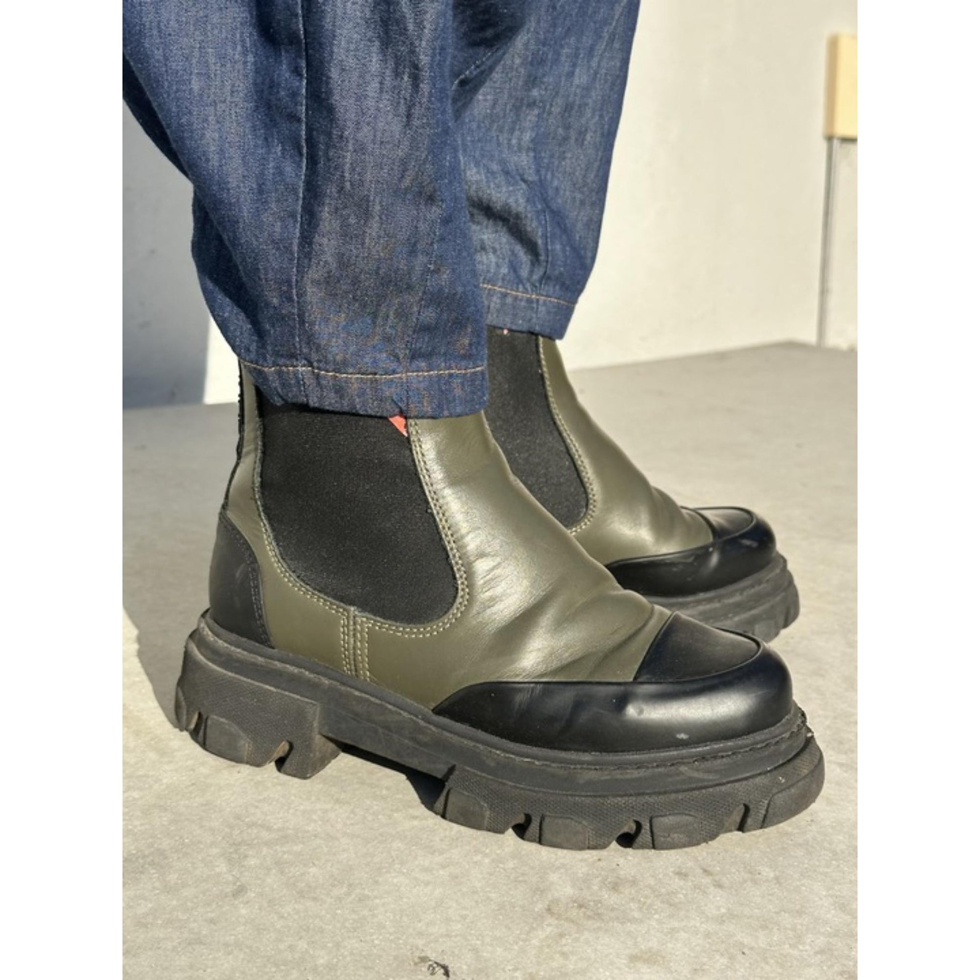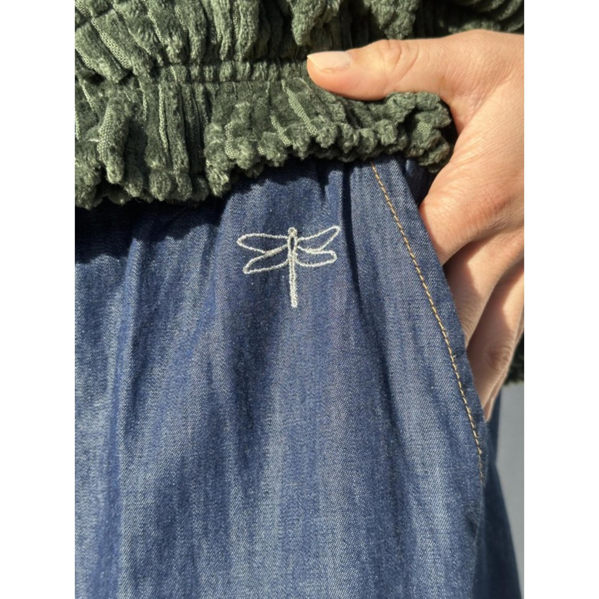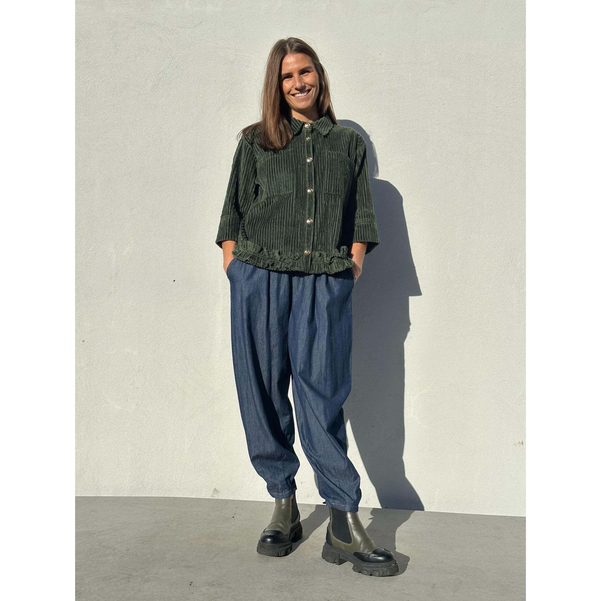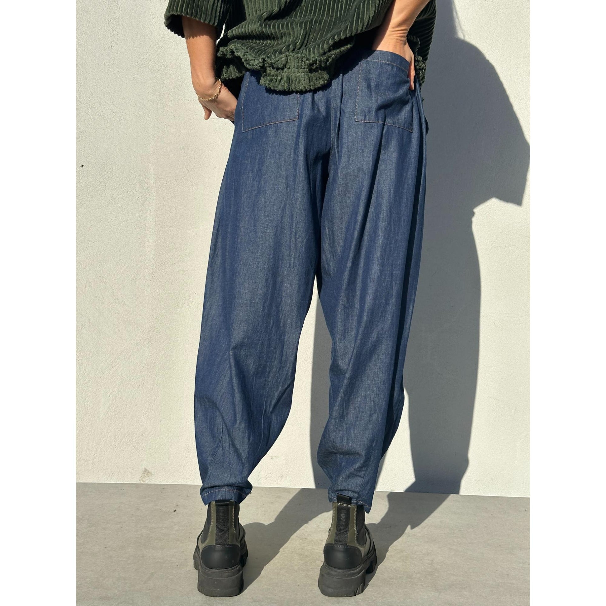 Lækker tynd jeans med god plads. Den går ind i taljen med et fast stykke foran og elastik bagpå. Den har vidde i lårerne og går ind ved fødderne.