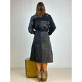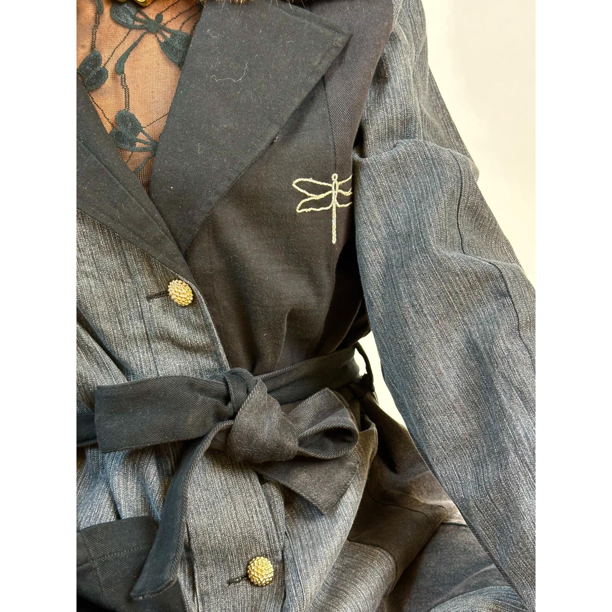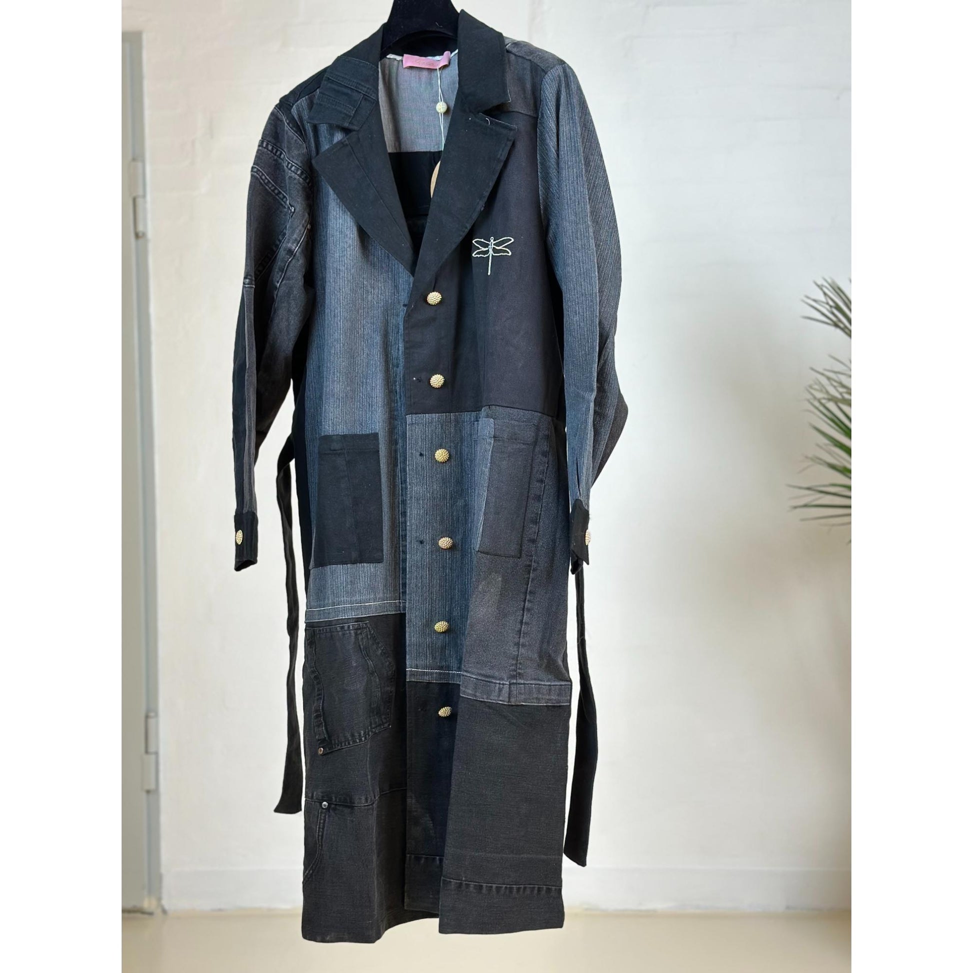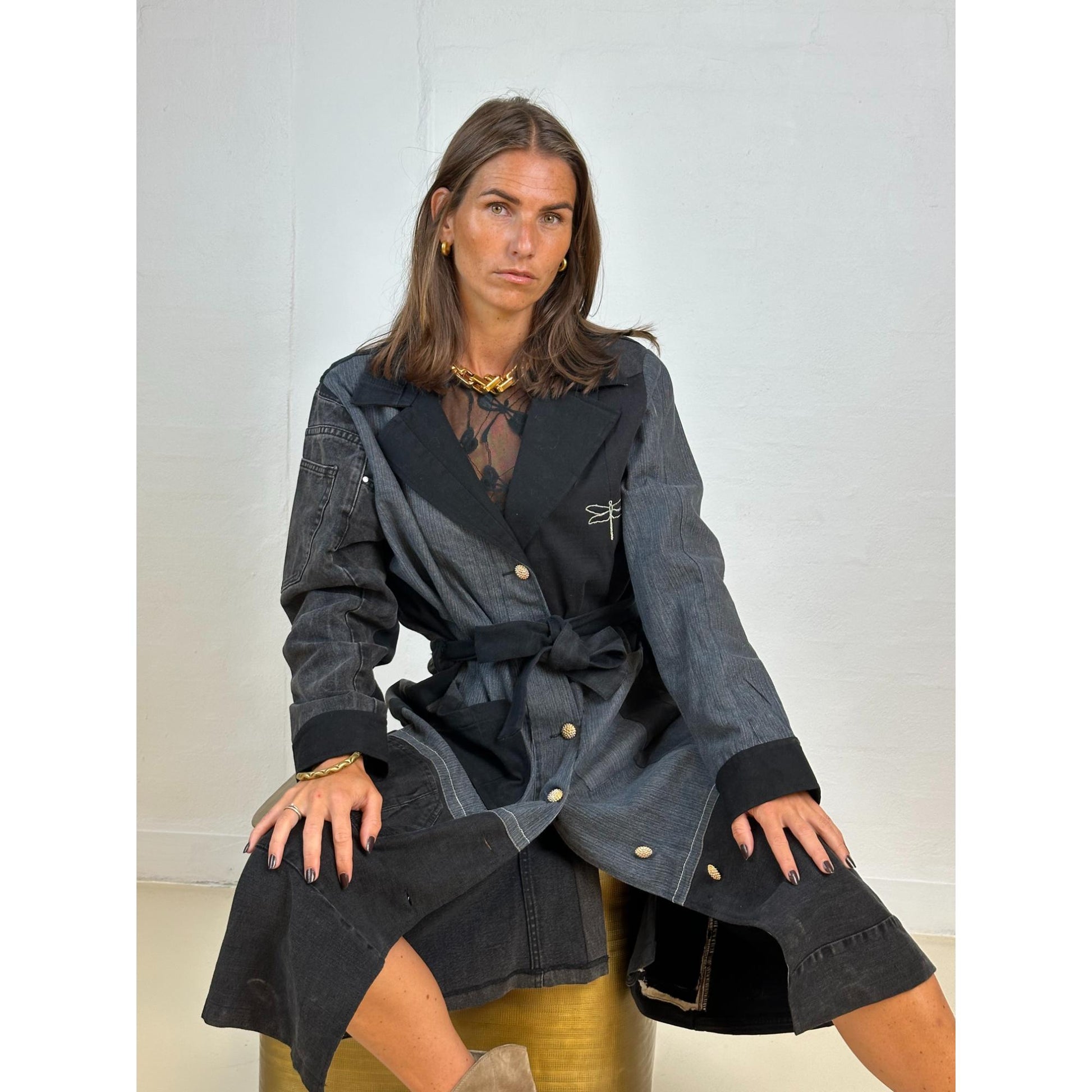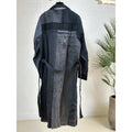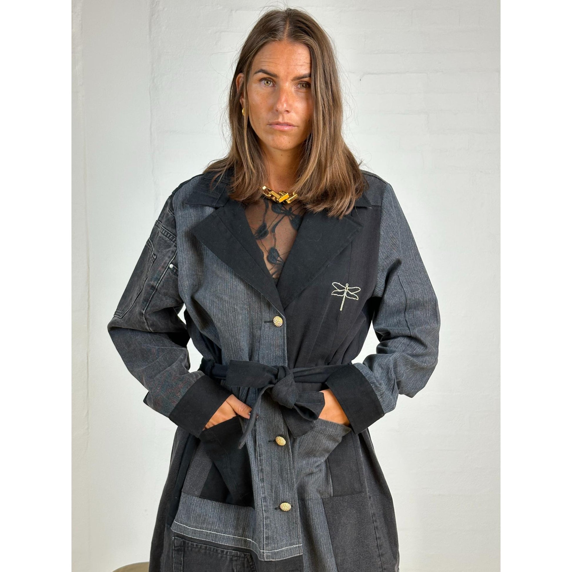 Denne frakke er ET UNIKA PRODUKT. De er alle forskellige, da den er syet af sort vasket genbrugs jeans, så INGEN ER ENS. Den er super blød med masser af strech. Frakken er gennemknappet med et aftageligt bindebælte i taljen. Den har Gaspars smukke knapper og den har lommer foran.
