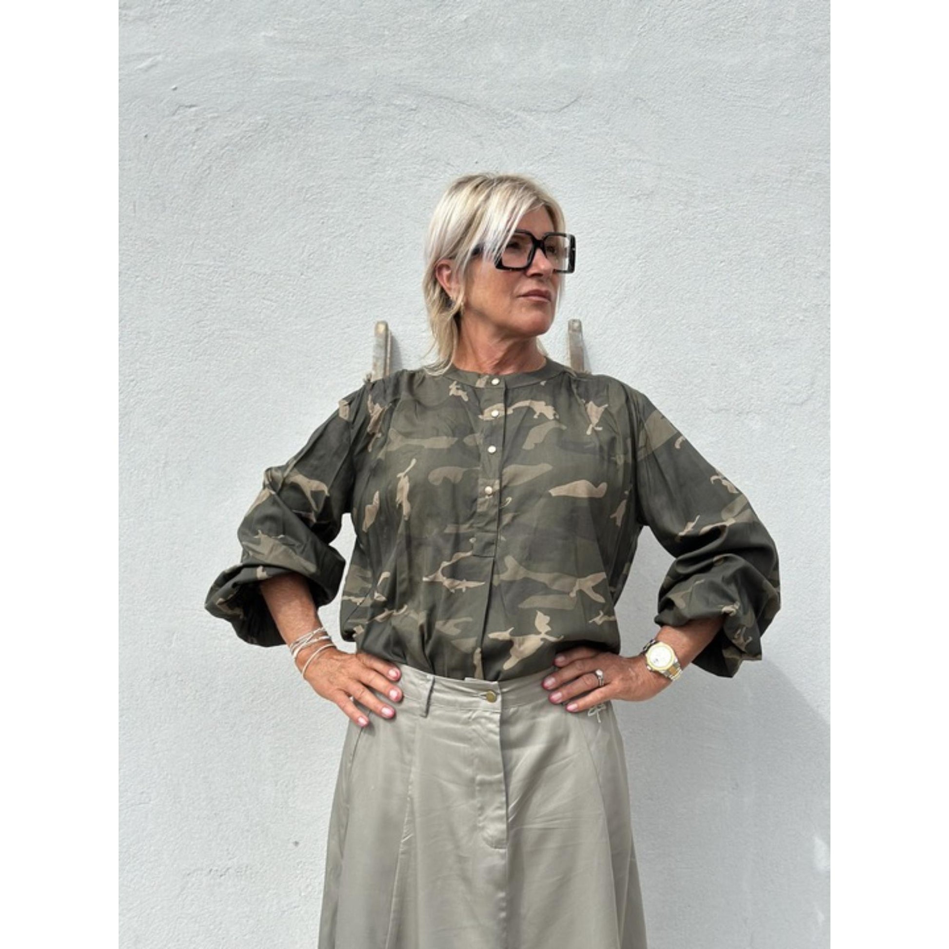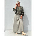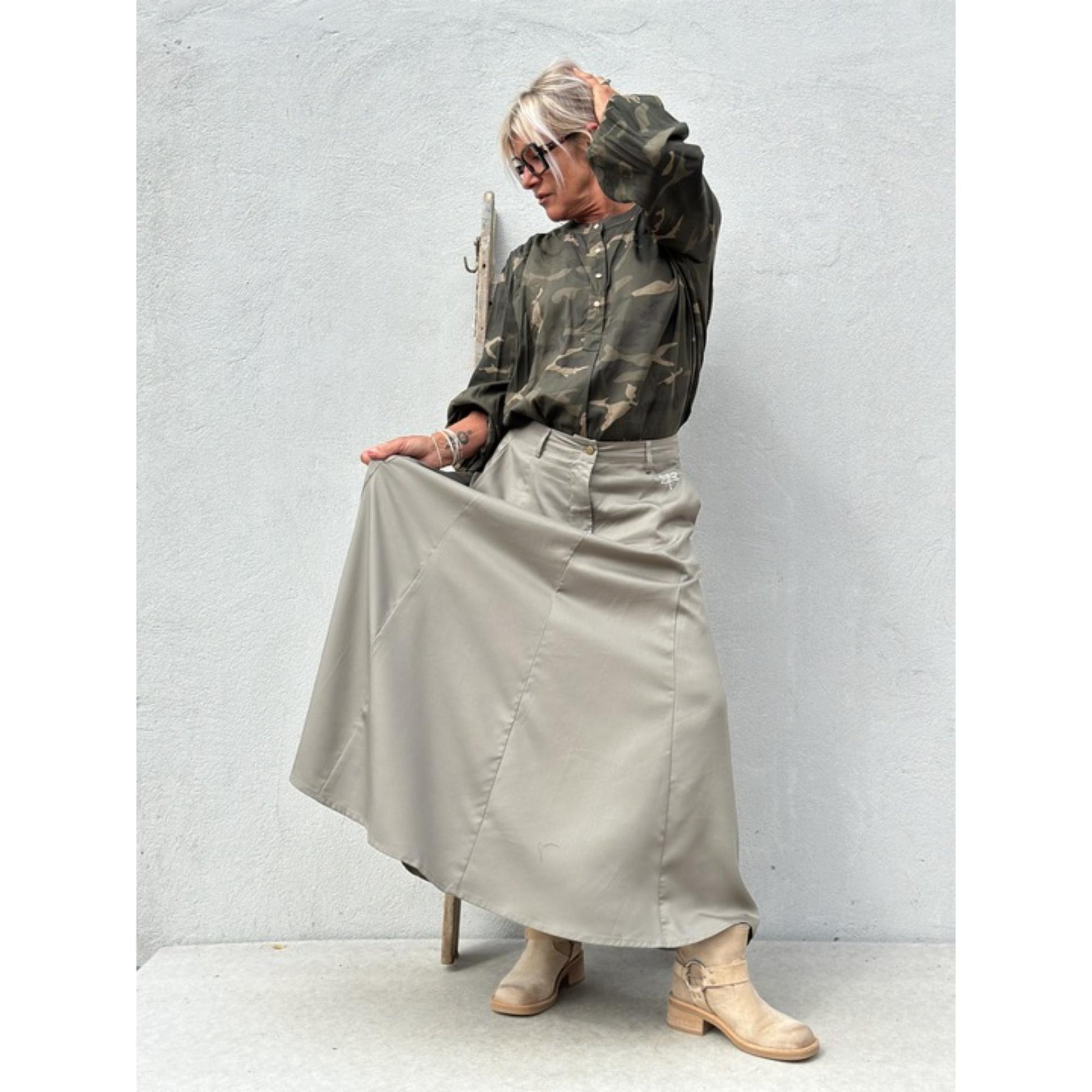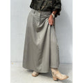 Lækker lidt kraftig lang nederdel med masser af vidde forneden. Den sidder til foroven og har ekstra vidde forneden. I taljen har den både et fast stykke samt elstik i siderne, så den sidder ordenligt til, plus knap og lynlås. Den har lommer i siderne.