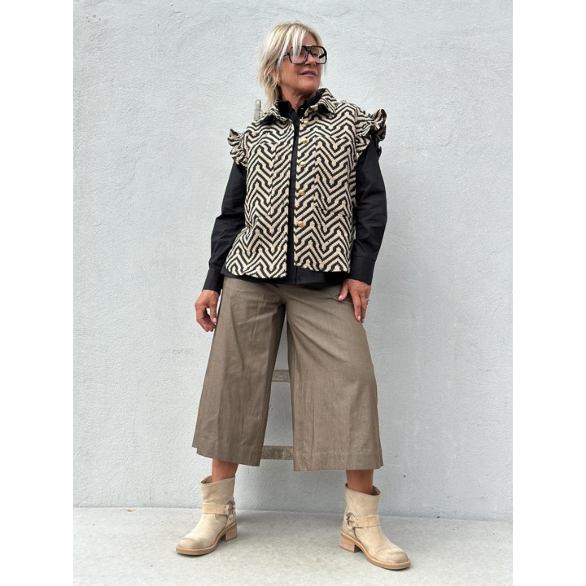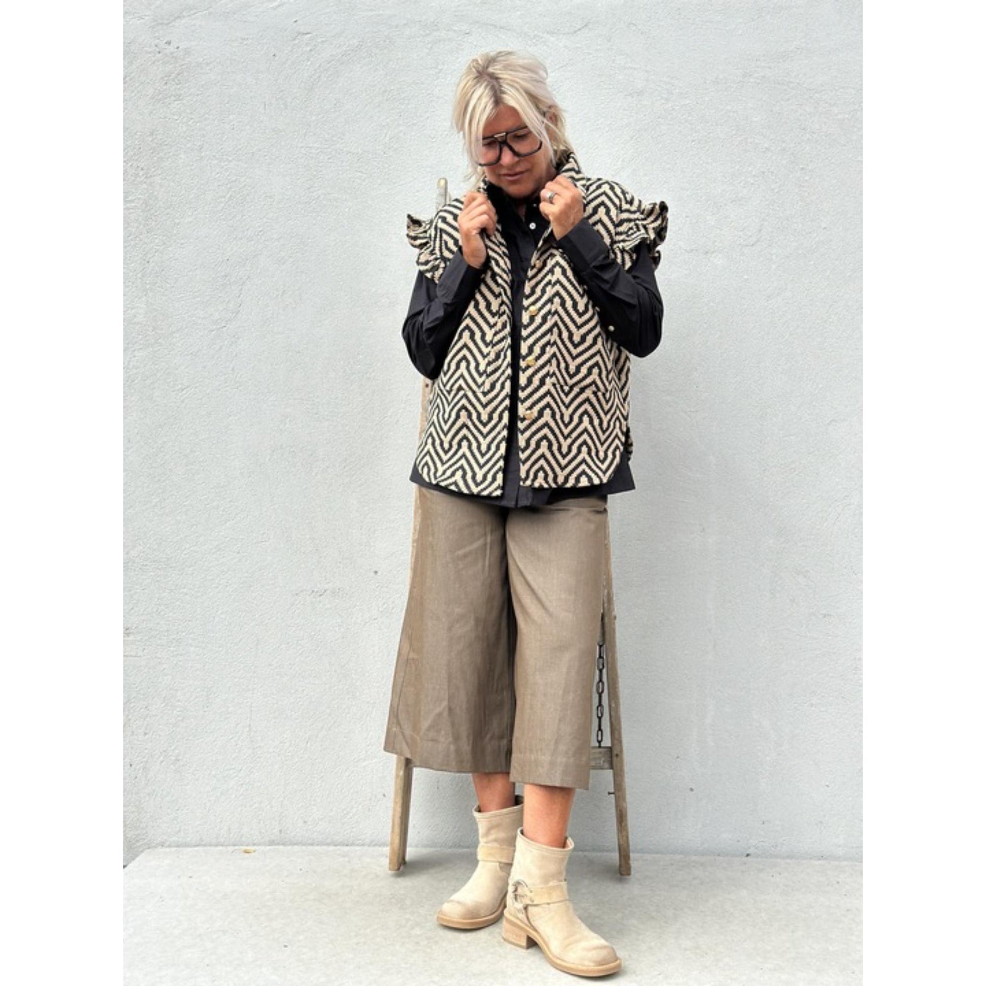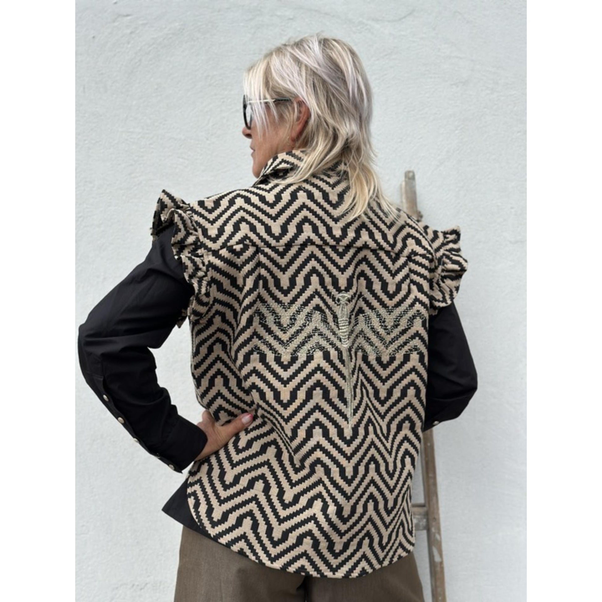 Lækker og meget kraftig ved med et lige snit. Den har en lille flæsekant ved ærmeåbningen. Vesten har god plads og kan ligeledes bruges lukket. Den har Gaspars smukke kanpper. Bagpå ryggen har den Gaspars flotte logo. Den er virkelig kraftig i kvaliteten.