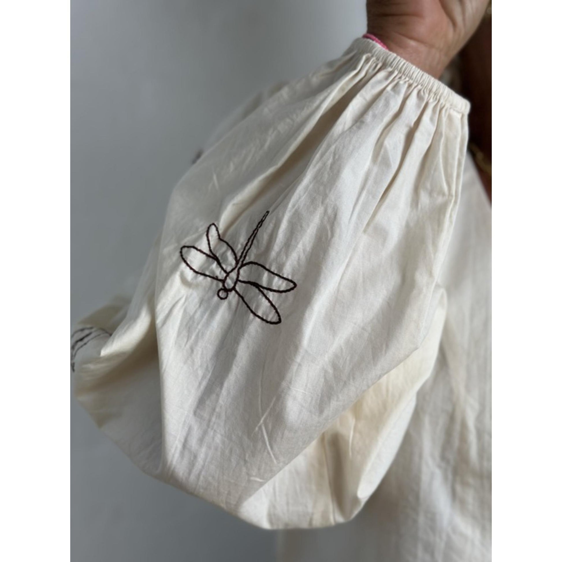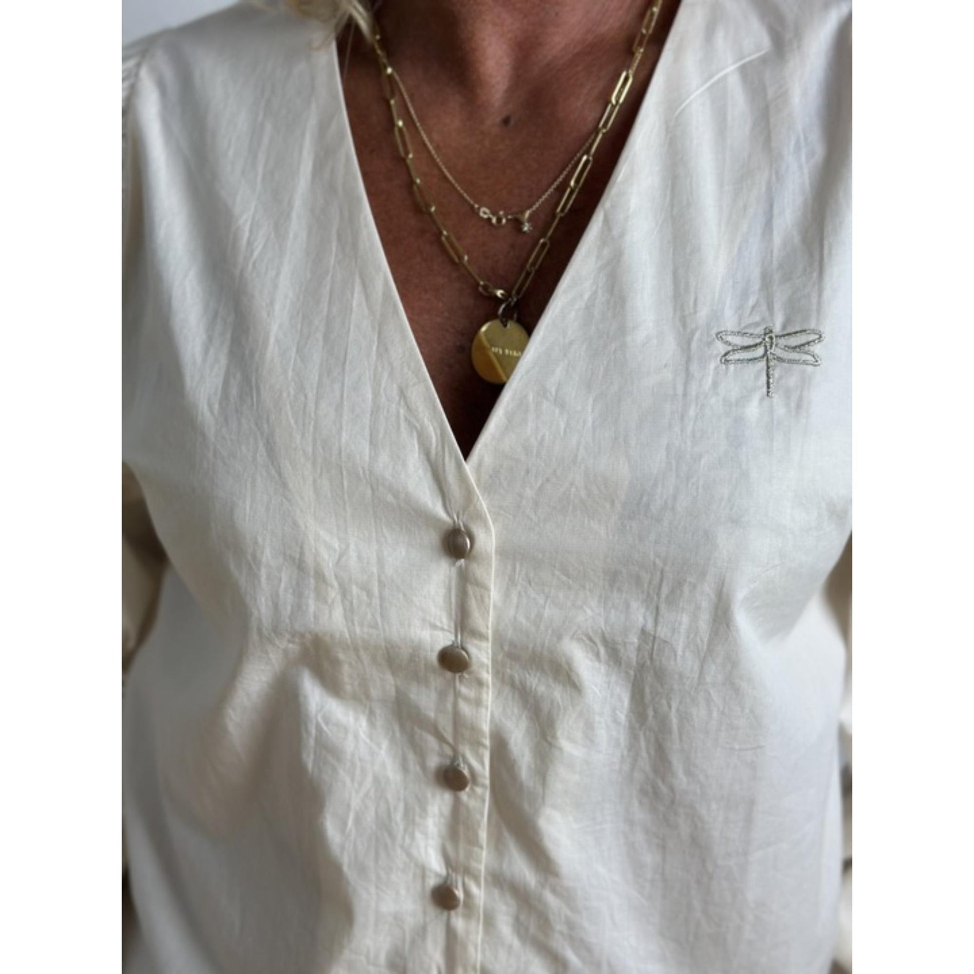 Super sød bluse med v-hals samt broderi på ærmerne. Blusen er kort og smal. Normal er Gaspar stort i størrelsen. Denne bluse er smal og den har ikke strech. Den er perfekt til at have indeni de brede nederdele eller de brede bukser. Æmret poser ekstra og har en smal elastikkant som afslutning.