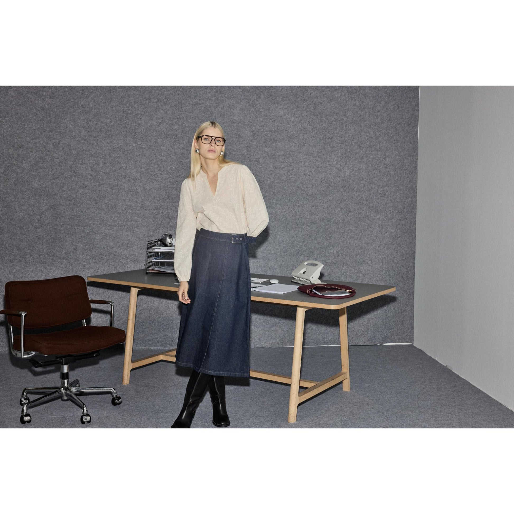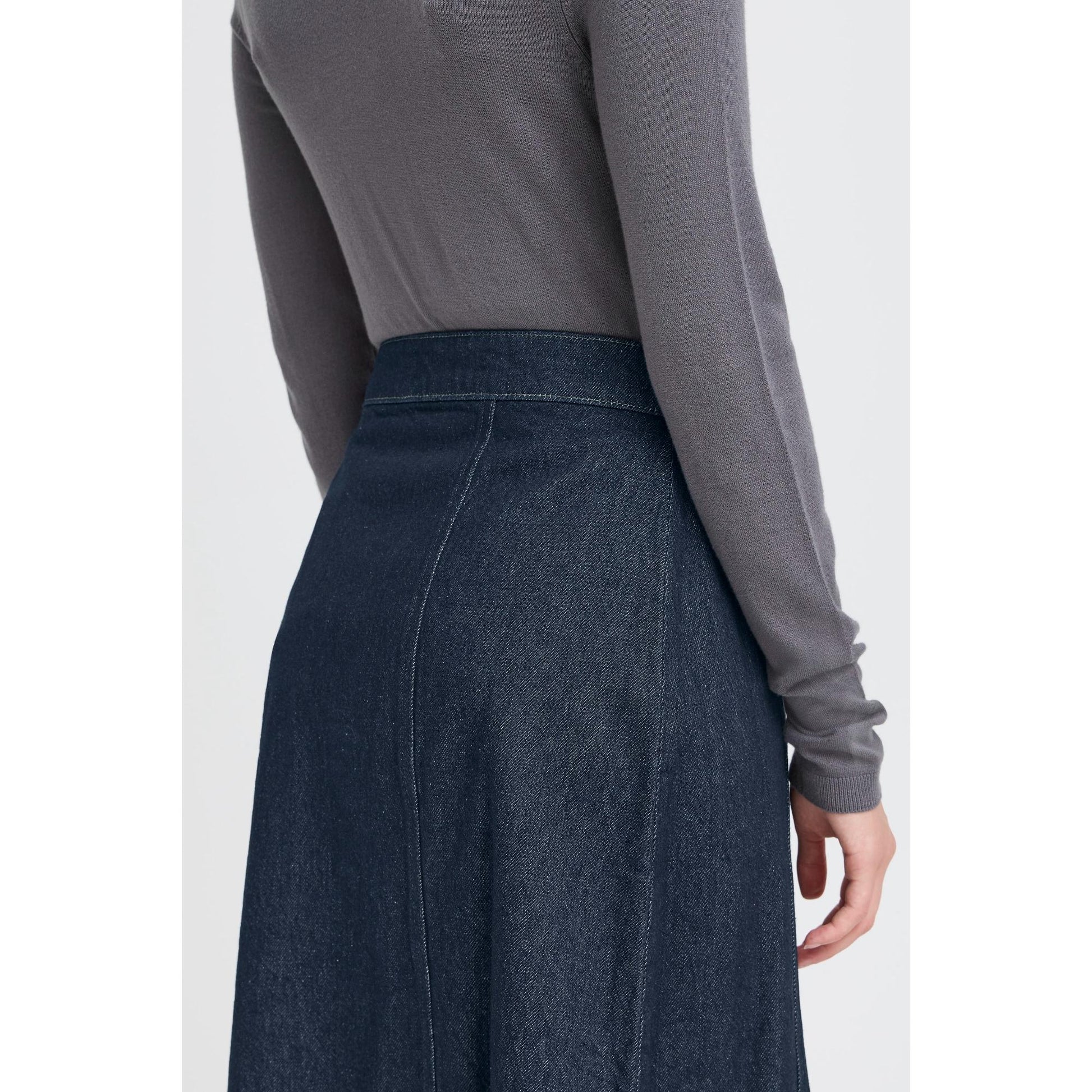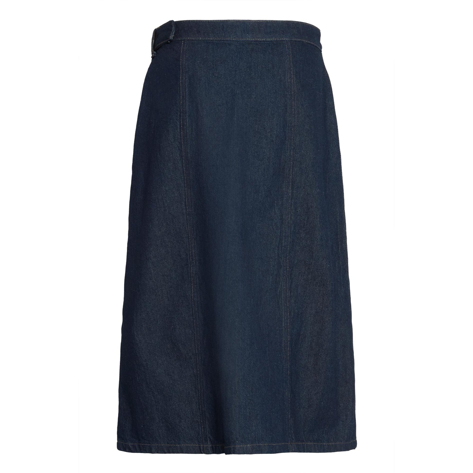Lækker kraftig jeans slå-om nederdel. Den har fast linning, der kan justeres. Den er lille i størrelsen. Længden går til ca. skinnebenet. Nederdelen er smal foroven og går ud i vidde forneden.