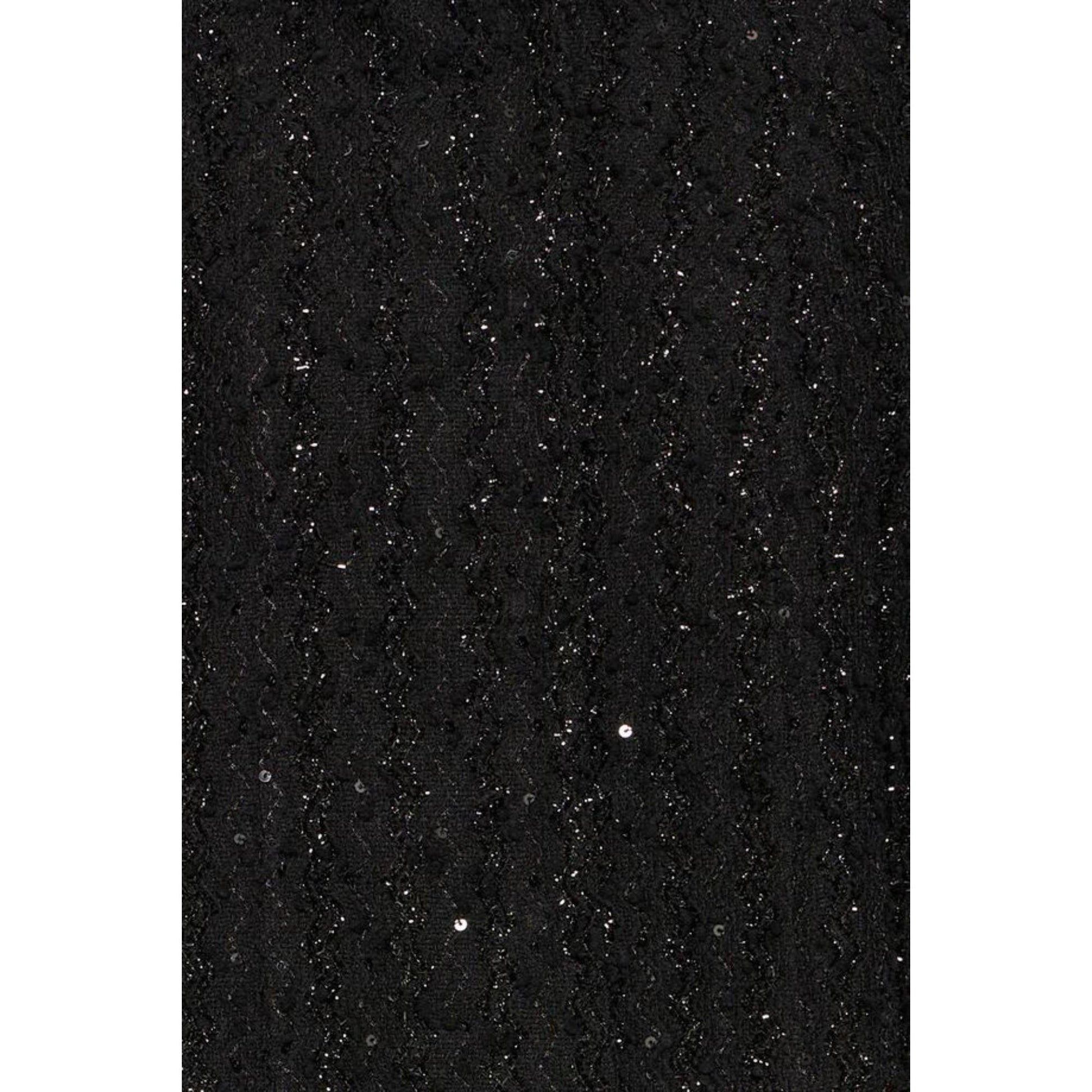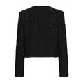 Kort blazerjakke med rund hals samt lange ærmer. Den er kort i snittet eller s almindelig i størrelsen. Metervaren har glimmertråde. Jakken har skjulte trykknapper.