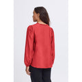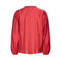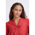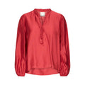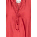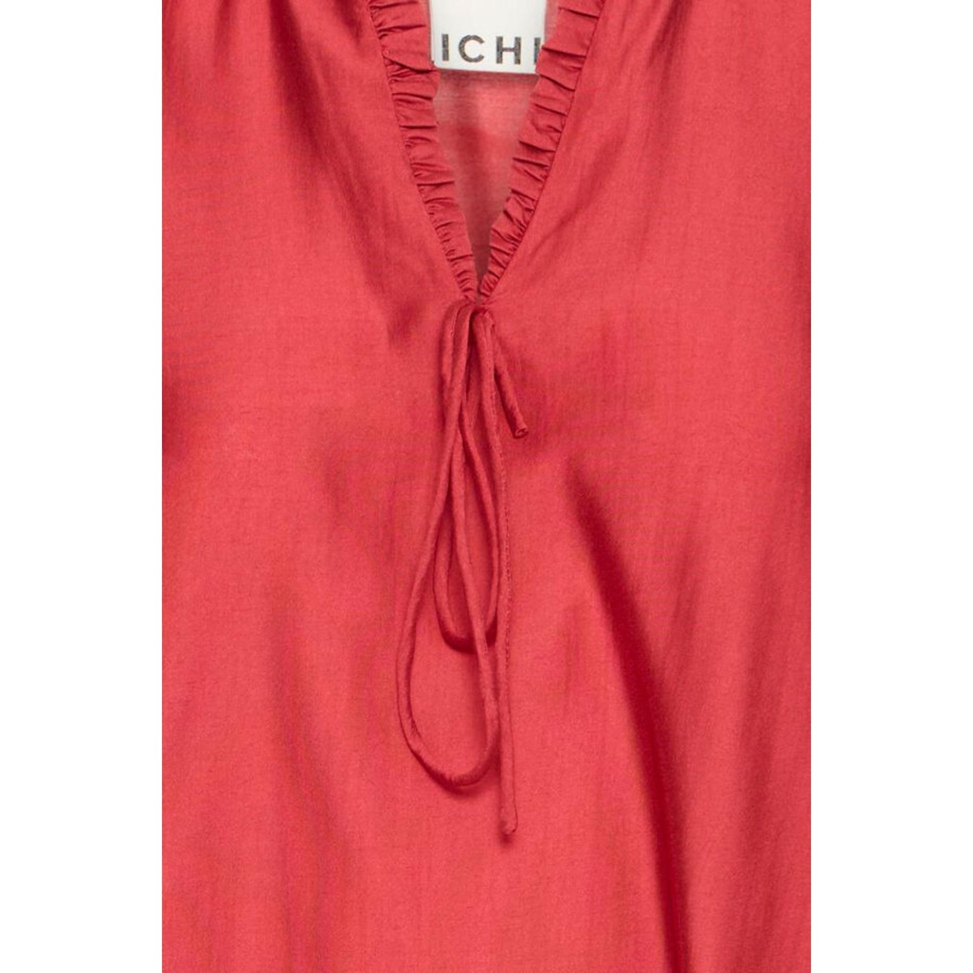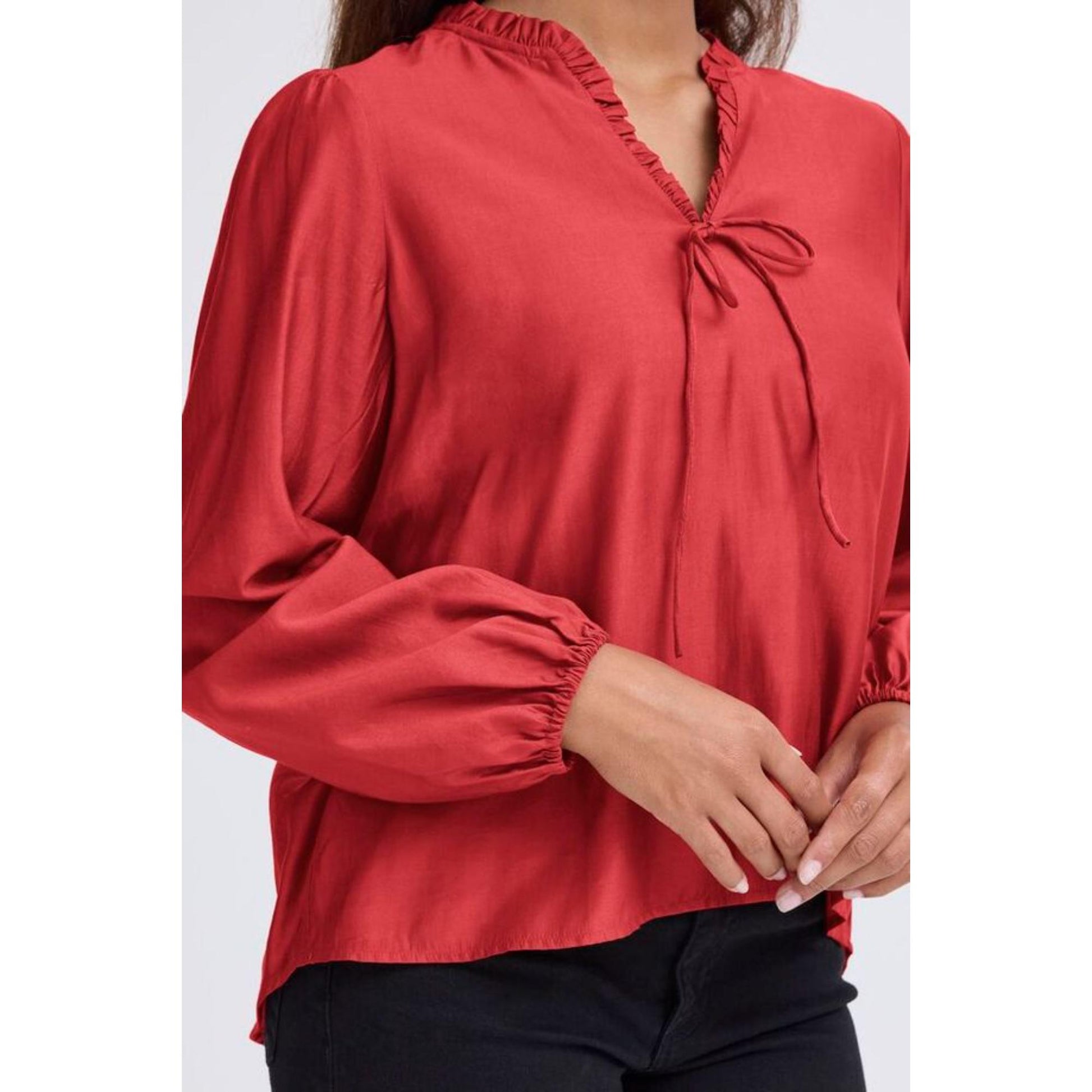 Sød enkel bluse med v-hals, samt snøre ved halsen. Den har en lille flæsekant som krave. Blusen har lange ærmer med en smal elastikkant som afslutning.