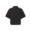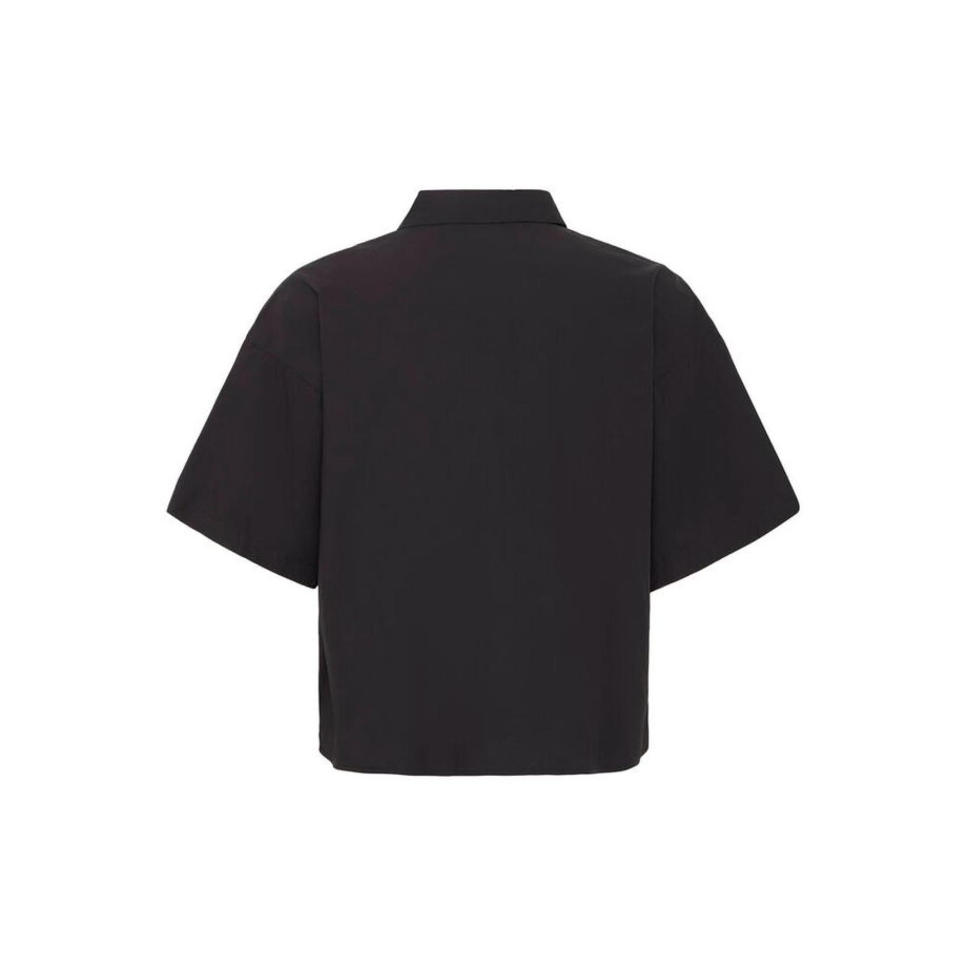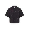 Sød kort og lidt bred sort bomuldsbluse med kort ærme samt med krave ved halsen. Den har "diamanter"foran. Blusen har knapper ned fra halsudskæringen til ca. under barmen. Derfra har den et læg, som giver lidt vidde.