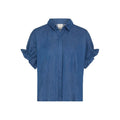 Lækker tynd jeans bluse i en lidt bred model med en elastikkant bagpå ryggen, som gør at blusen ikke bliver så bred i modellen. Det gør også at den går lidt ind forneden. Den har et kort ærme med en elastikkant, som giver en flæse. Blusen har god plads.