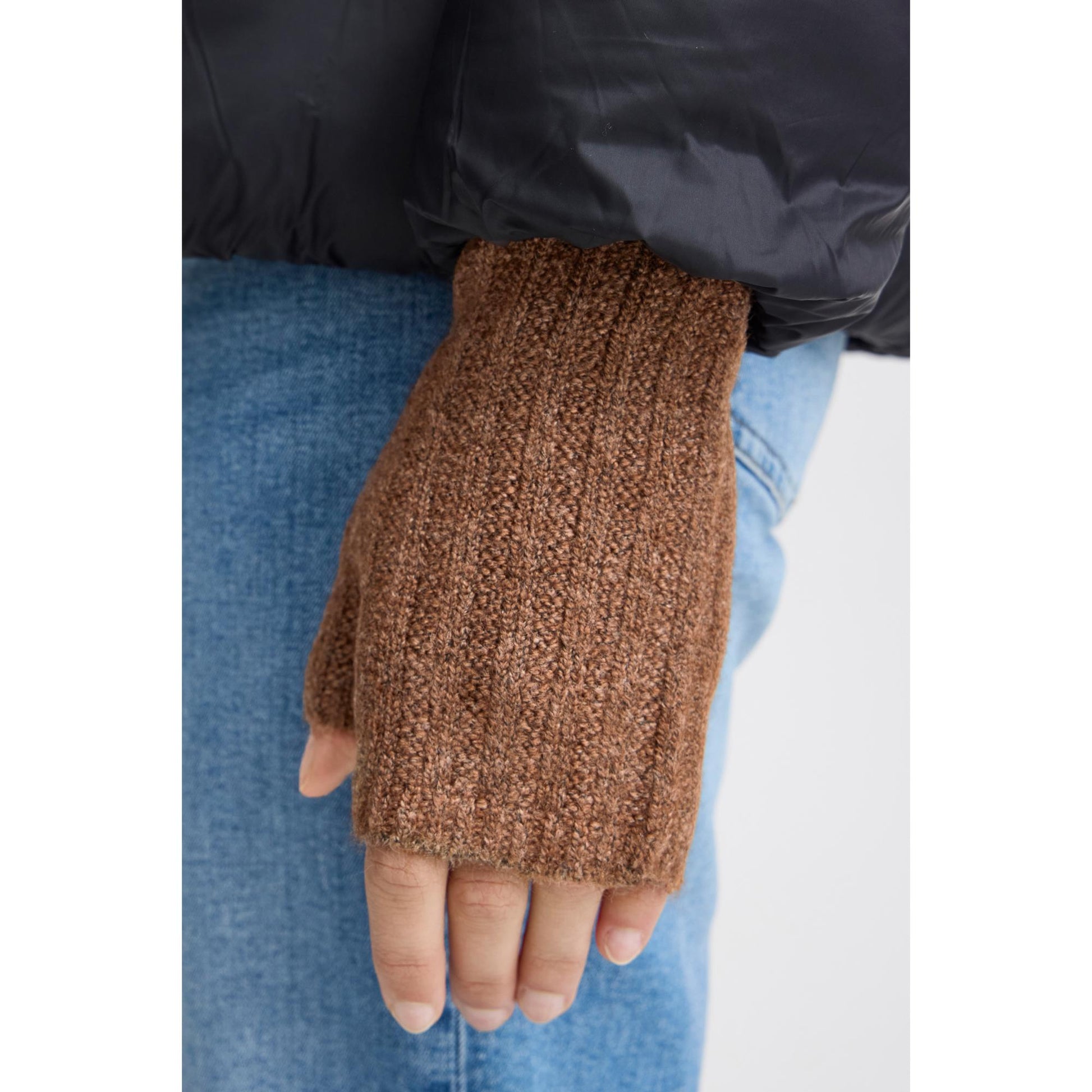 Lækker blød halv handske. Den er i en strikket kvalitet, og den er halveret, så fingrerne er frie.