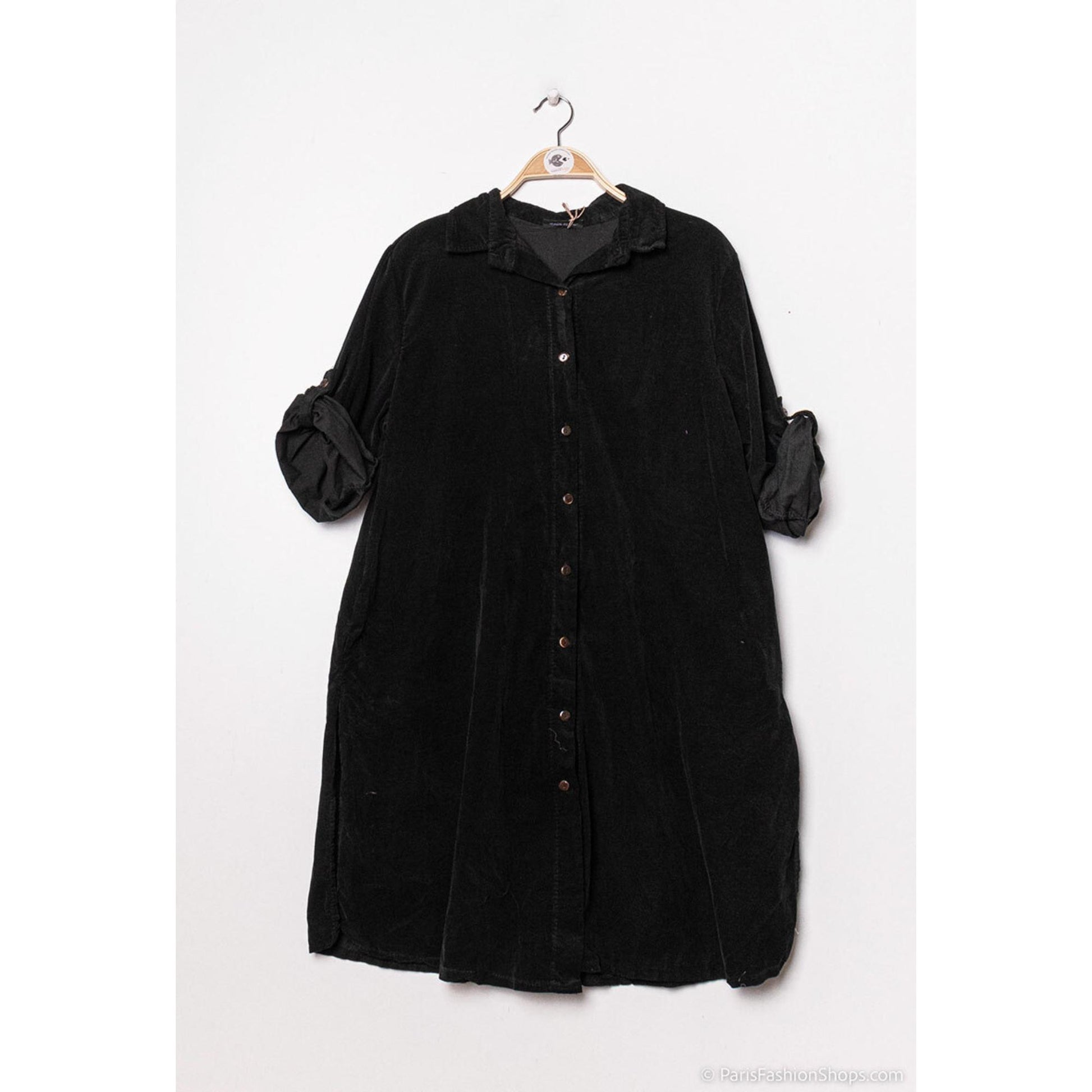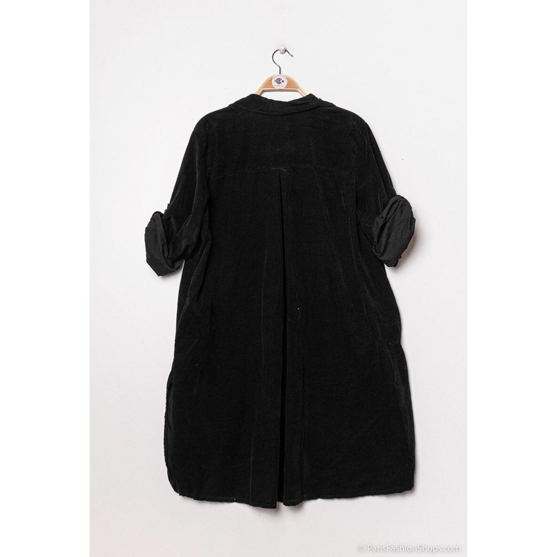Lækker blød fløjls tunikakjole. Den er stor i størrelse og har god plads. Kjolen er gennemknappet med lommer i siderne. Ærmerne er 3/4 lange og kan smøges op til et kort ærme.