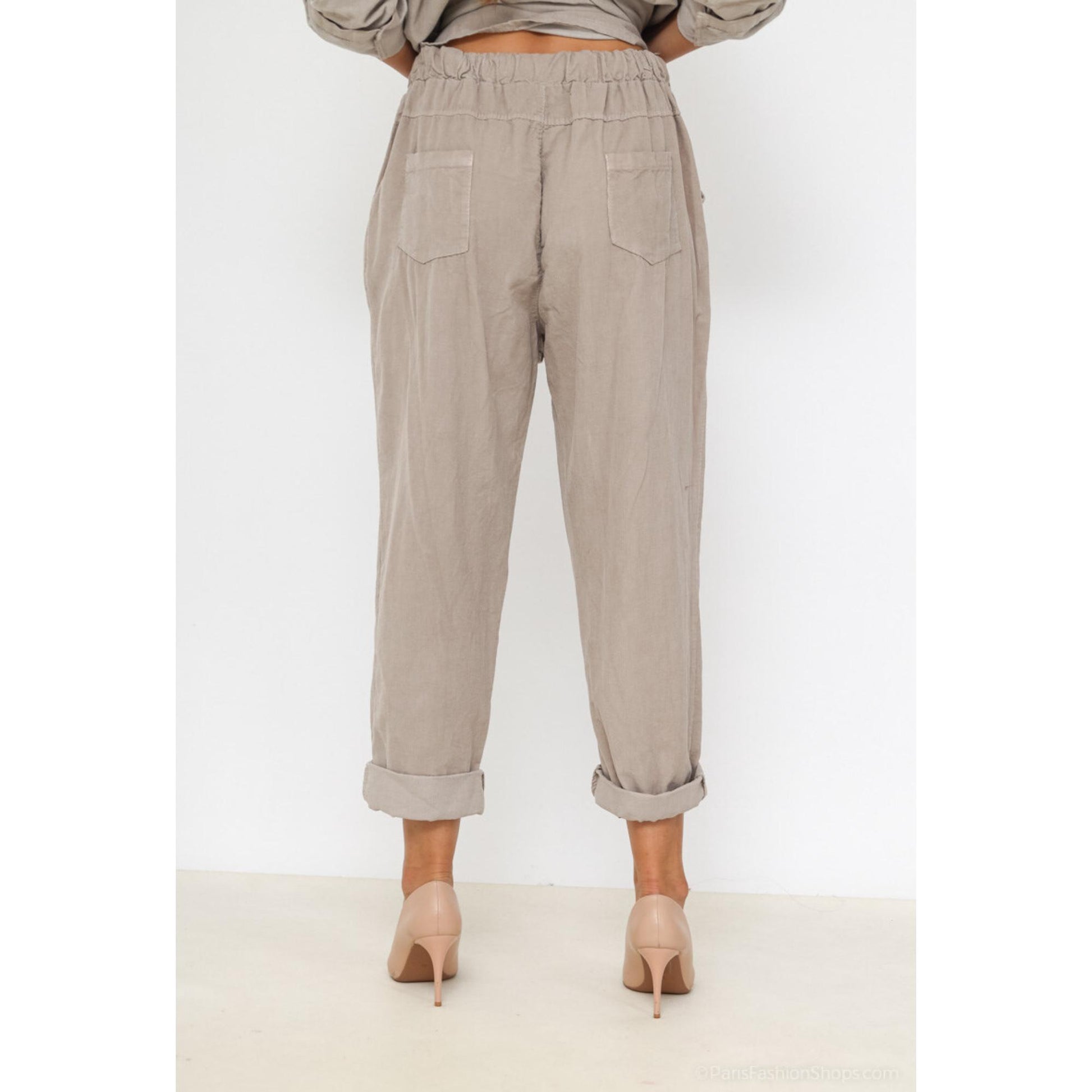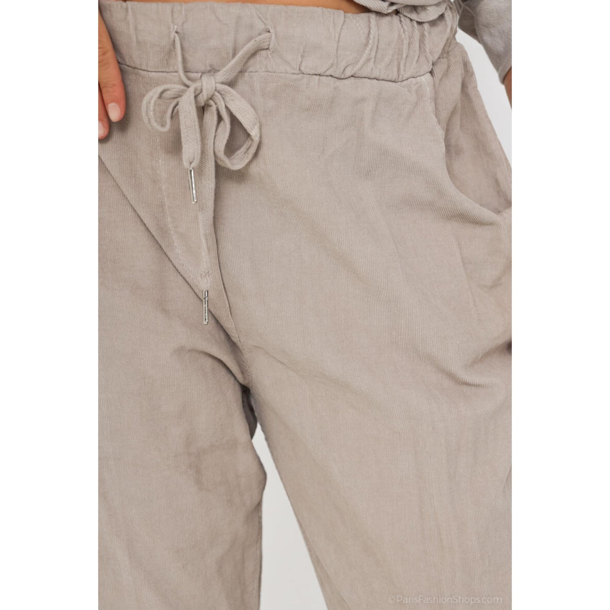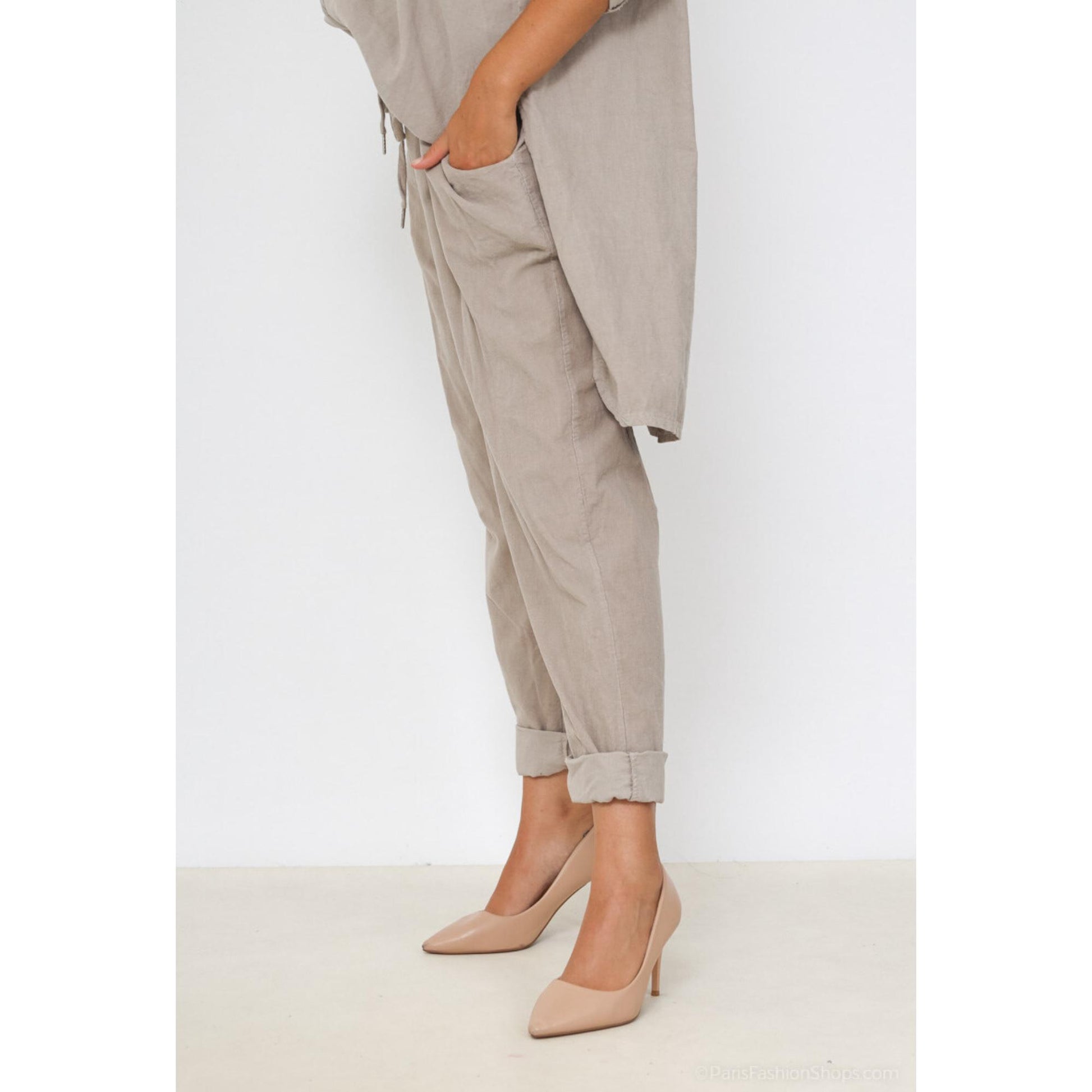 Lækker blød og loose fløjlsbuks med vidde ved numsen samt i lårerne. Den er lidt"hænge" i modellen og har god plads foroven og går ind og bliver lidt smallere forneden. Buksen har elastik samt snøre i taljen. Den er i one-size og svare ca. til en M-XXL. Længden er normal hellang.