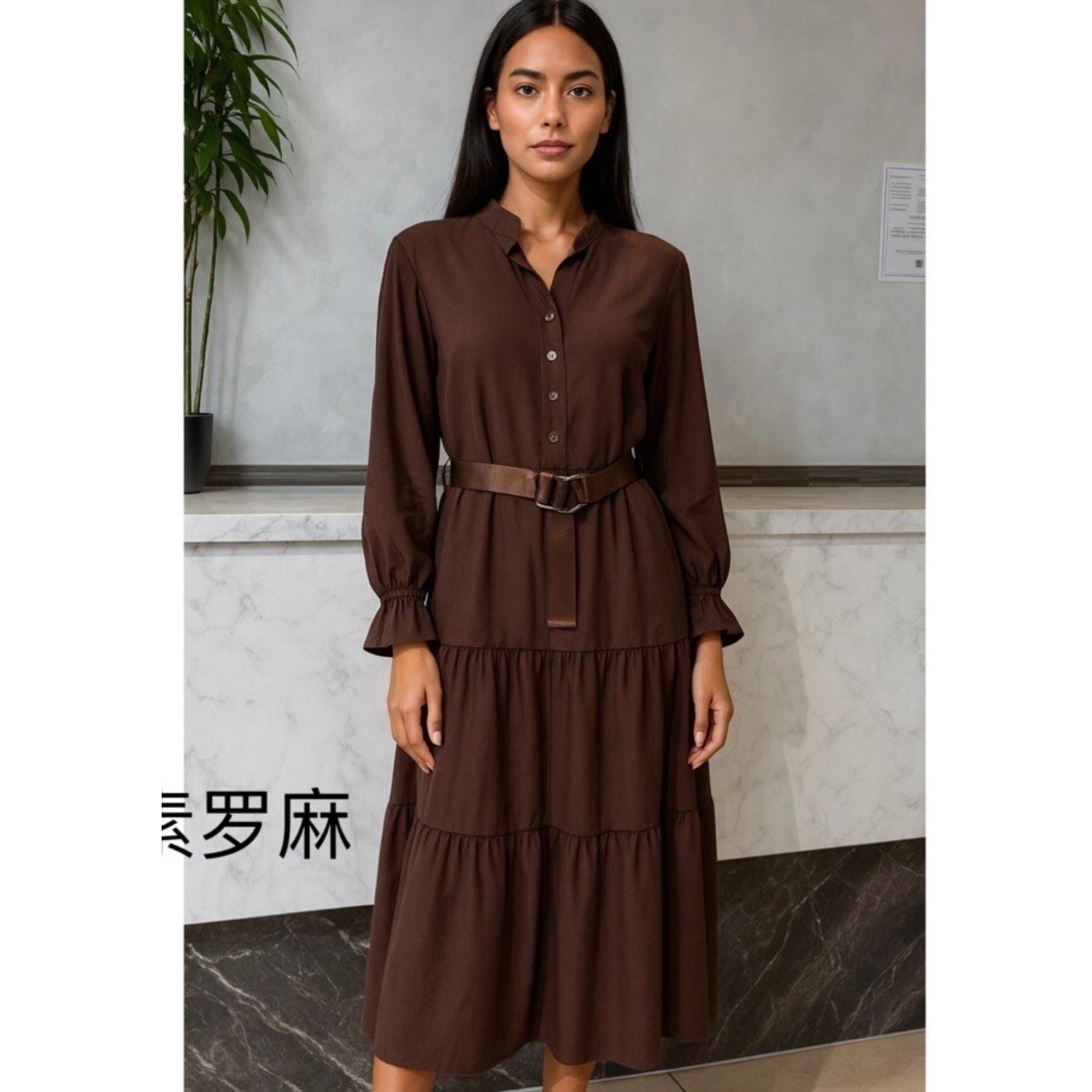 Sød halvlang kjole, der går til ca. skinnebenet. Den har god plads og er i en fast metervare. Kjolen har et aftageligt bælte til taljen.