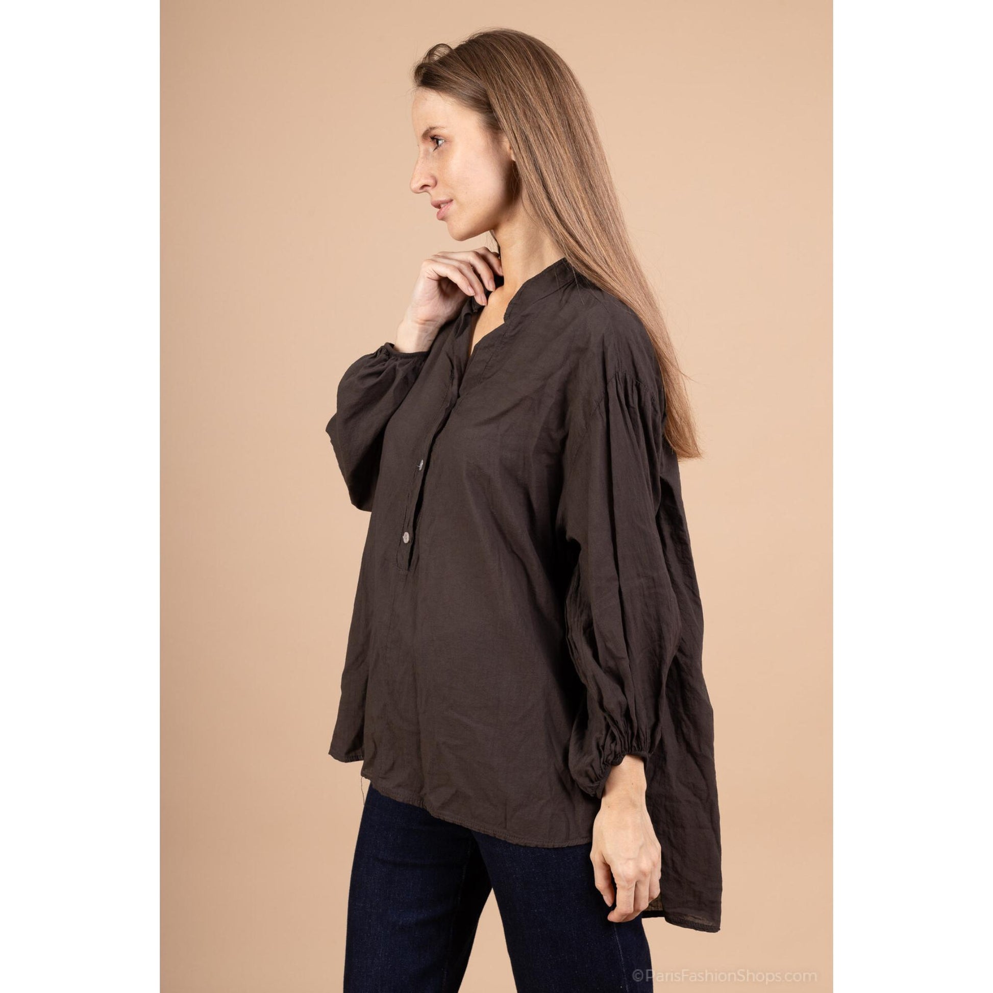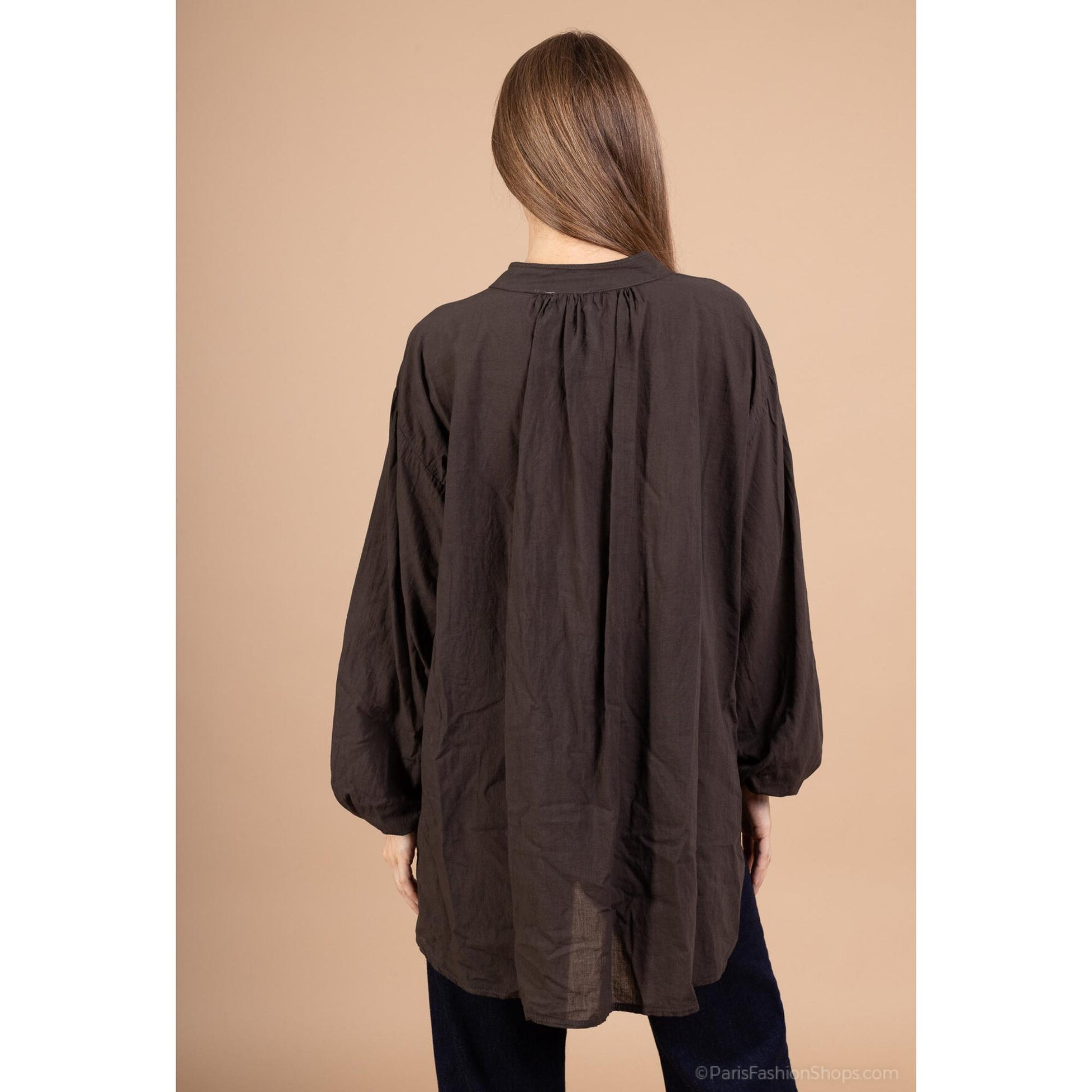 Lækker og meget tynd oversize bluse med 3/4 ærme samt med v-hals. Den er længere bagpå. Blusen har mørke knapper ned foran til under barmen. Den kræver en top under, da den er meget tynd. Blusens kanter er en syet tråd, der kan ses.