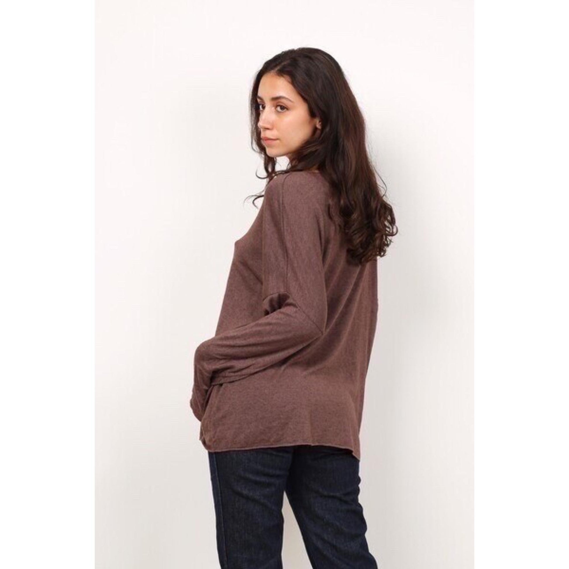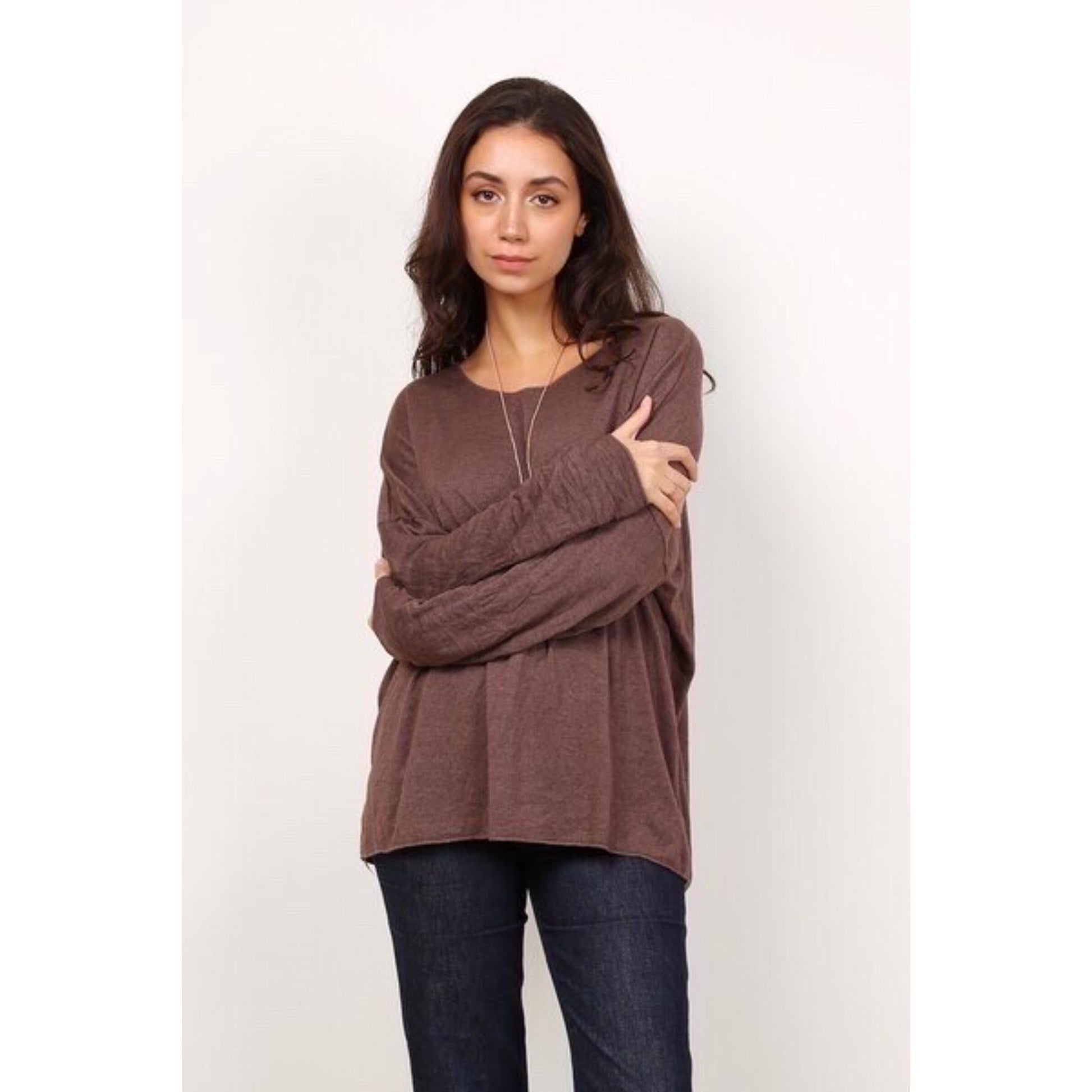Lækker tynd og blød lidt oversize strik med rund hals. Halsudskæringen er meget åben. Den har et lige snit med god plads. Strikken kradser ikke selvom der er uld i. Kanterne er rå med en syet kant, hvor man kan se tråden.