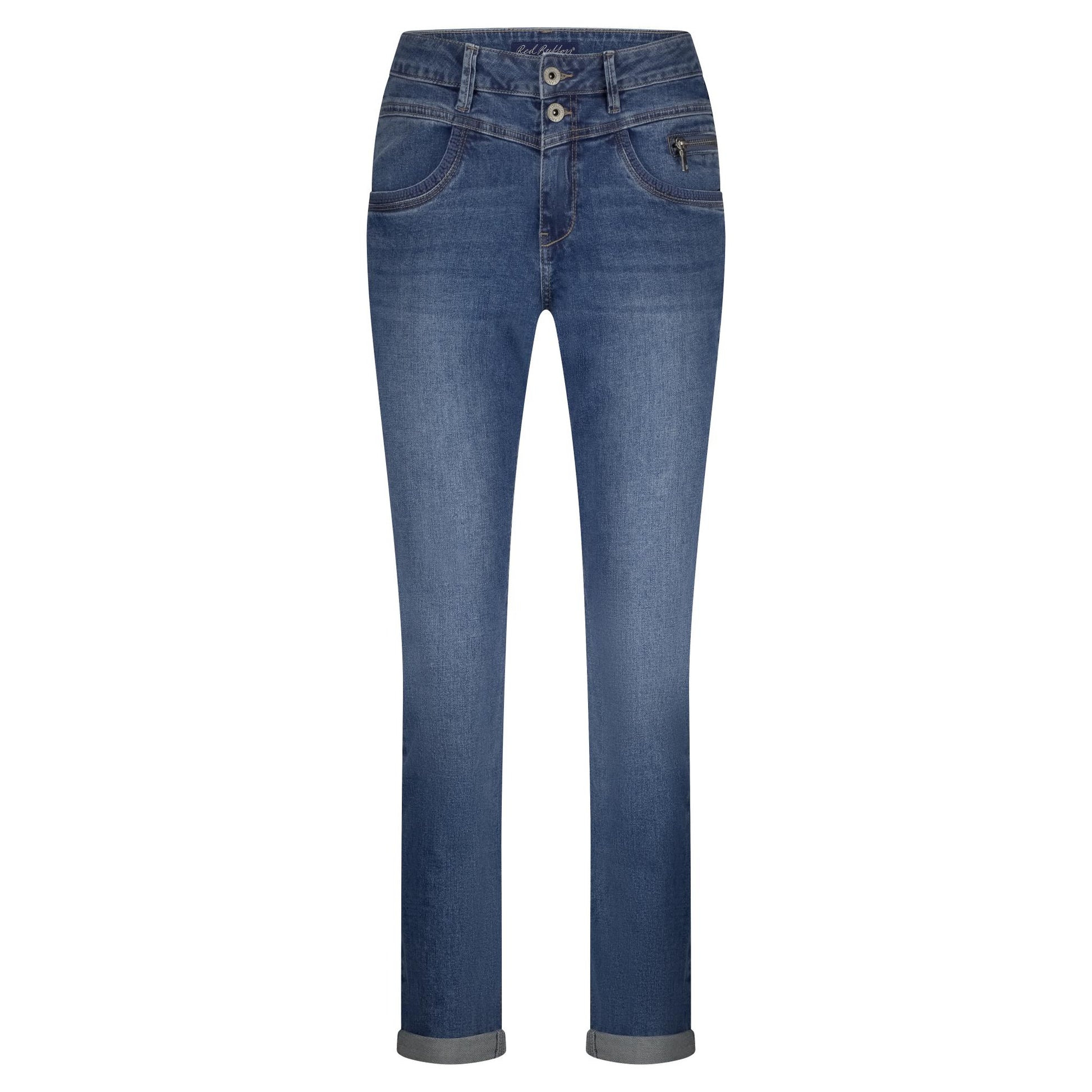 Lækker blød jeans med høj talje. Buksen går ikke ind i taljen, den er mere lige. Det samme er den i benet. (Lige ben) Buksen har to knapper i taljen som detalje. Ved lommerne har den en farvet syning som detalje. Red Button laver bløde jeans, der er skønne at have på fra 1. dag.