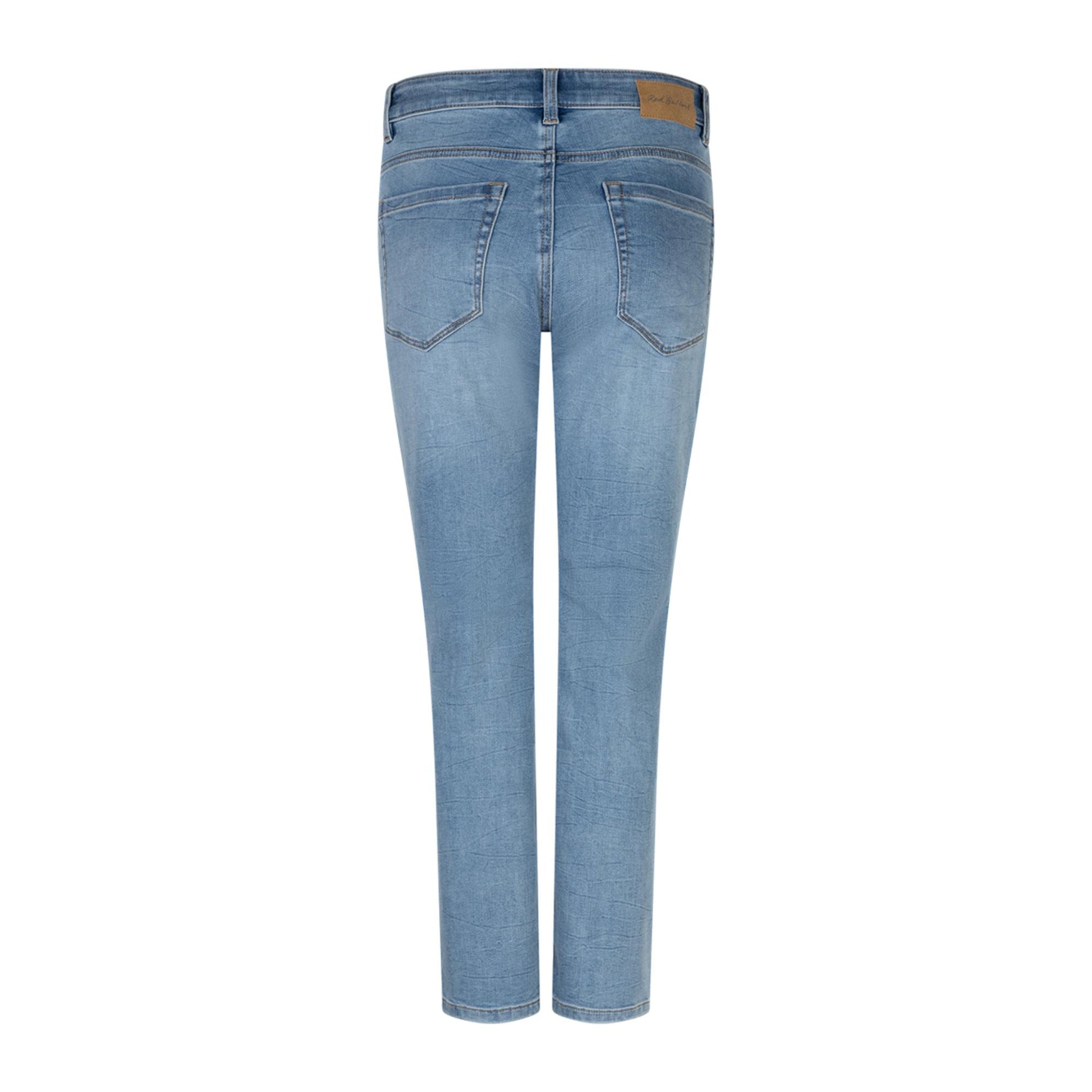 Ankellang jeans med høj talje. Buksen har syninger ved lommerne. Den har smalle ben. Red Button er meget bløde før man bruger dem, derfor bliver de også større ved brug. Svinger man mellem to størrelser, skal man tage den mindste.